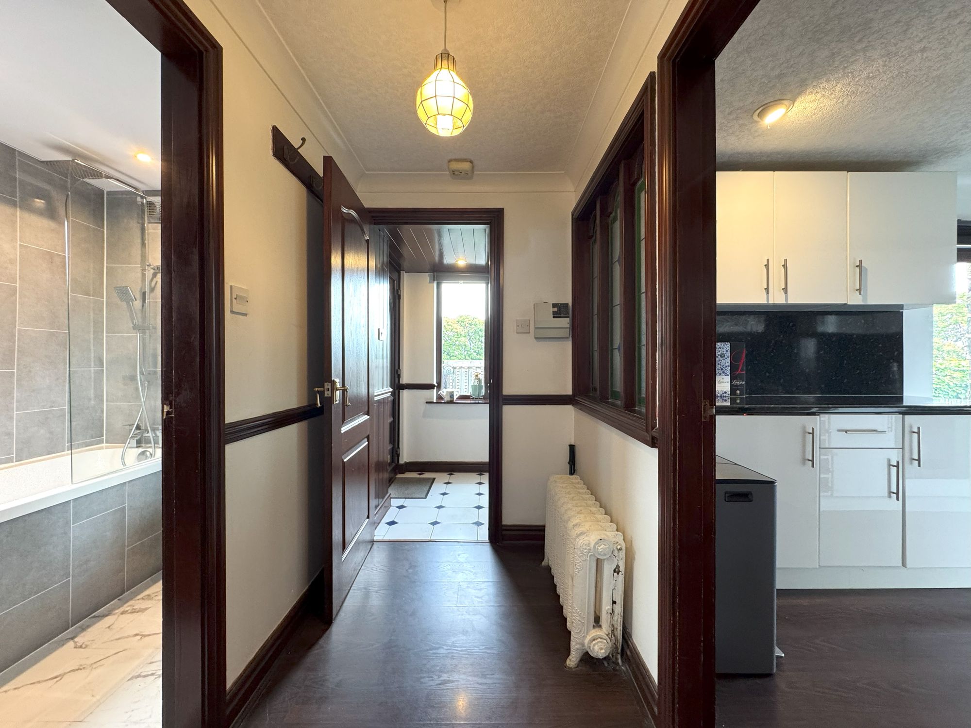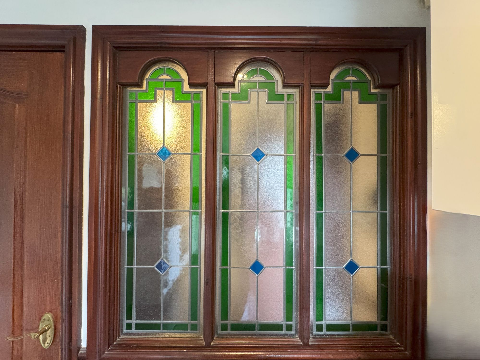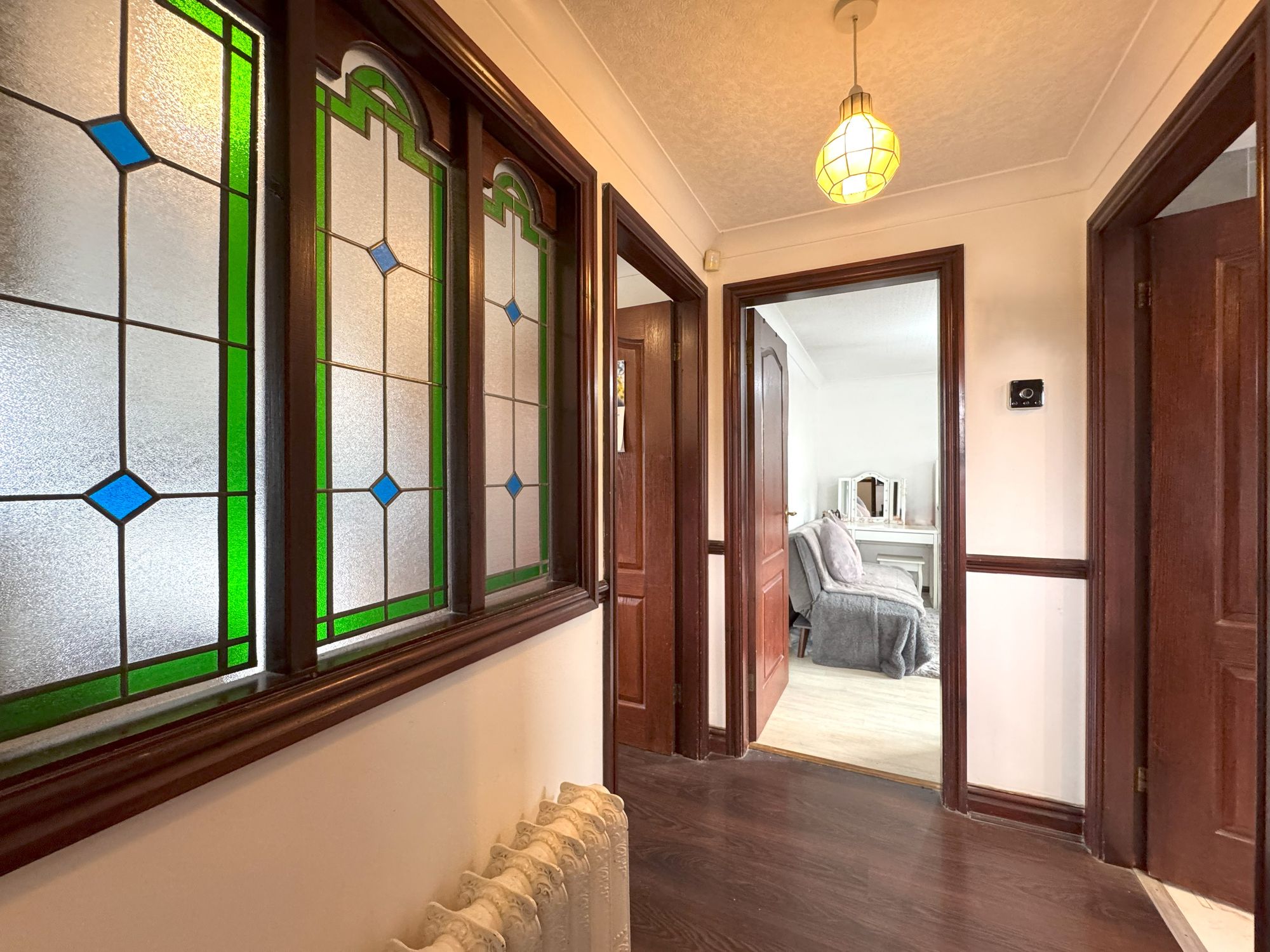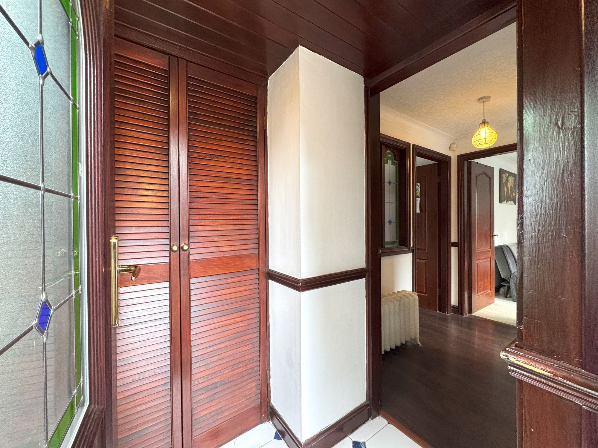 This welcoming entrance porch features a charming mix of classic and practical design elements. Natural light filters through the stained-glass panels in the front door and side window, adding character with colourful accents. The porch is finished with rich wood panelling to the ceiling, complementing the deep-toned woodwork. Directly behind the double louvred doors lies a useful storage cupboard with plumbing and space to accommodate a washing machine, neatly tucked away. The porch opens into the main hallway, where wood finishes continue, creating a cohesive and warm transition into the rest of the home.