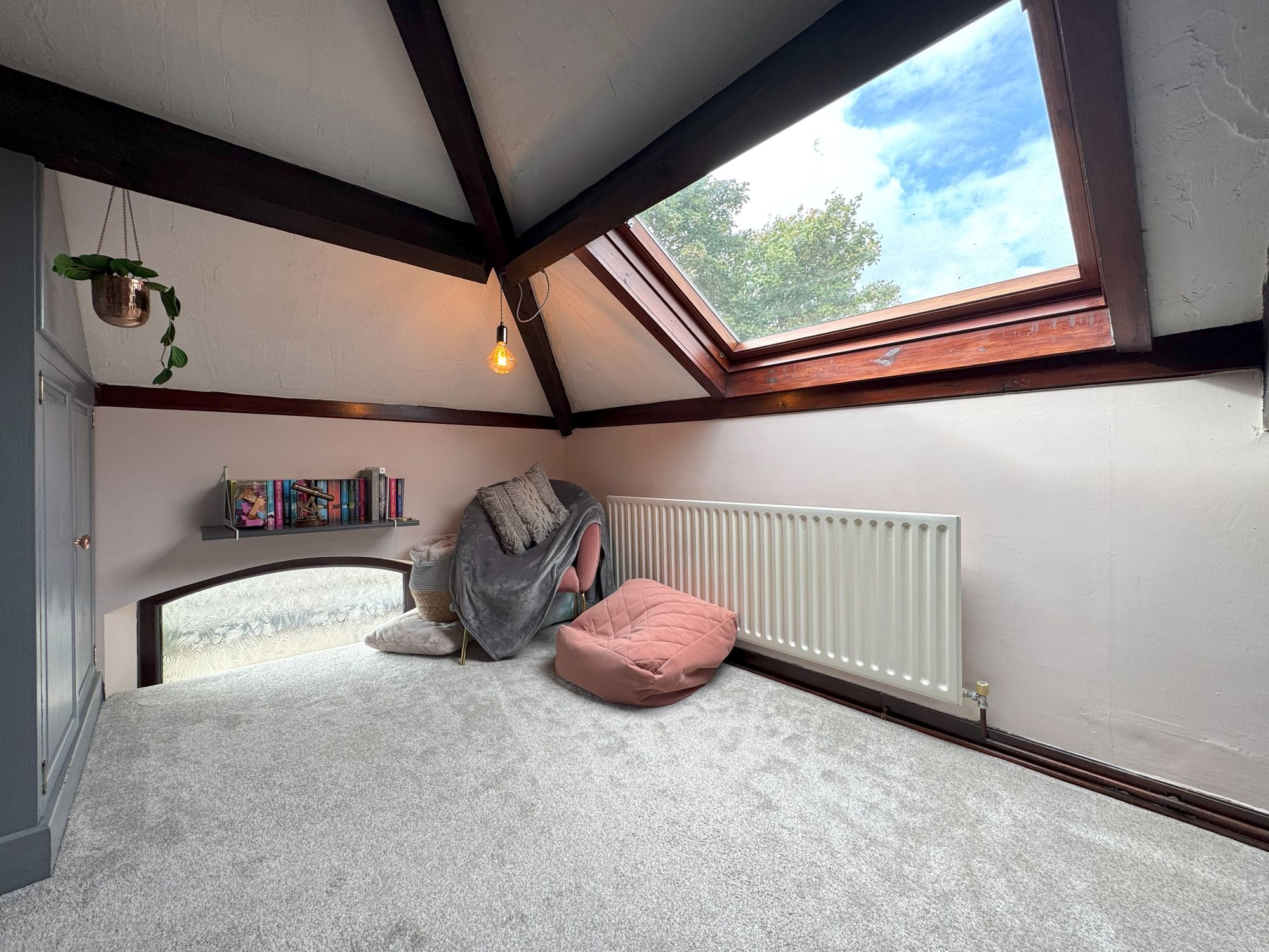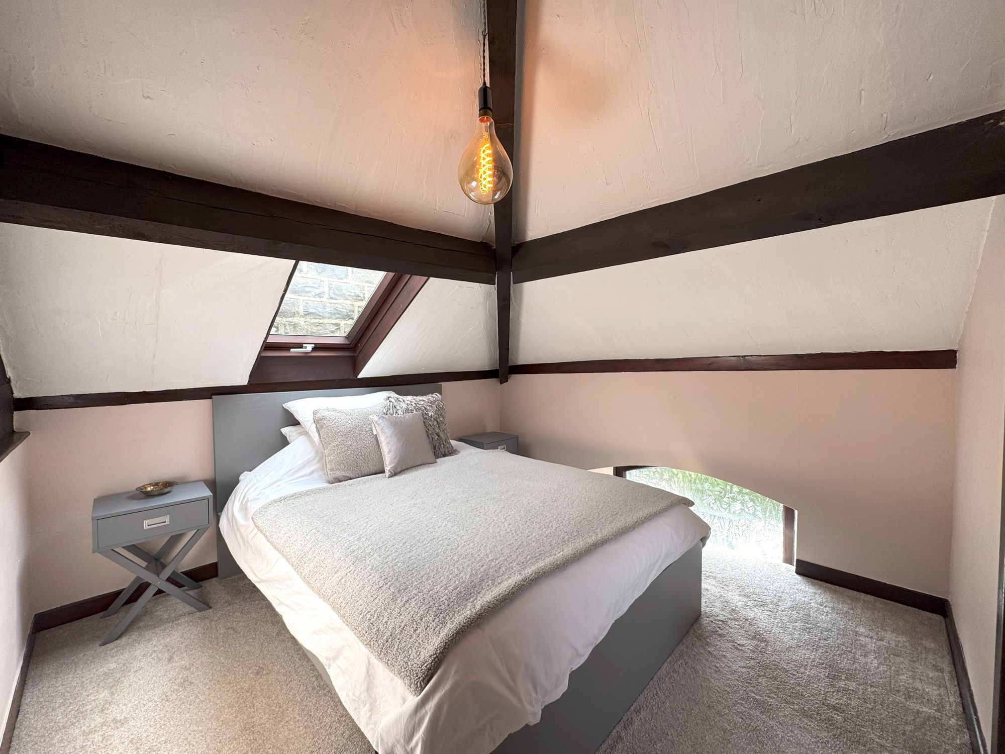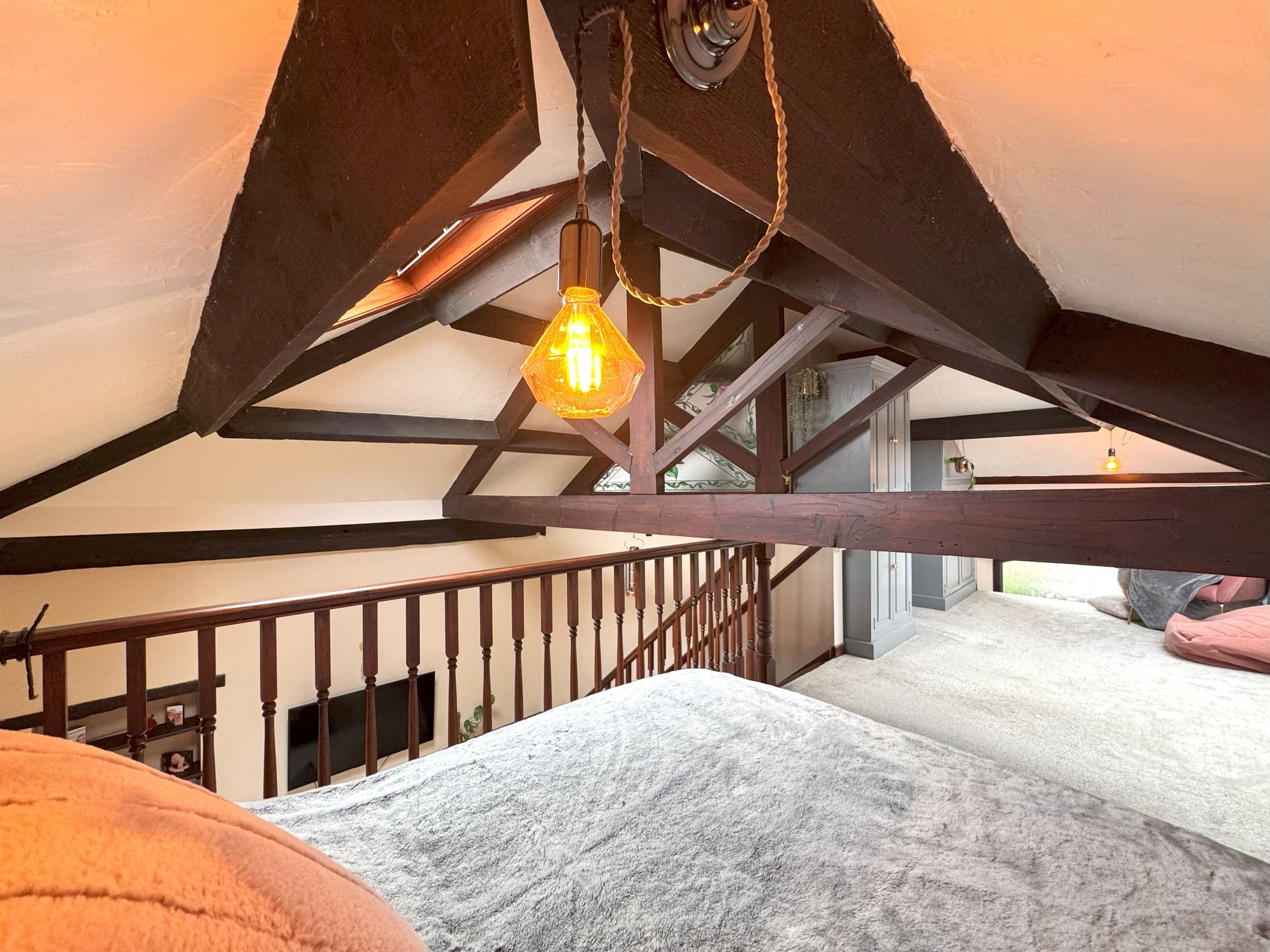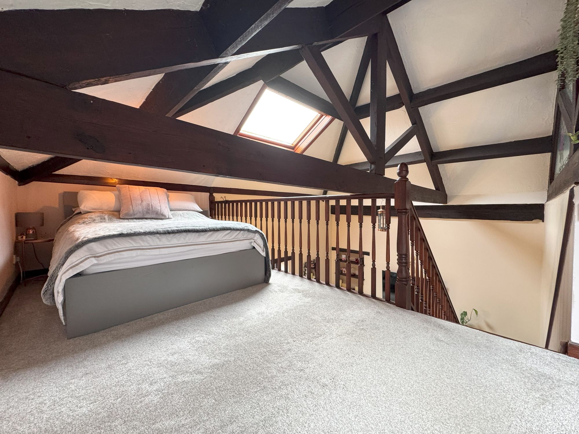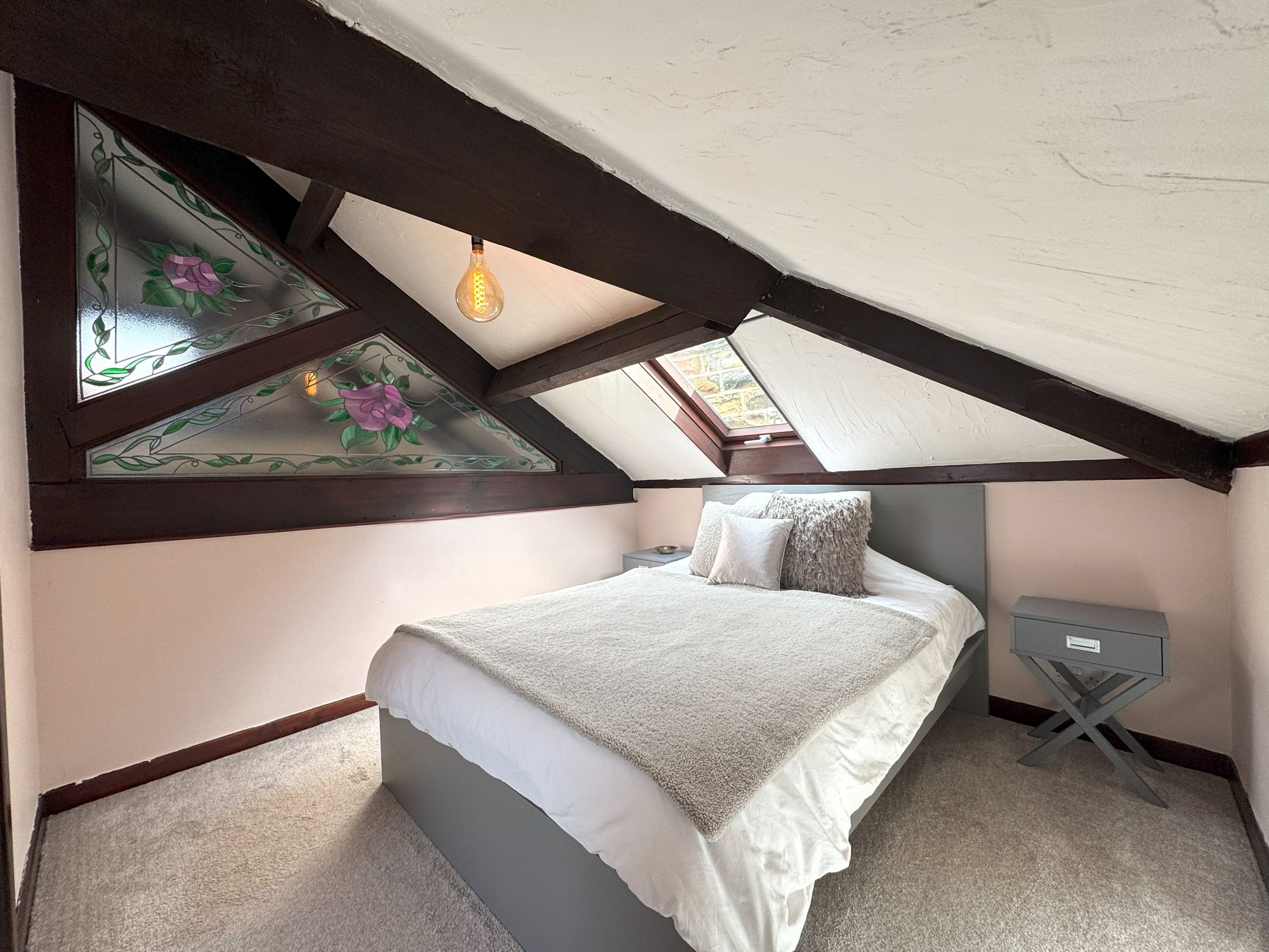 A cosy and characterful double bedroom, beautifully enhanced by exposed beams and striking stained-glass detailing that adds a unique charm to the space. A skylight window allows natural light to pour in, creating a bright and welcoming atmosphere. The room is well-proportioned and comfortably fits a double bed with additional furniture, while soft carpeting and neutral decor provide a calm and relaxing environment.