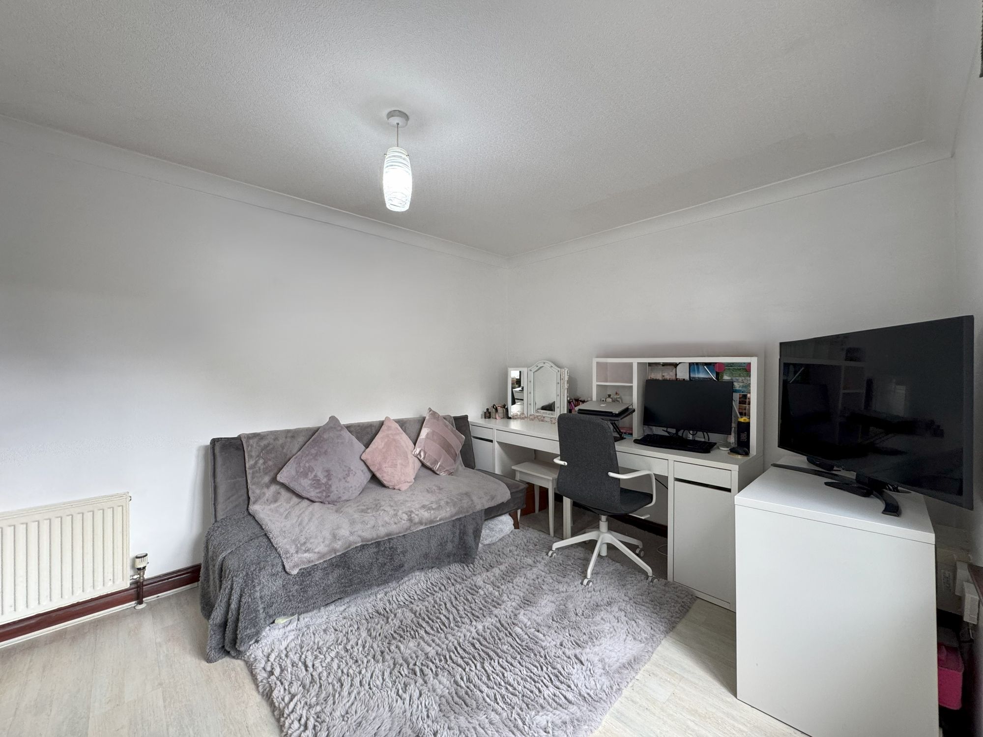 This generously sized room is currently arranged as a home office/study, making it ideal for those working remotely. Neutrally decorated, it offers a bright and versatile space that can easily be adapted to suit individual needs. The room comfortably accommodates a double bed and freestanding furniture for storage. A large window ensures plenty of natural light, creating a pleasant and practical environment whether used for work, relaxation or as a bedroom.