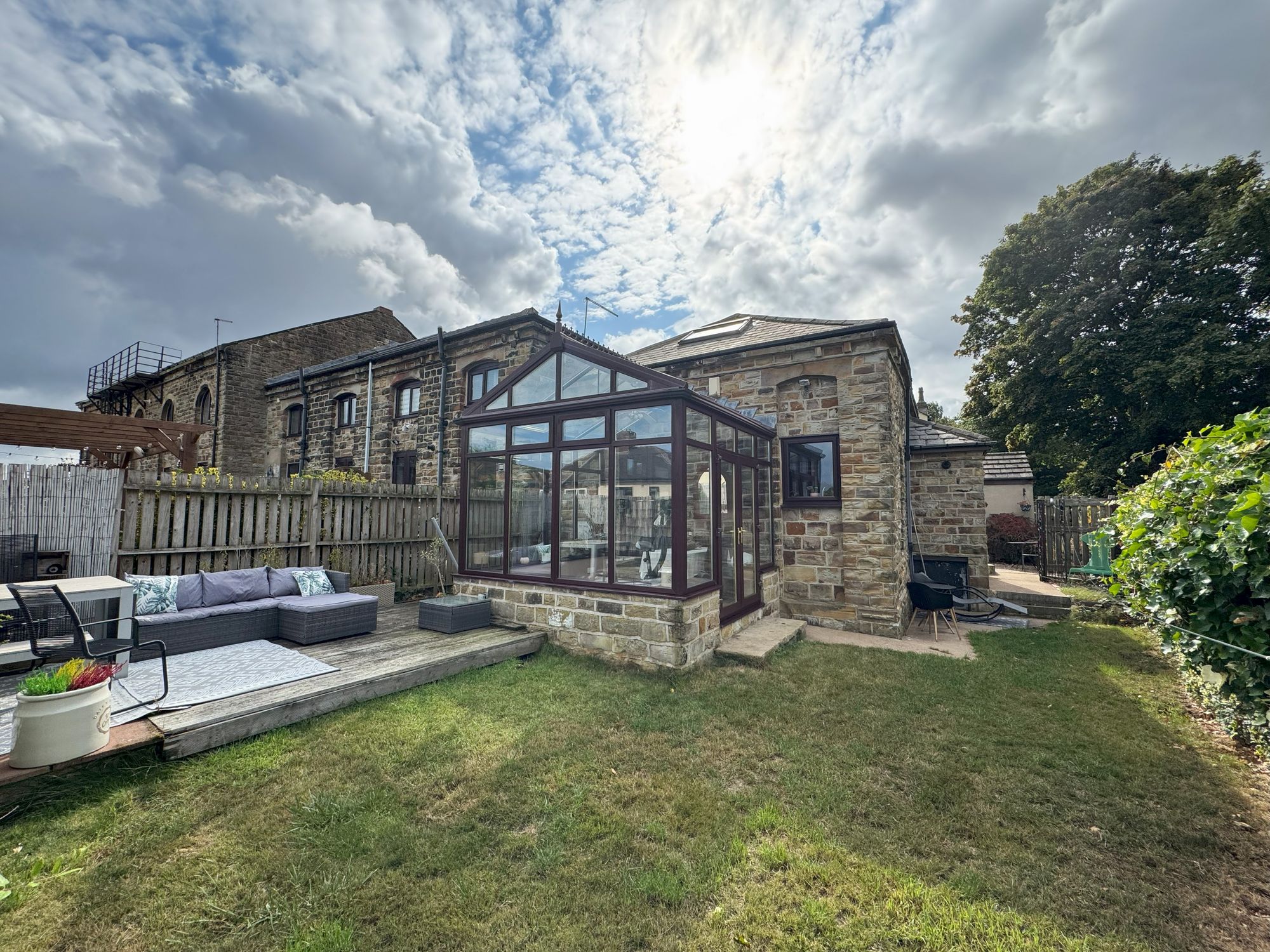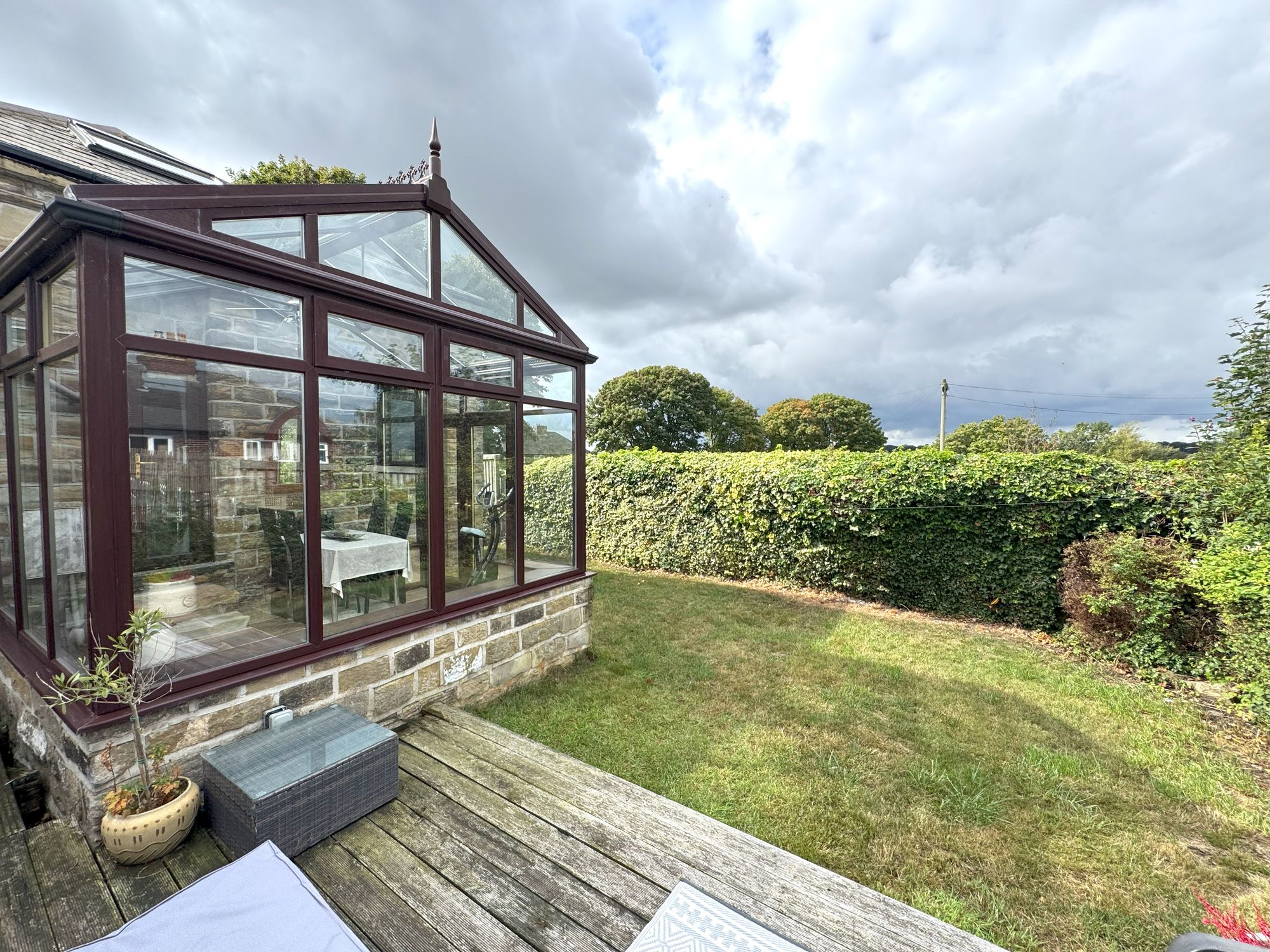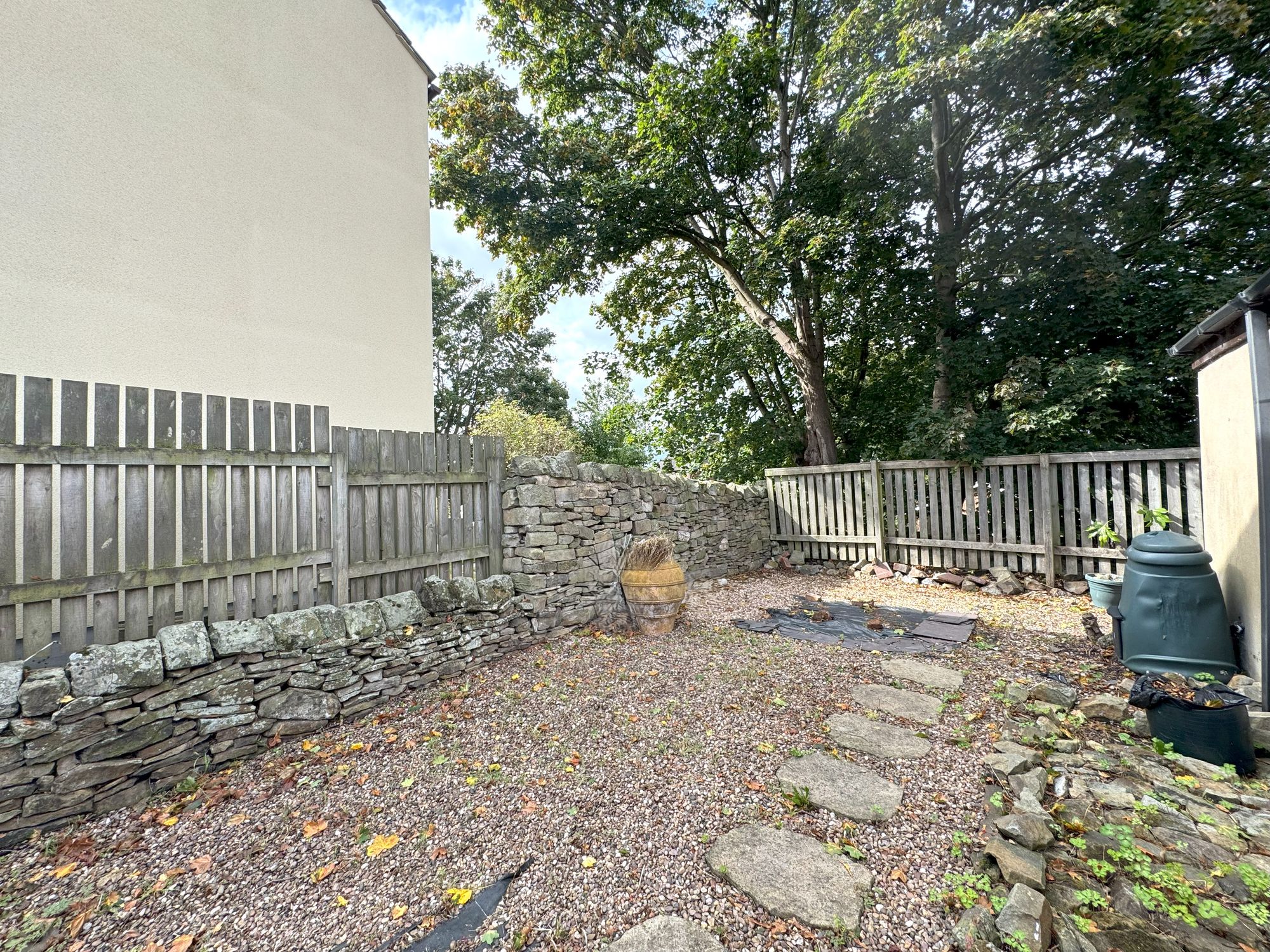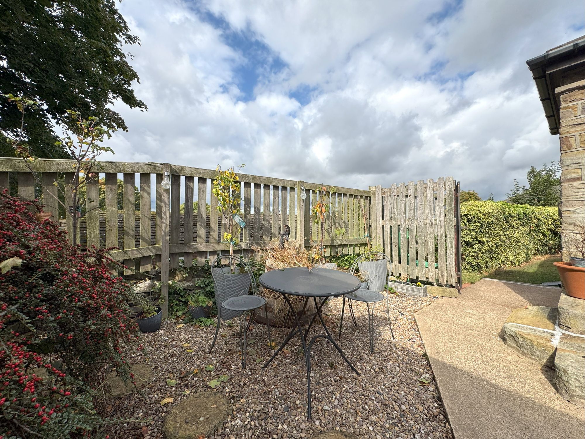 The property boasts a beautifully maintained garden, perfectly designed for both relaxation and entertaining. A striking glass conservatory with double doors opens directly onto a spacious lawn, enclosed by mature hedging for privacy. To the side, a raised decked area provides an ideal outdoor living and dining space, complete with seating and plenty of room for entertaining guests. The garden is a wonderful extension of the home, combining the charm of stone and glass architecture with practical, low-maintenance outdoor areas. Offering a mix of open lawn and a stylish deck, this outdoor space is perfect for families, summer gatherings or simply enjoying the peaceful surroundings. Through the gate, a patio area creates additional seating space. Follow the winding path from this area behind the garage to find an enclosed gravelled area which hosts potential for a variety of uses, and features a mature pond.