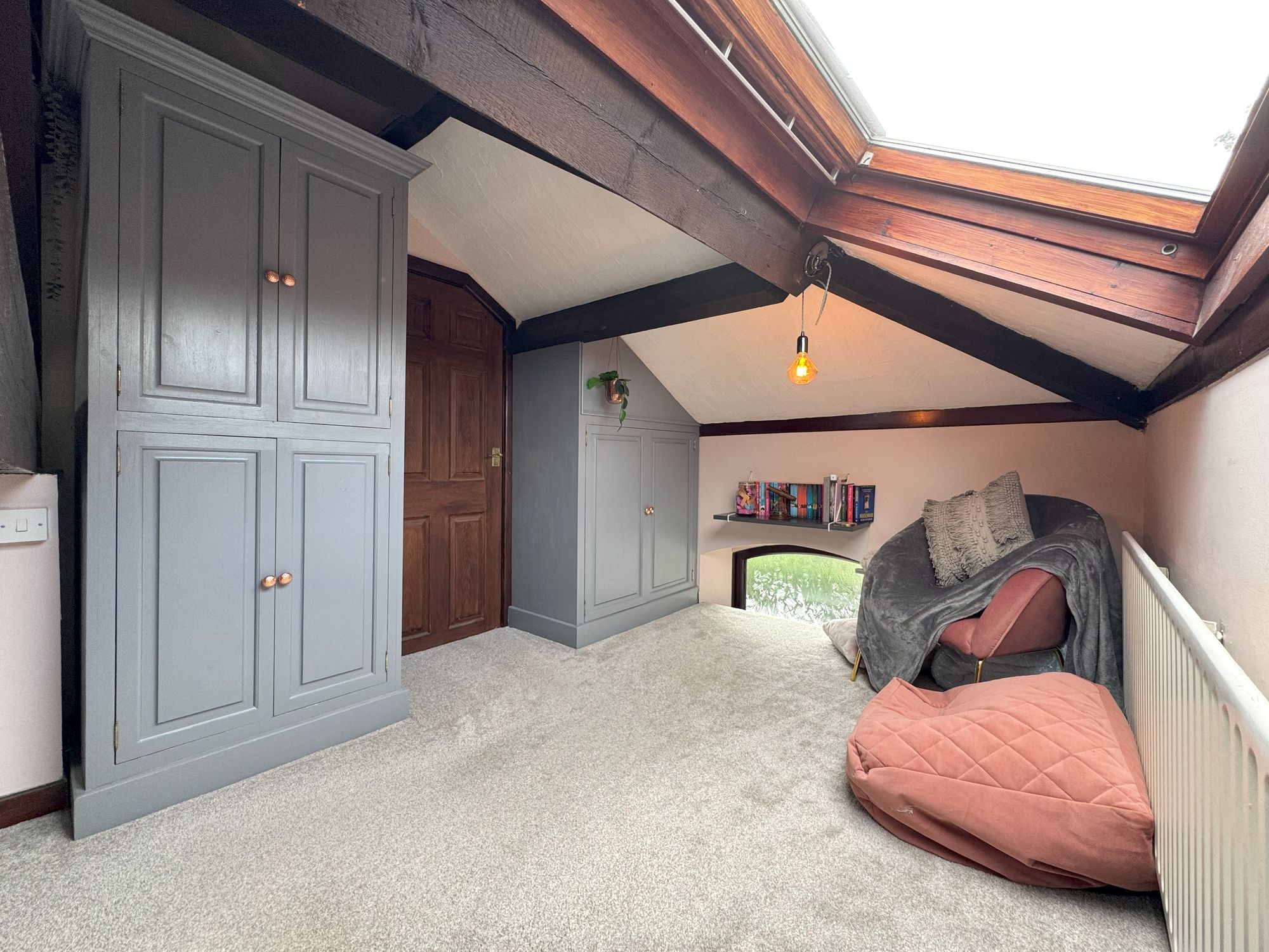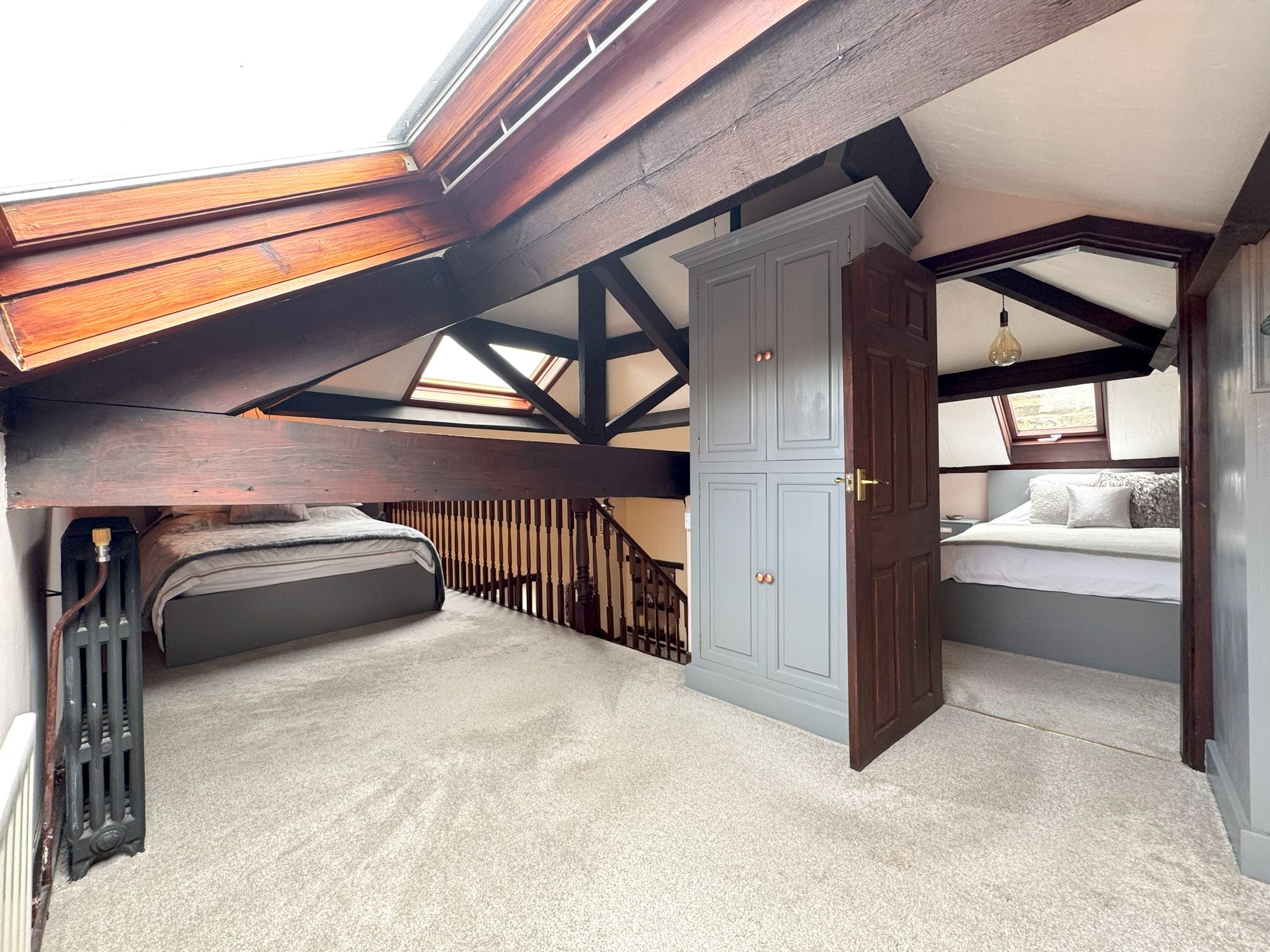 This unique space makes the most of the property’s striking architecture. Exposed beams and vaulted ceilings create a dramatic sense of character, while skylights flood the space with natural light. This space is extremely versatile and could be used for extra family space, as well as a cosy reading or relaxation nook, making it ideal for both rest and quiet retreat. This large mezzanine area spans across both sides of the open staircase creating a truly versatile area with an open and airy feel.
