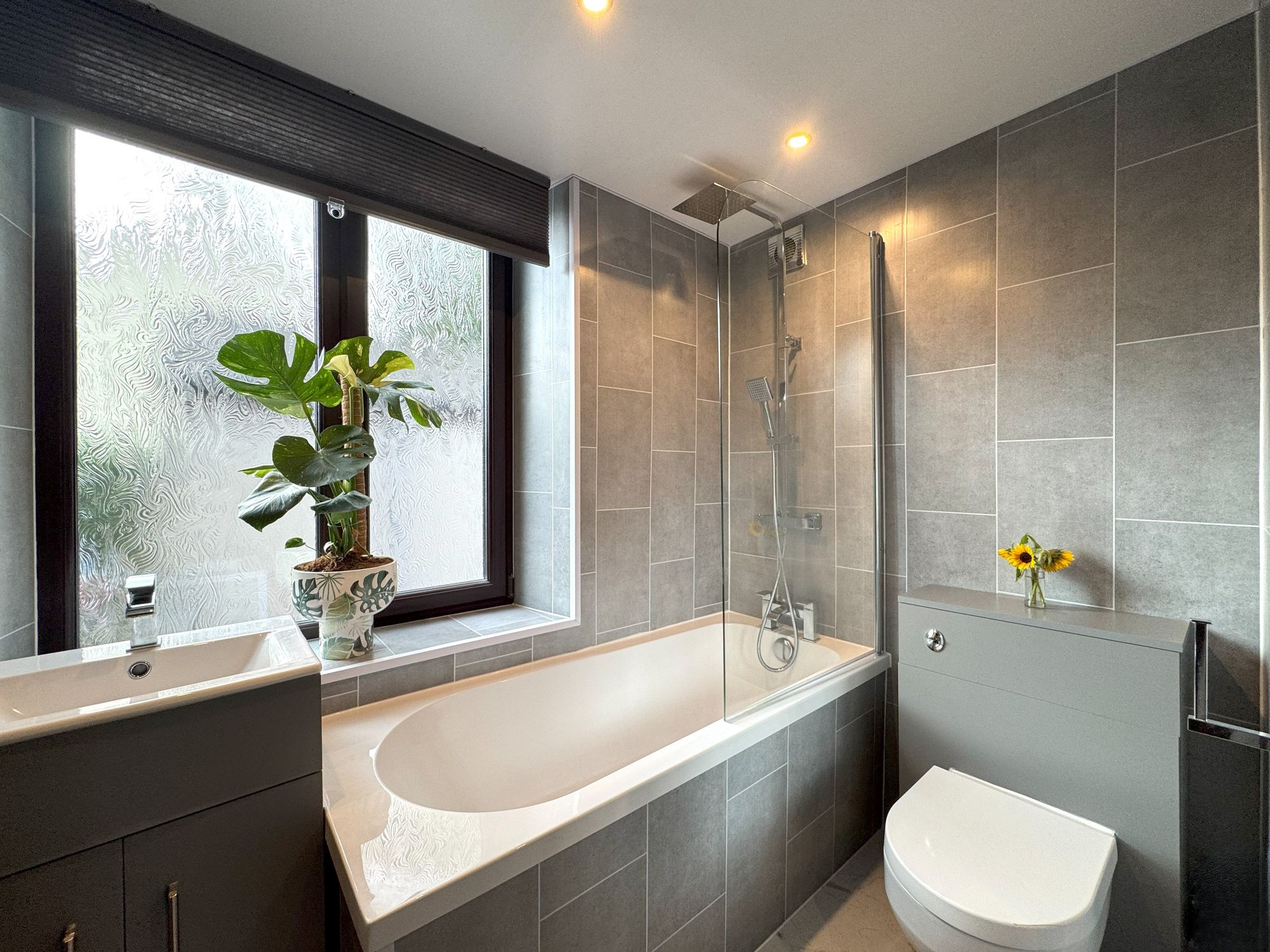 Finished to a high standard, this contemporary bathroom offers both practicality and luxury. Featuring a sleek grey design with contrasting white fittings, it benefits from a full-sized bathtub with overhead rainfall shower and glass screen, combining convenience with relaxation. The room is thoughtfully designed with a modern vanity unit and integrated WC. A large frosted window allows in plenty of natural light, enhancing the bright and airy feel, while spotlights create a warm and inviting ambience. Perfectly blending modern style with functionality, this bathroom is an elegant and comfortable space for everyday living.