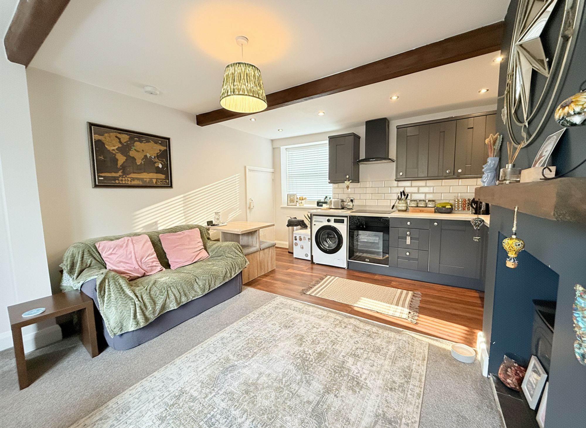 A spacious open-plan living room and kitchen, beautifully decorated in bold accent tones complemented by neutral walls and carpeting. The kitchen area features wood-effect flooring and striking shaker-style units with contrasting worktops. Integrated appliances include an electric oven with a four-ring induction hob, with additional space for a washing machine and an under-counter fridge. There is ample room for a small dining table and seating area. Character features include exposed wooden beams and a grand chimney breast with a coal-effect fire, creating a charming focal point. The room also provides access to the cellar.