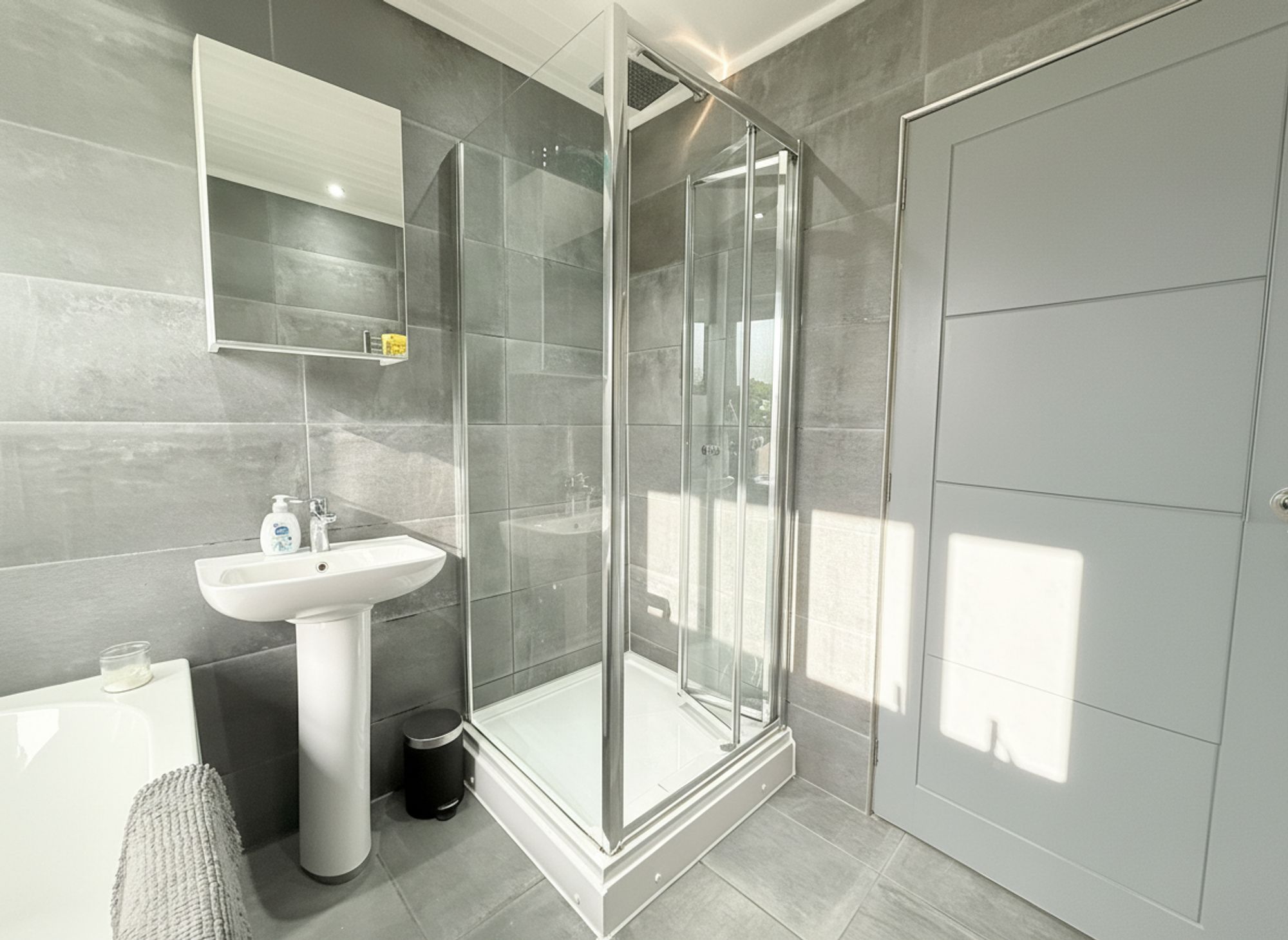 Situated at the front of the property, this sleek and modern bathroom comprises a full-sized bath with chrome mixer tap and handheld shower attachment, a pedestal sink with chrome mixer tap, a chrome heated towel rail, and a rainfall shower. The space is finished with stylish neutral tiling to both the walls and floor.