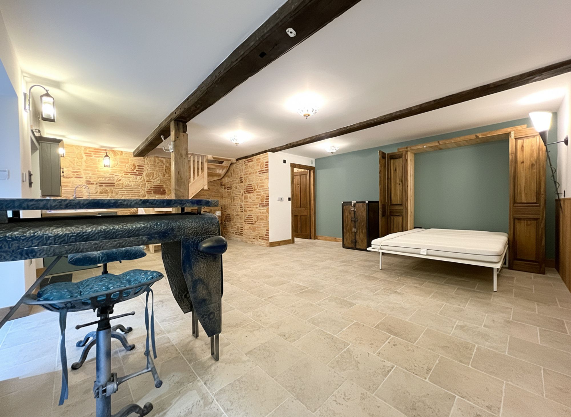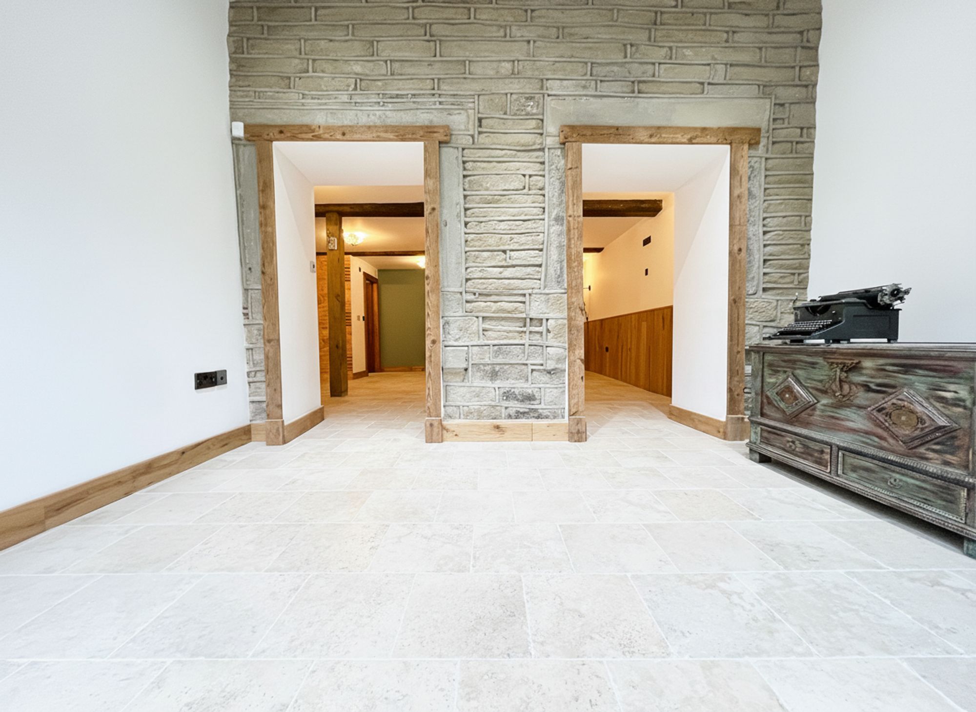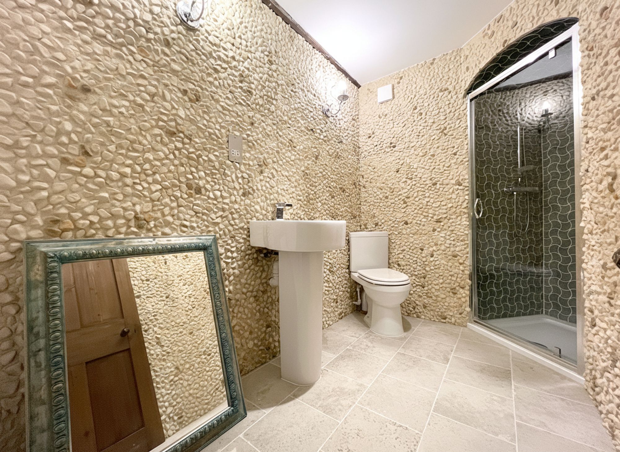 Fully renovated to an exceptional standard, the lower ground floor benefits from marble flooring and underfloor heating throughout and offers a stylish and flexible living space. The area incorporates a utility section with sink and mixer tap, plumbing for a washing machine, and chic contemporary units complemented by wood-effect work surfaces. A wonderful design and striking feature cabinet cleverly conceals a pull-down bed, allowing the space to be effortlessly transformed and making it ideal for guest accommodation or multi-functional living. A spa-inspired shower room, also enjoying a continuation of the underfloor heating, finished with unique pebble-effect walling. The room is fitted with a wash basin and WC, alongside a walk-in arched shower enclosure with stylish feature tiling, creating a calming and luxurious space.