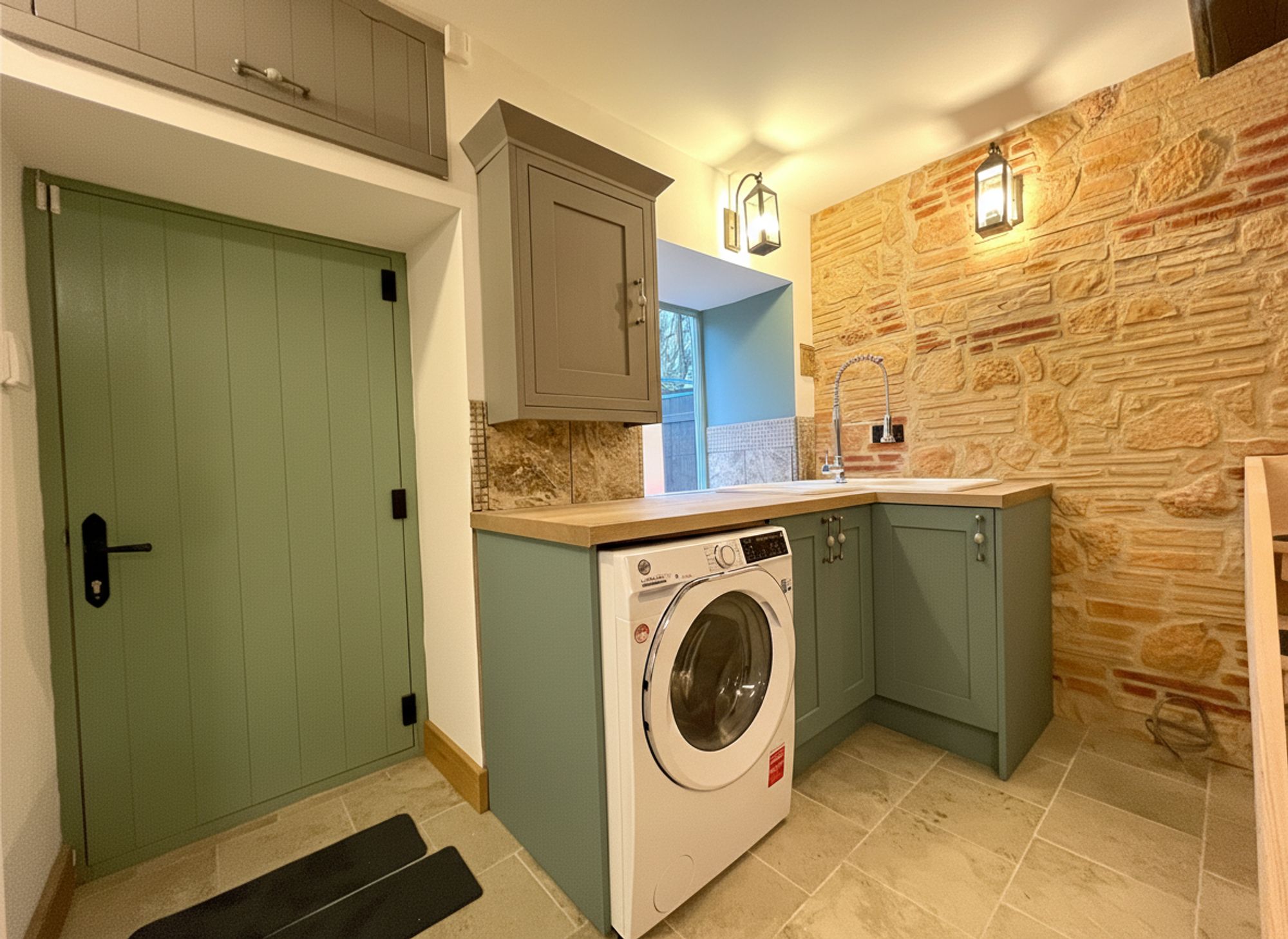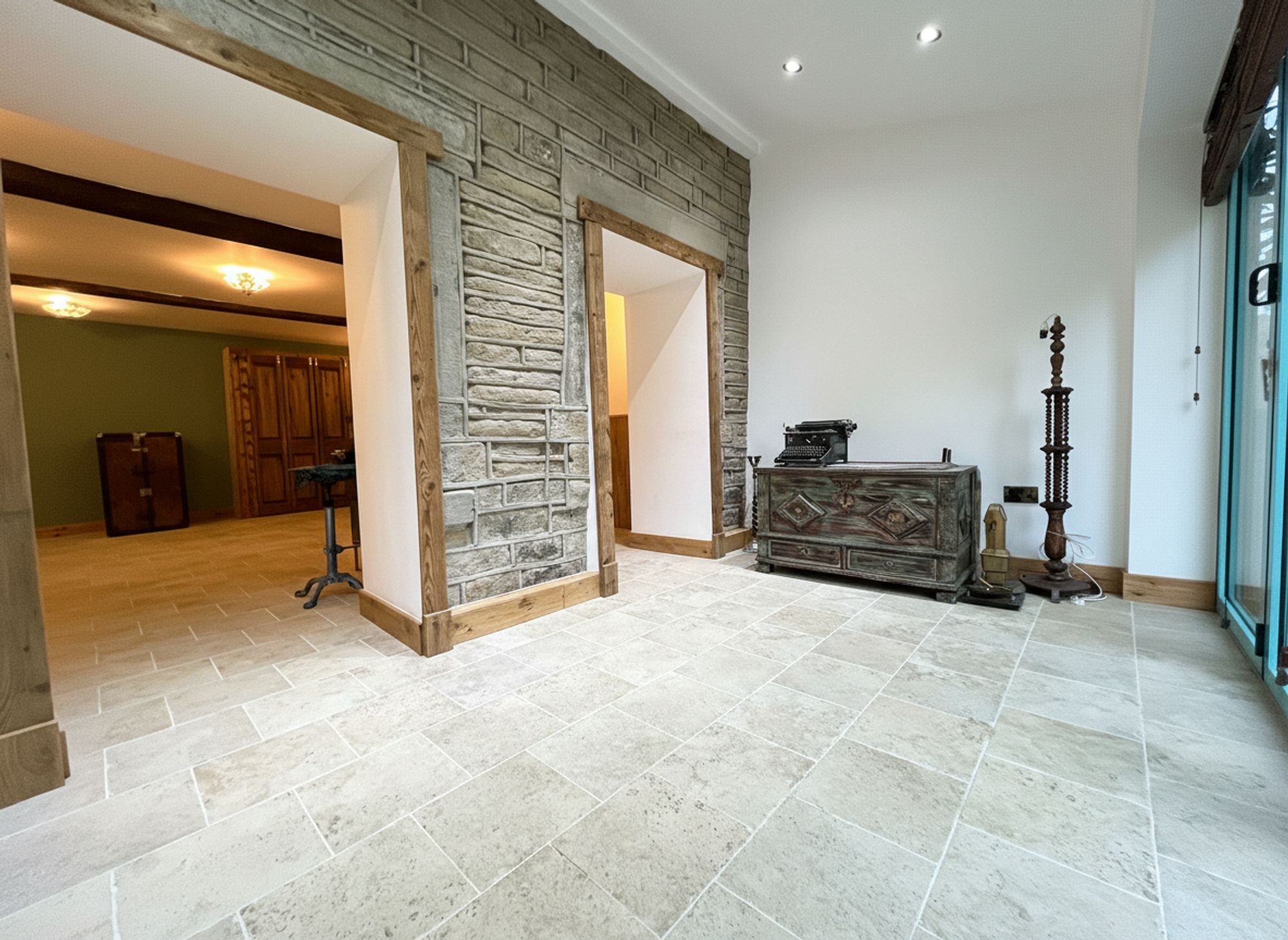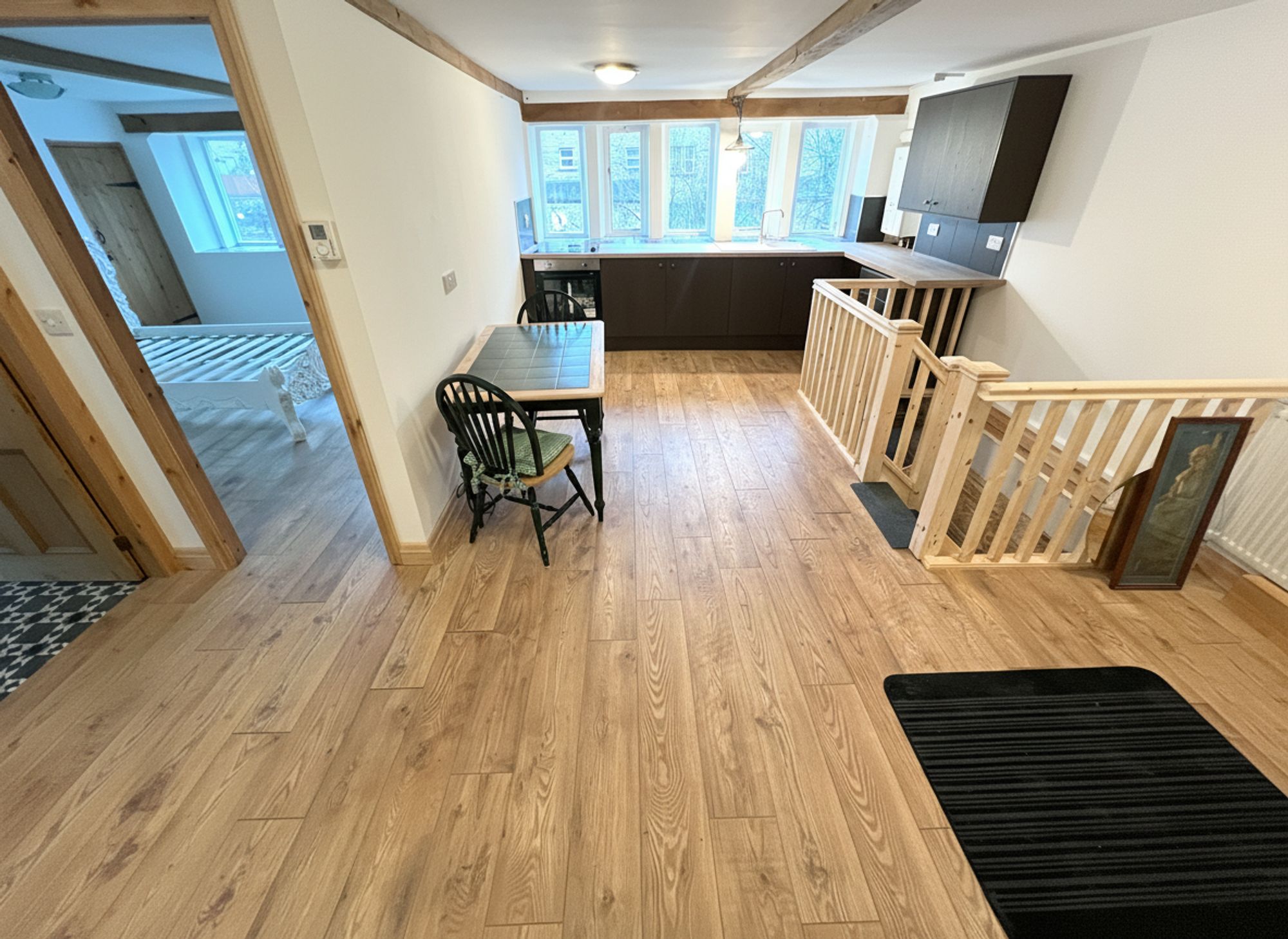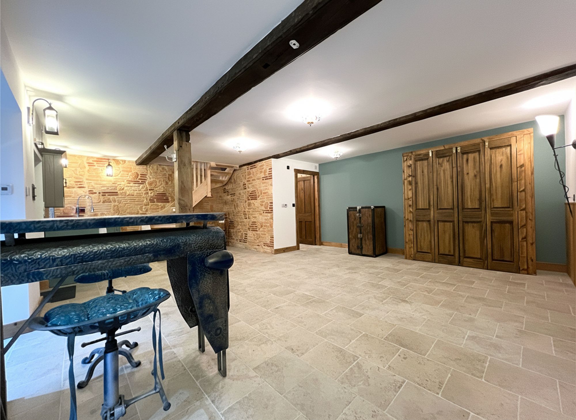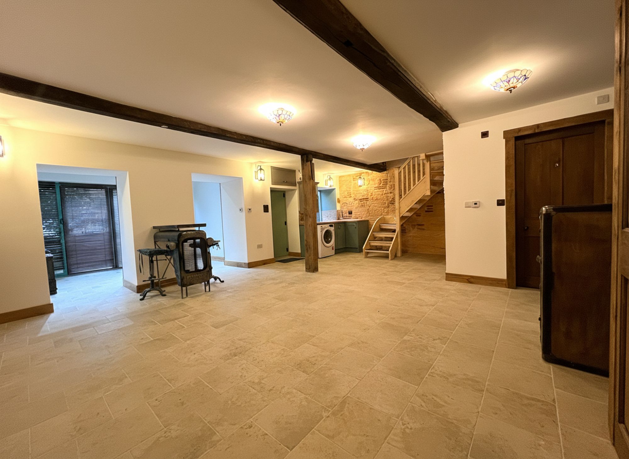A beautifully appointed living dining kitchen, flooded with natural light courtesy of an abundance of picture perfect mullion windows which frame picturesque views across the garden and the river beyond, creating a wonderfully tranquil atmosphere. The kitchen is fitted with a range of brand-new integrated appliances, including an electric oven, four-ring electric hob, fridge with freezer compartment, a quartz sink with mixer tap, and plumbing in place for a dishwasher. Stylish and contemporary cabinetry is complemented by wood-effect work surfaces, seamlessly tying the overall aesthetic together. There is ample space for a family-sized dining suite as well as space for a variety of lounge furniture, making this an exceptionally sociable and versatile space.
