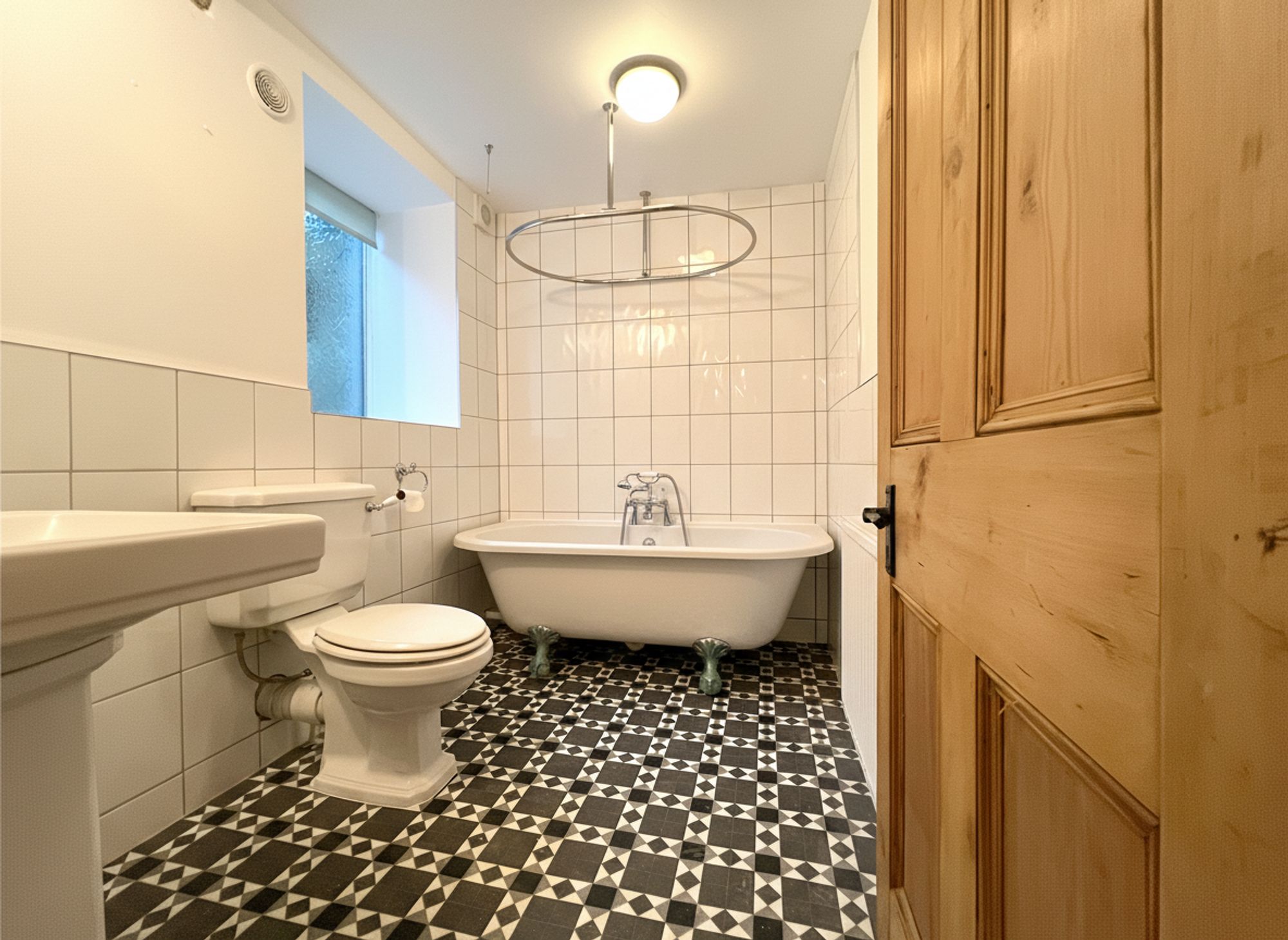 A crisp and contemporary bathroom featuring a Victorian-style roll-top claw-foot bath with shower attachment, complemented by a wash basin and WC. The space is finished with part-tiled white walls and stylish feature lino flooring, creating a clean yet characterful aesthetic that perfectly reflects the charm of the property.