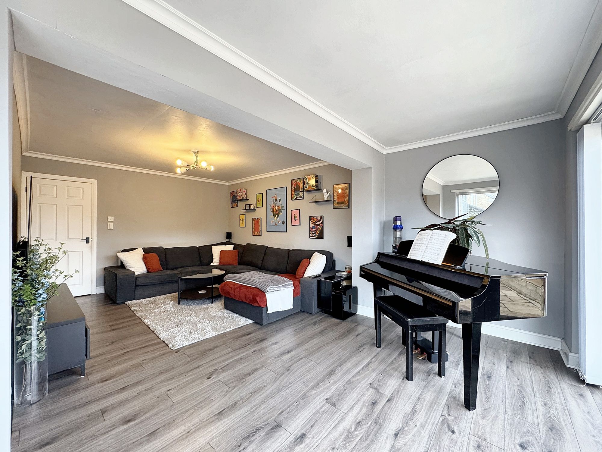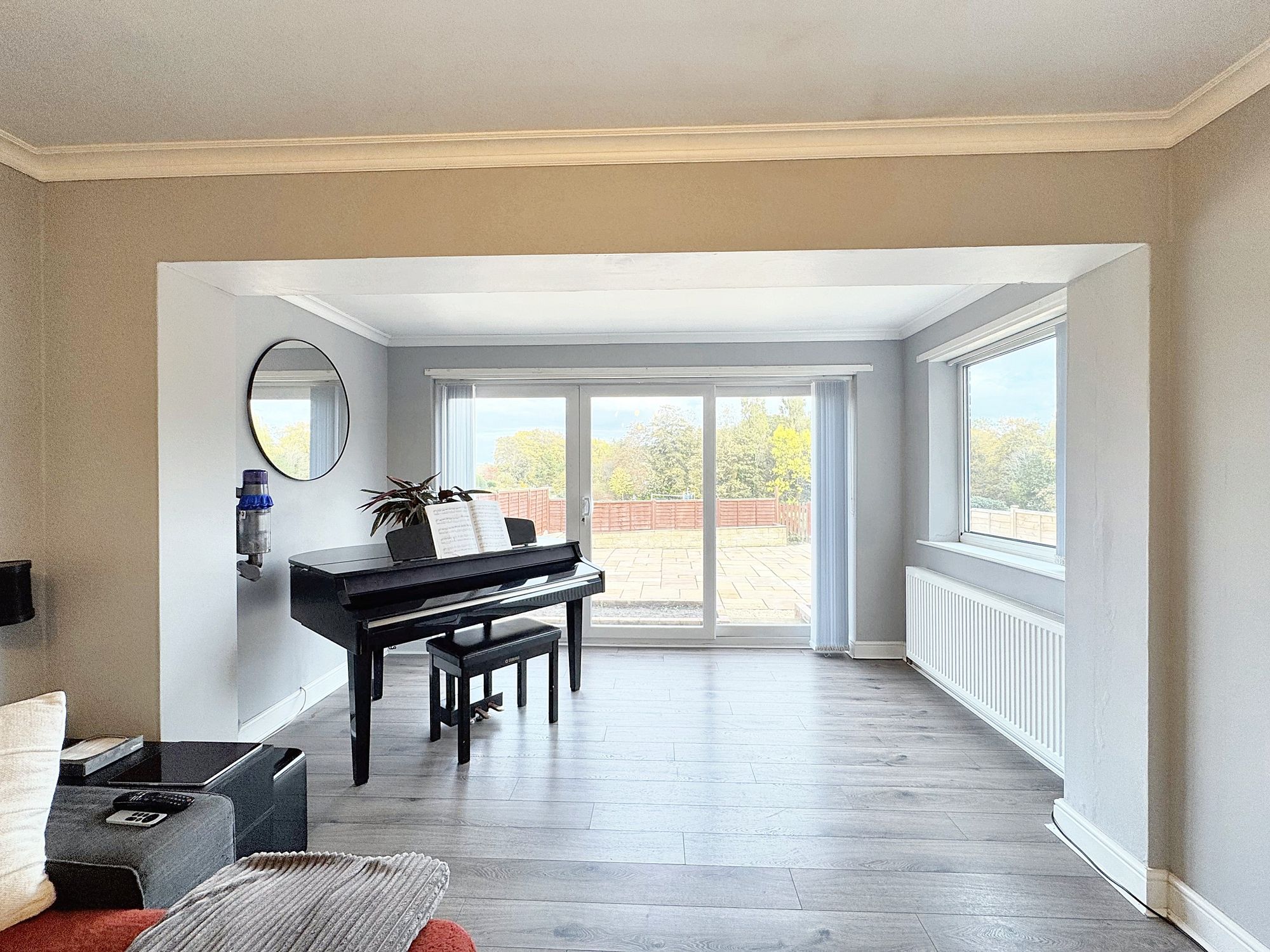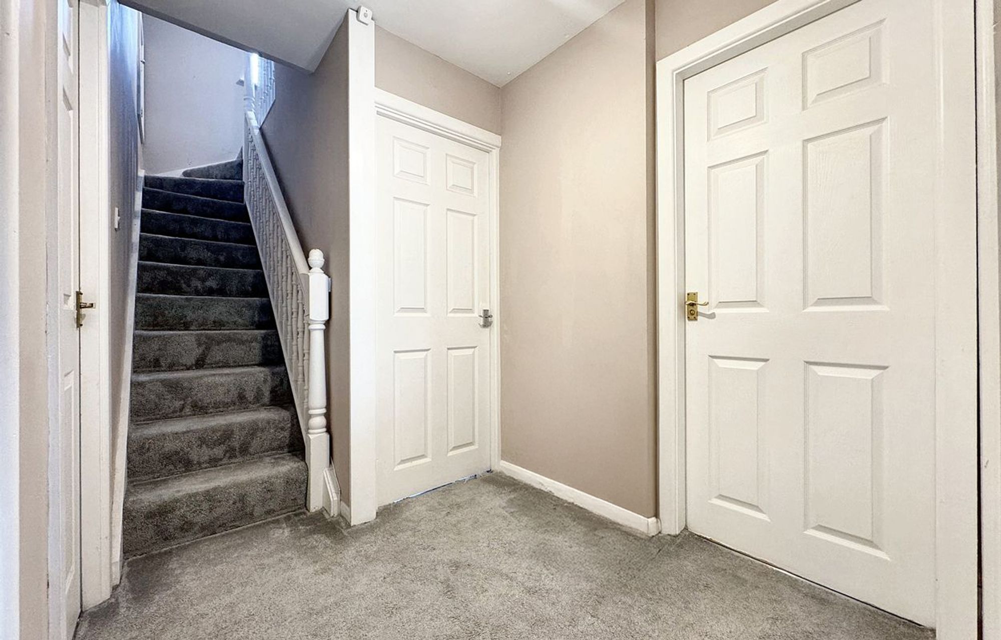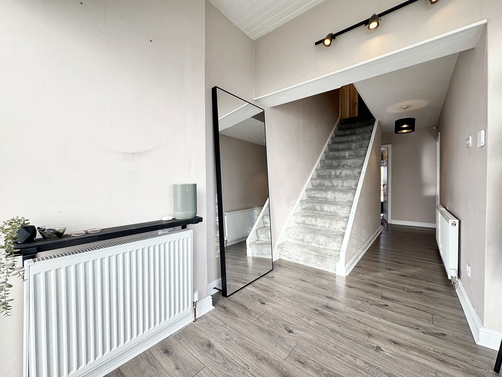 The spacious entrance hall creates a warm and inviting first impression, featuring obscured windows that allow natural light to flow through while maintaining privacy. The wood-effect flooring complements the home’s decor beautifully, adding a touch of style and continuity throughout the property.