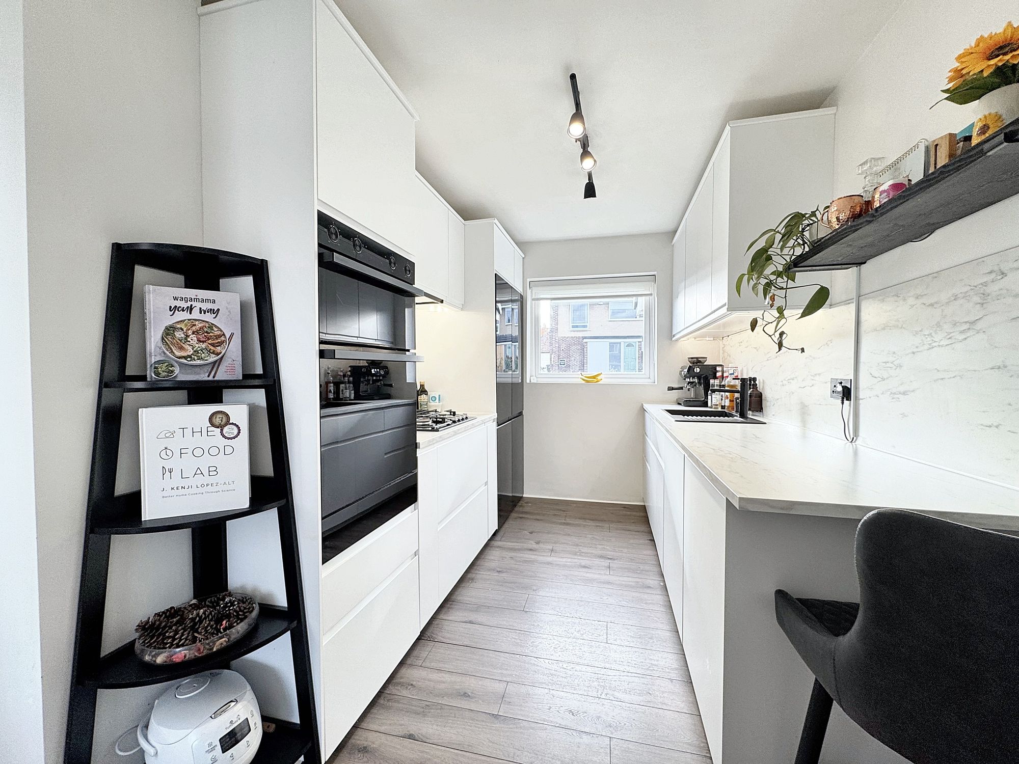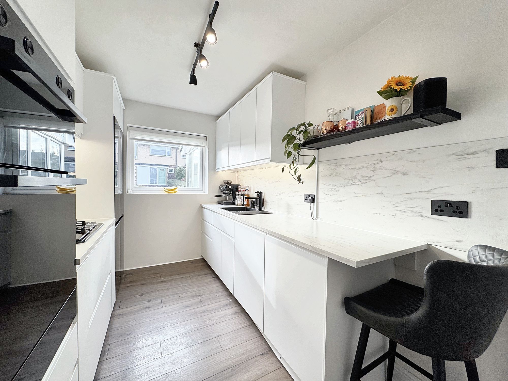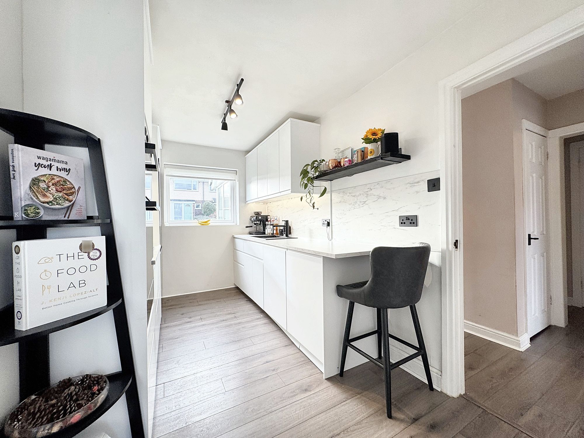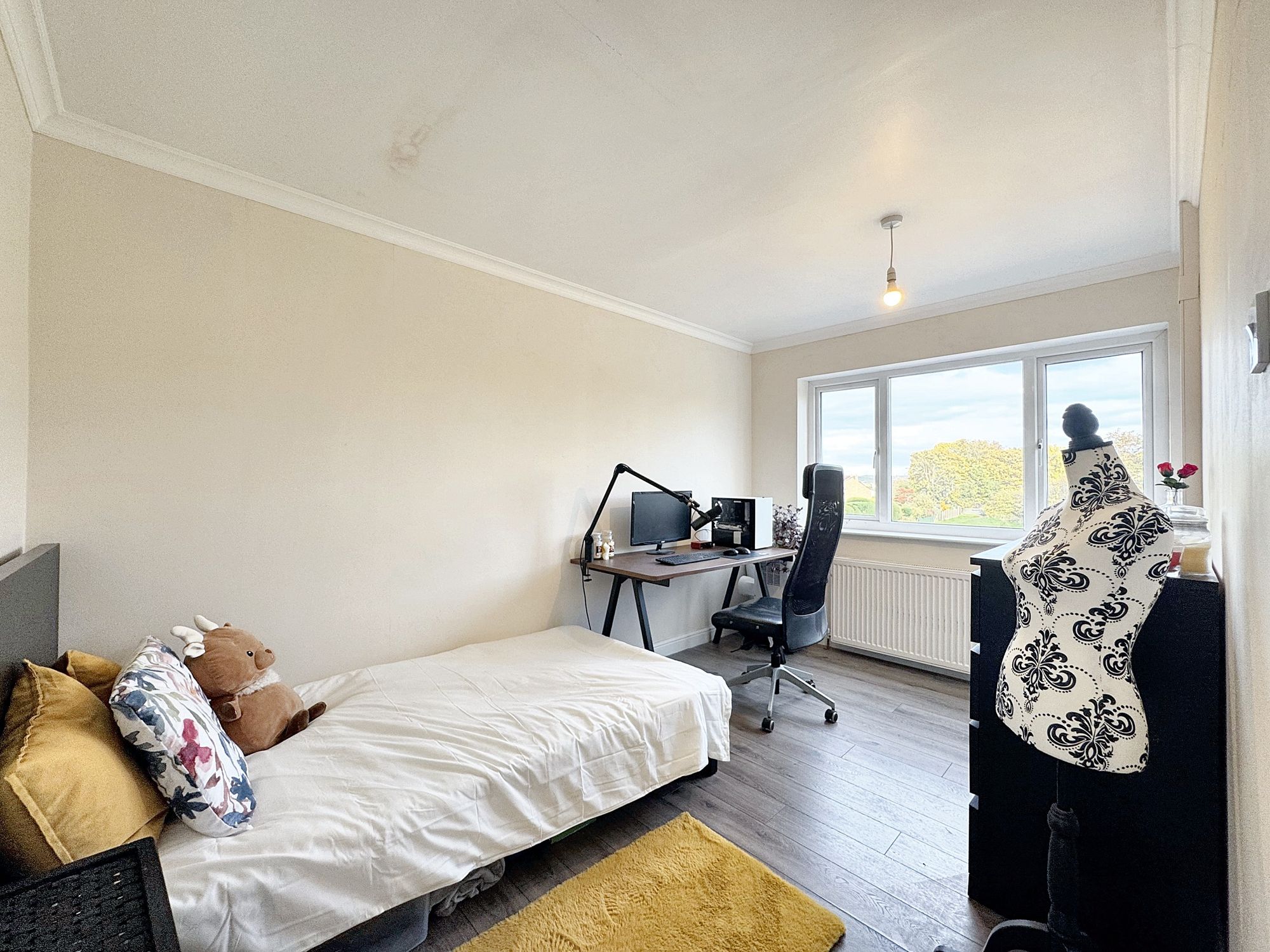 Located at the rear of the property, bedroom 3 is currently arranged as a single room/home office, but offers ample space to accommodate a double bed if desired. The white walls and wood-effect flooring provide a fresh, neutral backdrop, while spacious built-in storage cleverly conceals the boiler, maintaining a neat and uncluttered look.