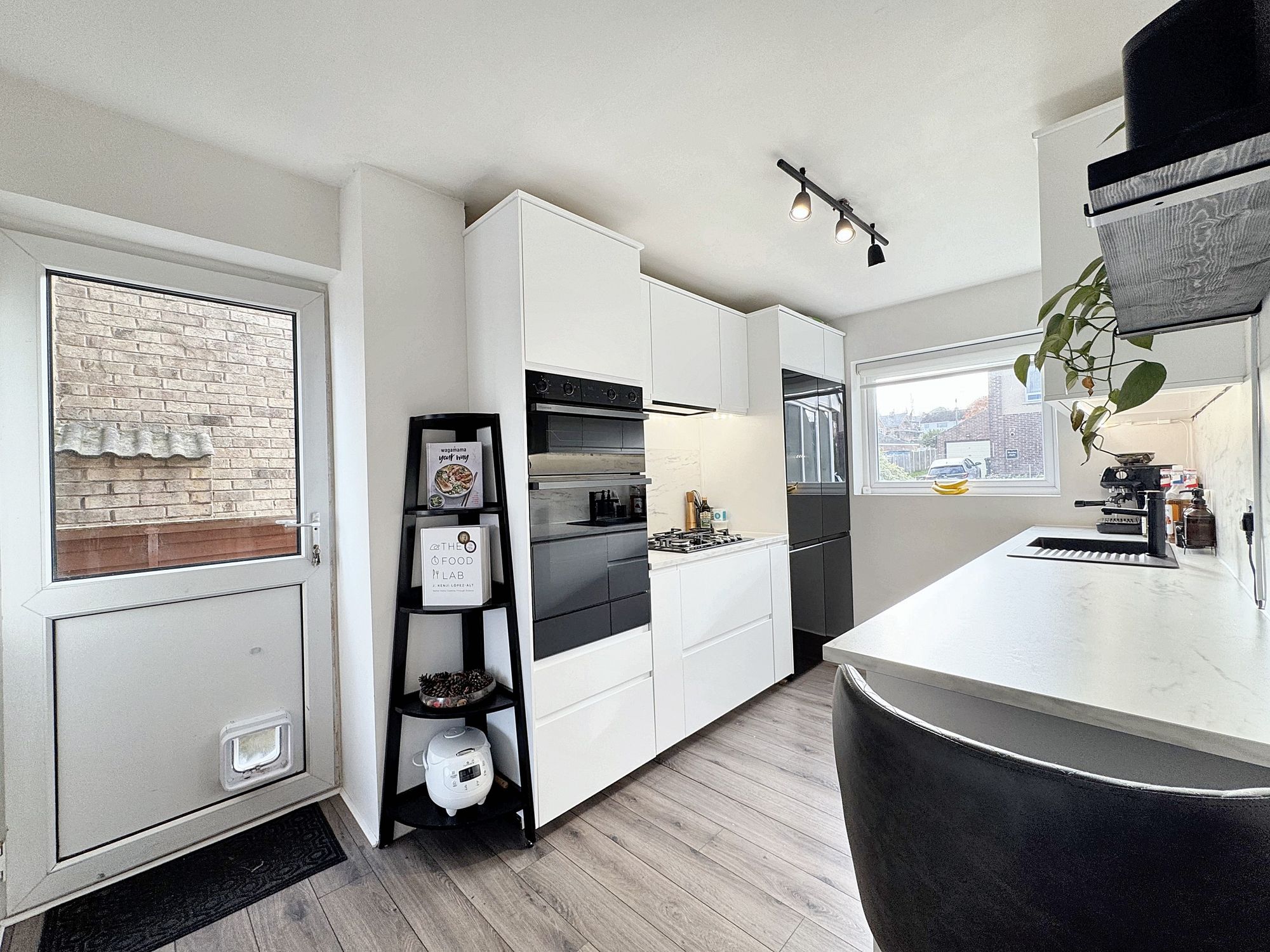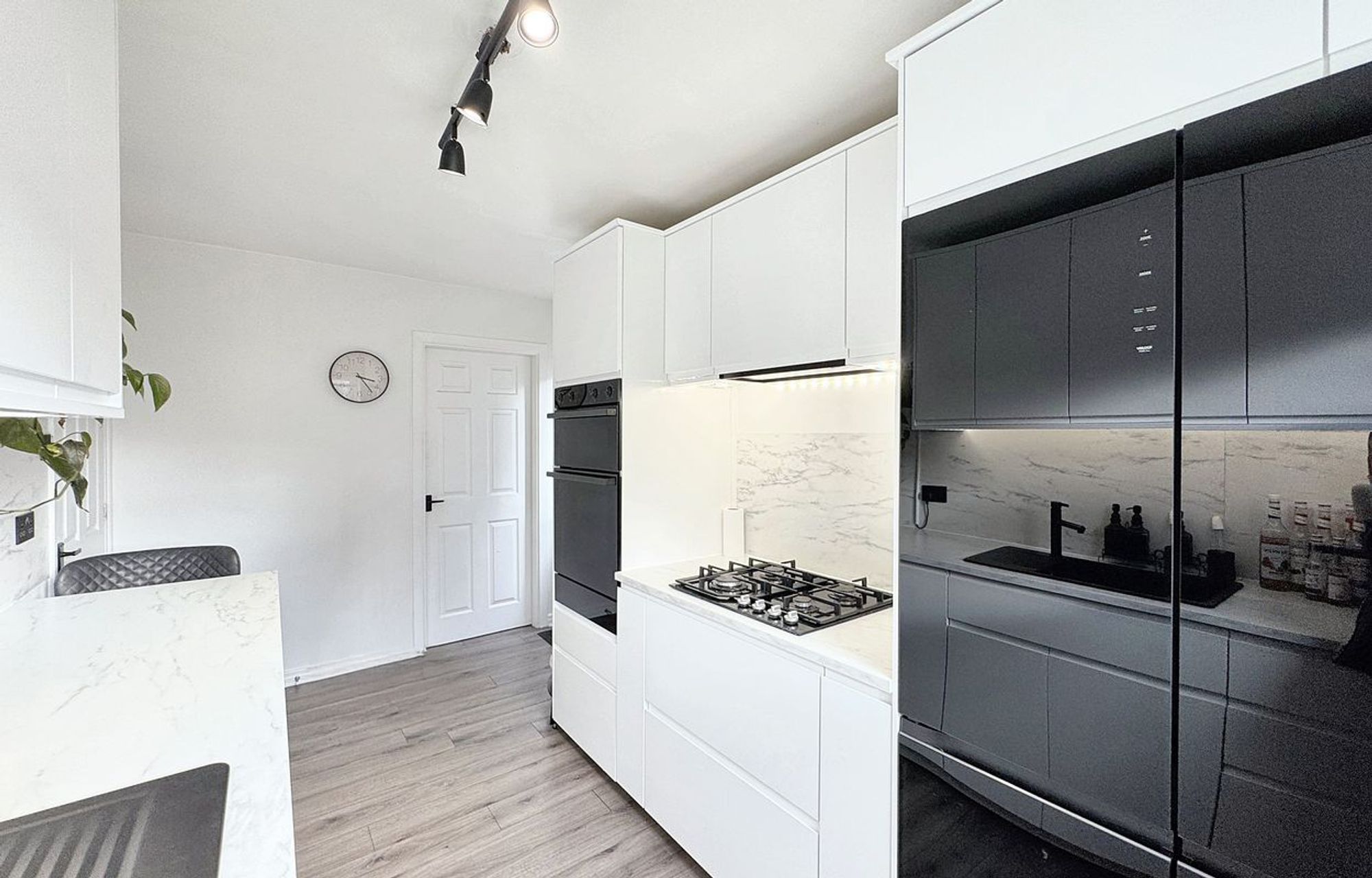 Located at the front of the property, this contemporary kitchen combines functionality with sleek design. It features wood-effect flooring and white cabinetry paired with marble-effect countertops, creating a bright and modern aesthetic. A black sink and tap add a bold contrast, while the sleek black double ovens enhance the room’s sophisticated feel. The alcove with a gas hob forms a distinctive and practical cooking area while appliances include a double oven, gas hob, freestanding fridge freezer, washing machine and dishwasher for everyday convenience. The kitchen also benefits from an external door, providing easy access to the outside space.