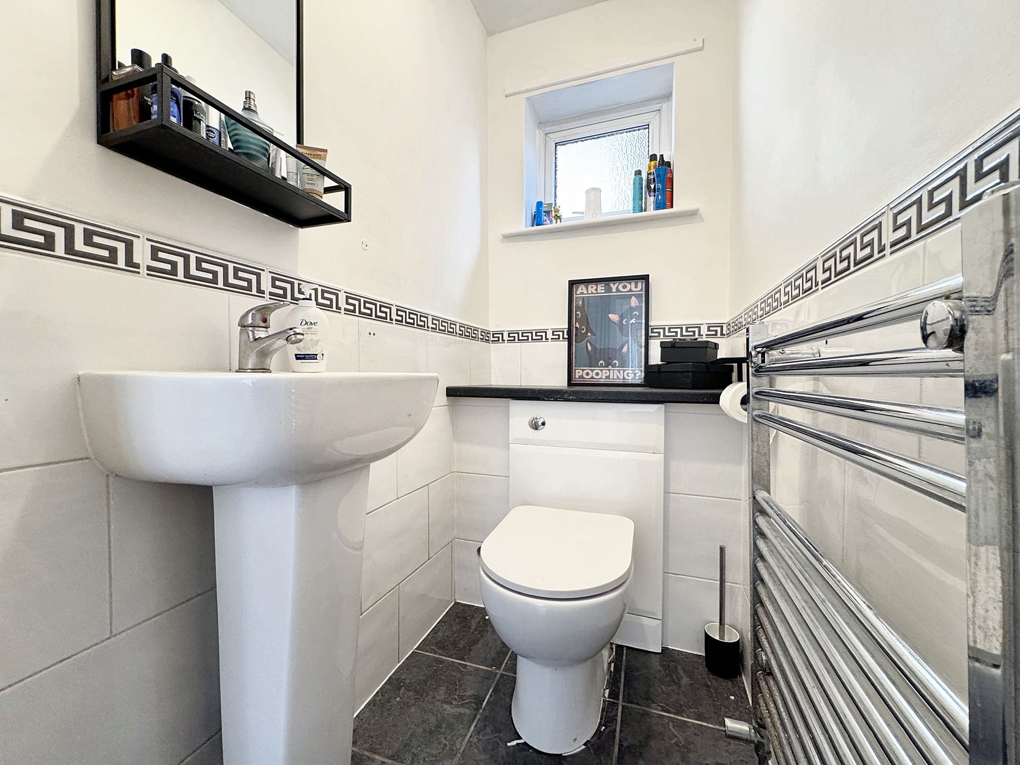 The downstairs WC features a tiled floor and half-tiled walls, combining style with easy maintenance. A chrome heated towel rail adds a touch of modern comfort and functionality, completing this convenient space.