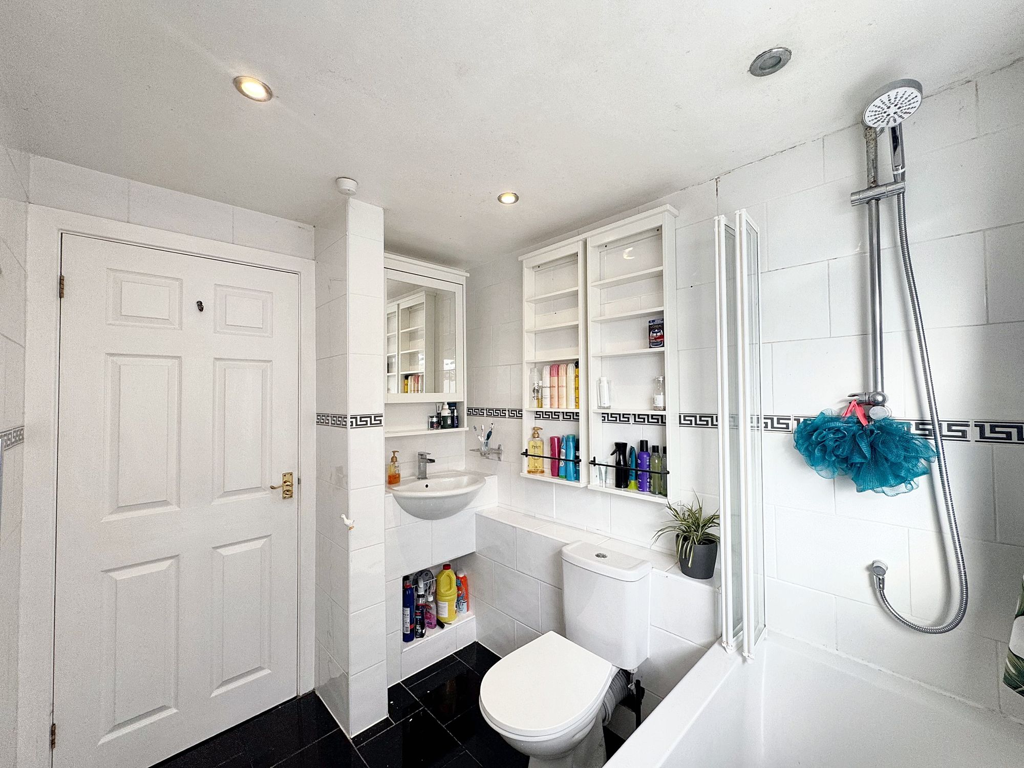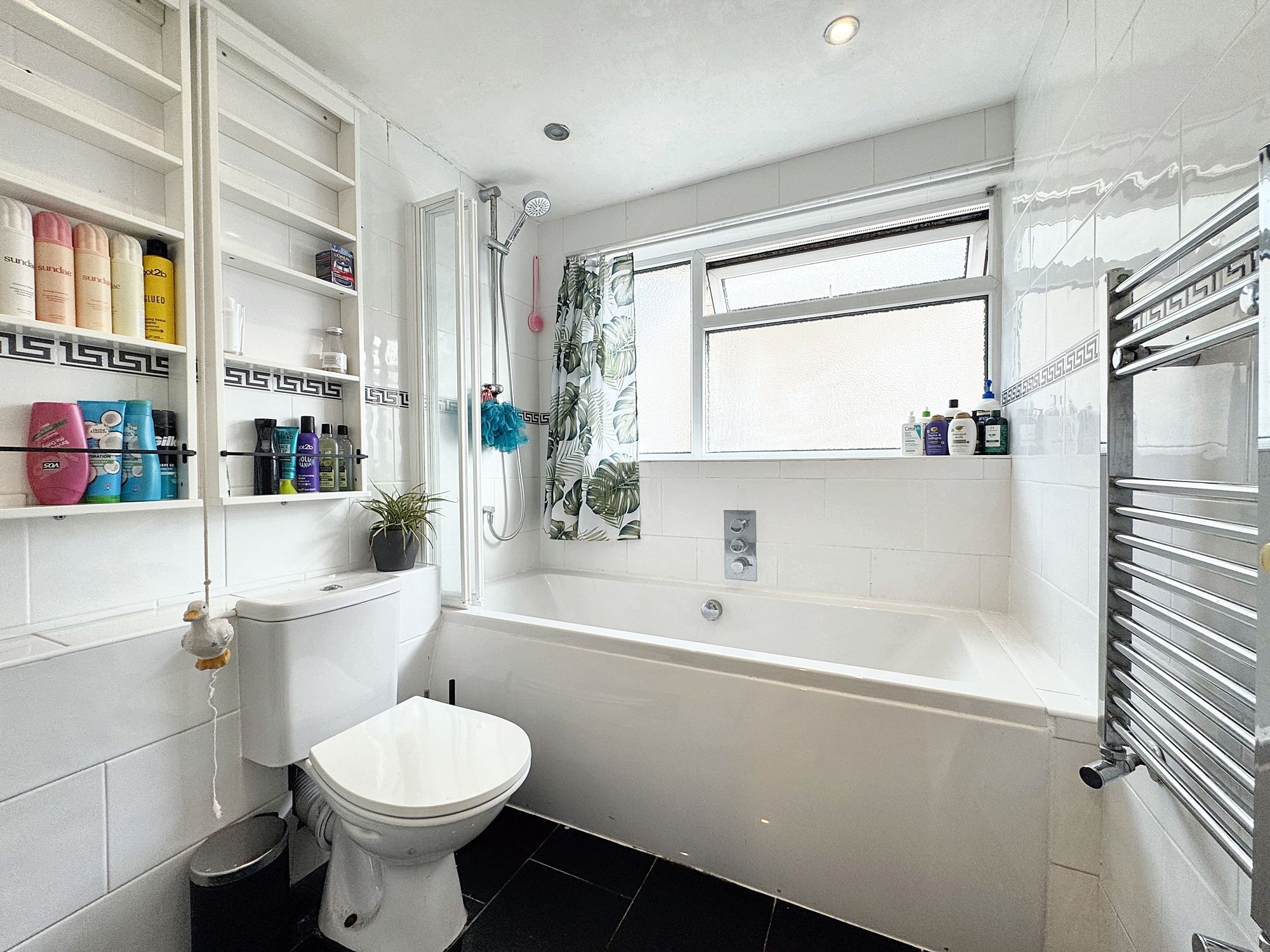 The fully tiled bathroom combines style and practicality, featuring a black tiled floor contrasted with white tiled walls for a sleek, contemporary look. It includes a full-size bath with a separate shower above, offering flexibility for both relaxing soaks and quick showers. Built-in shelving and a mirrored vanity unit provide excellent storage and functionality, while a chrome heated towel rail adds a touch of modern comfort and luxury.