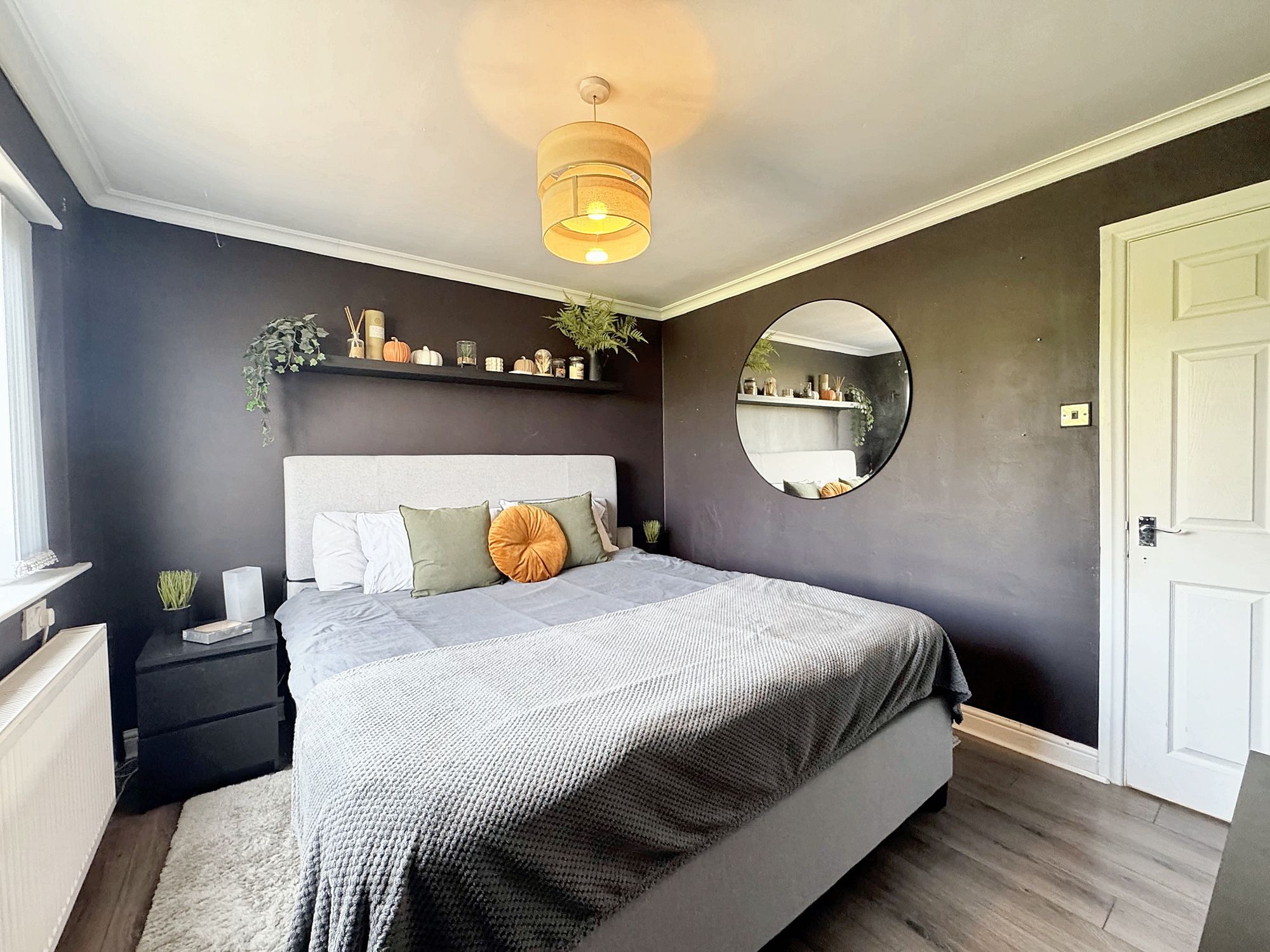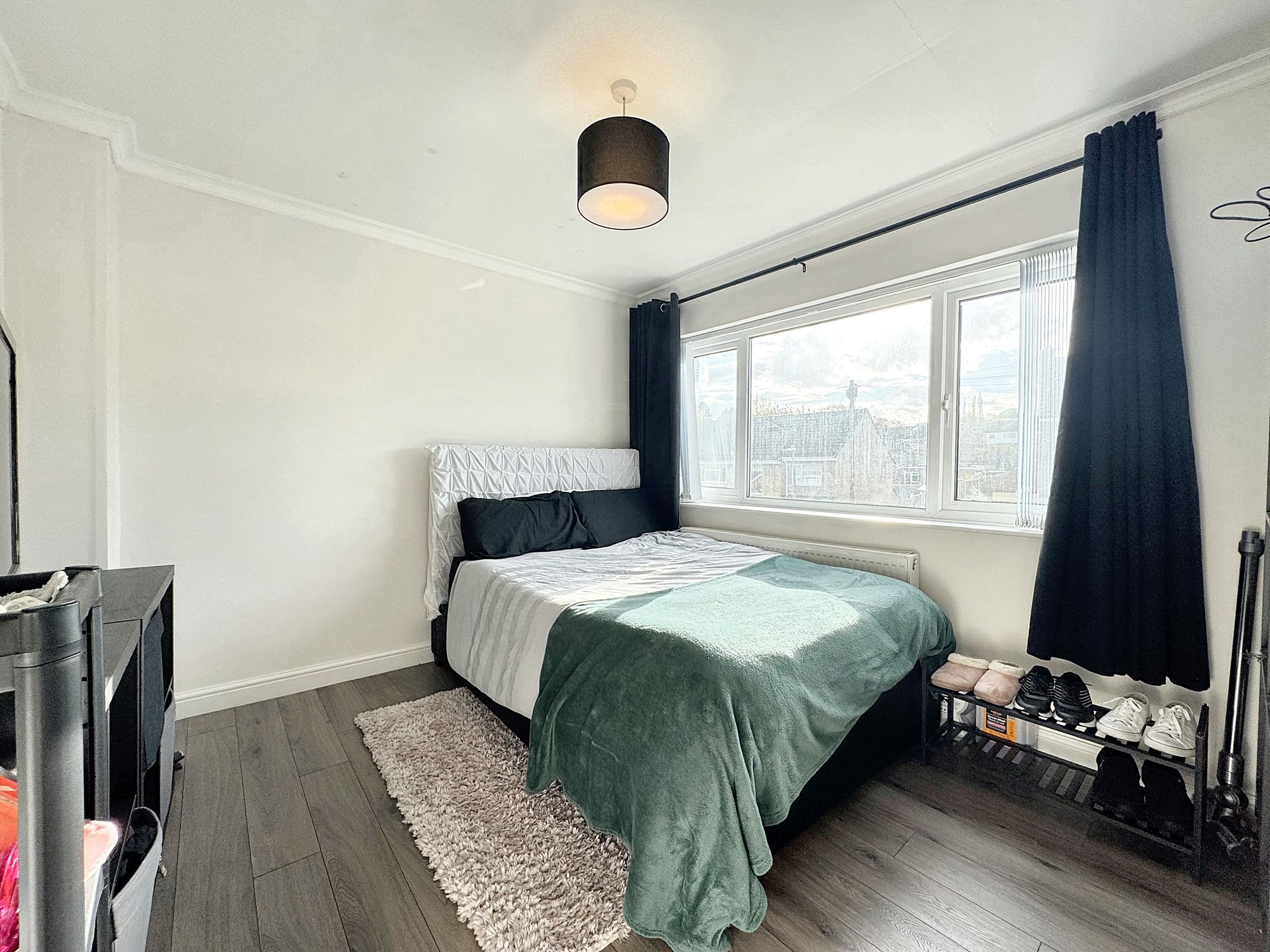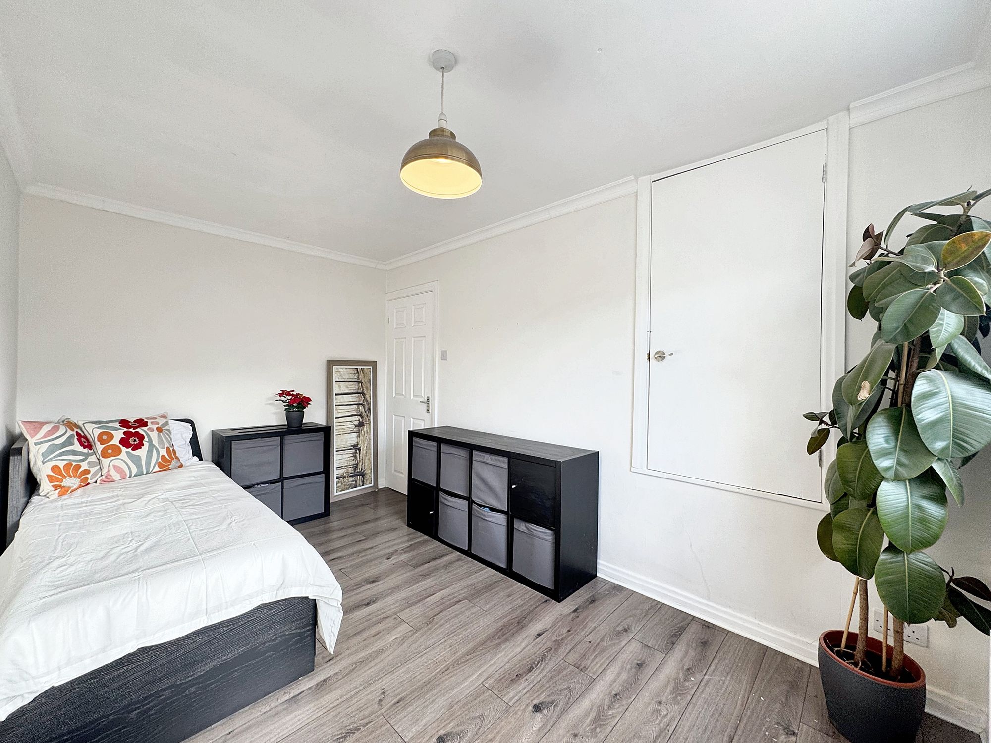 Positioned at the front of the property, this bright double bedroom features white walls and wood-effect flooring, offering a clean and modern finish. A large built-in storage cupboard provides excellent space for clothing and essentials, keeping the room tidy and well-organised. The generous proportions make it a comfortable and versatile space for guests or everyday living.