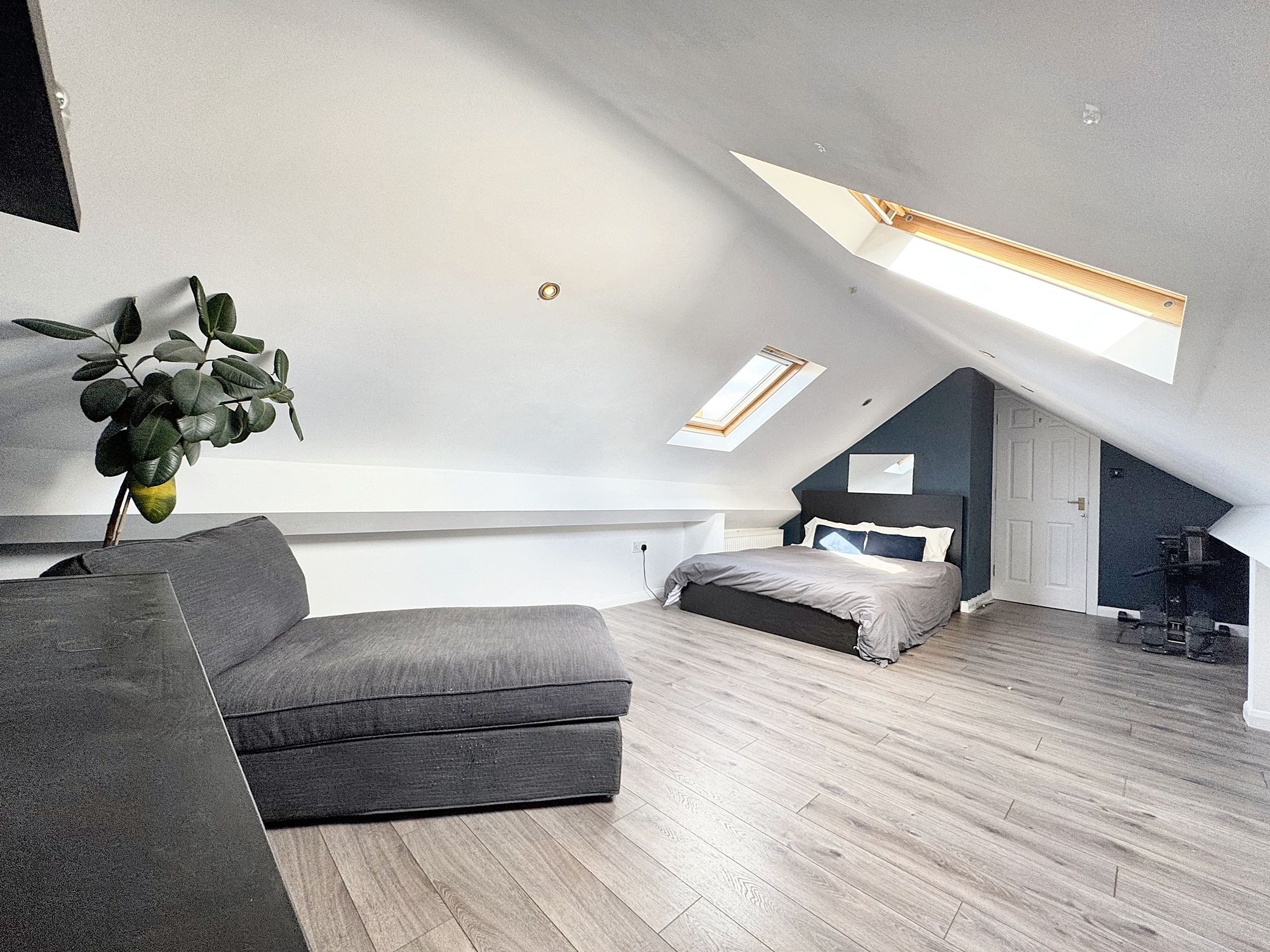 Tucked away on the top floor, this spacious room offers a unique, cosy retreat, with white walls that brighten the space and dark accent walls adding a touch of sophistication. Skylights flood the room with natural light, creating an inviting atmosphere, perfect for anyone seeking a stylish and comfortable space with character and flexibility for a variety of uses.
