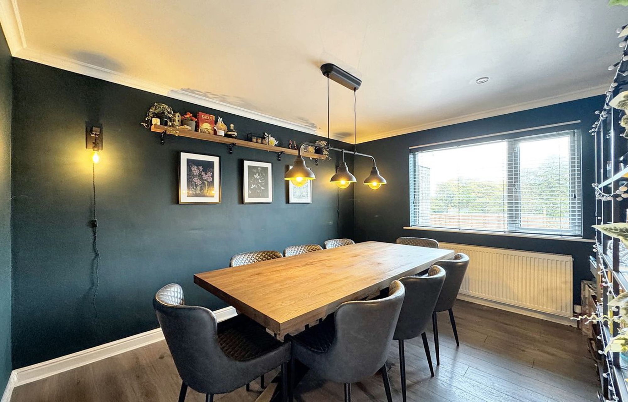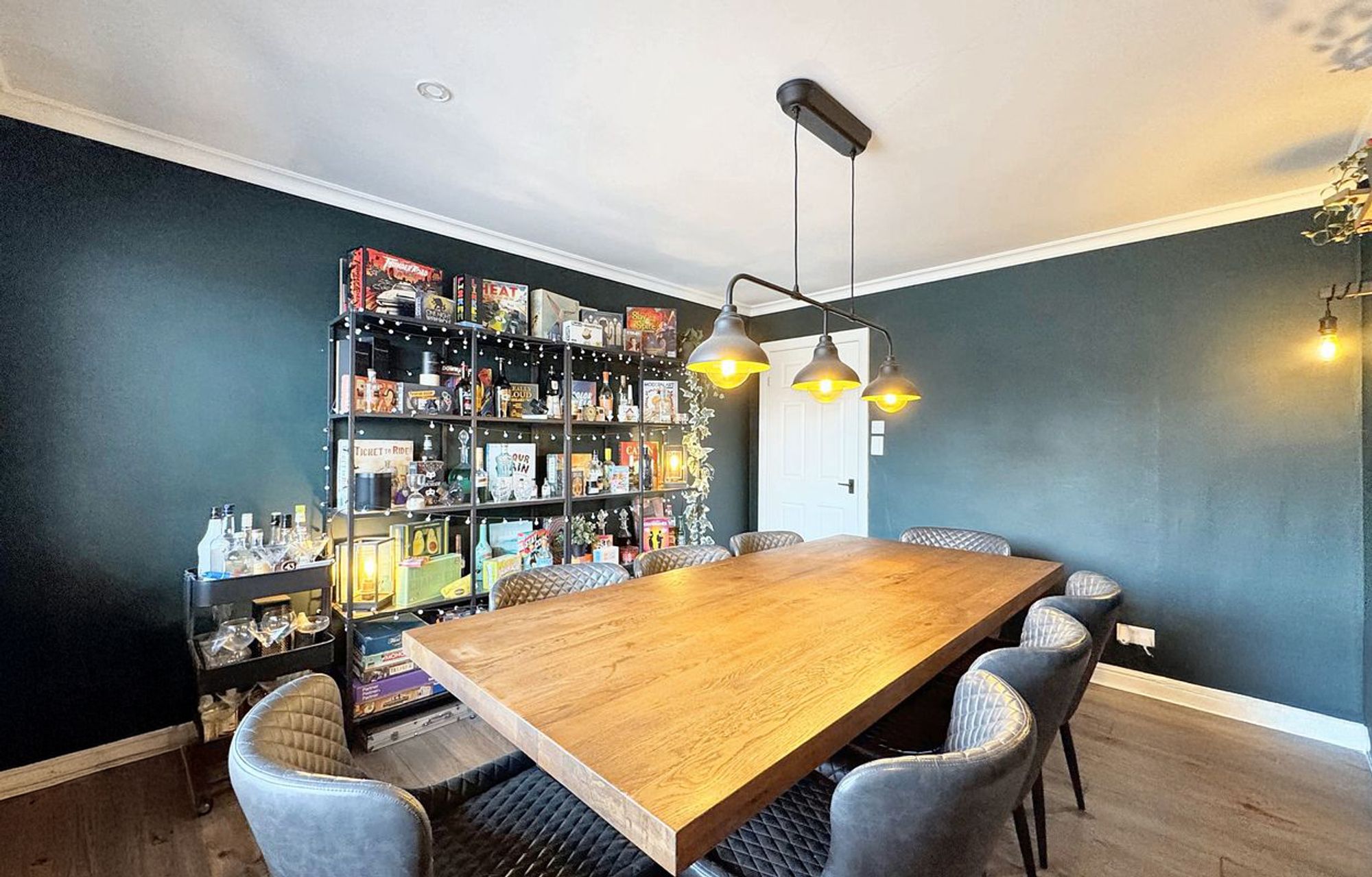 Situated at the rear of the property, this inviting dining room features dark, elegant decor complemented by low-hanging pendant lights, creating a warm and intimate atmosphere ideal for entertaining or relaxed family meals. A large window overlooks the patio, allowing natural light to balance the cosy tones and providing a lovely view of the outdoor space.