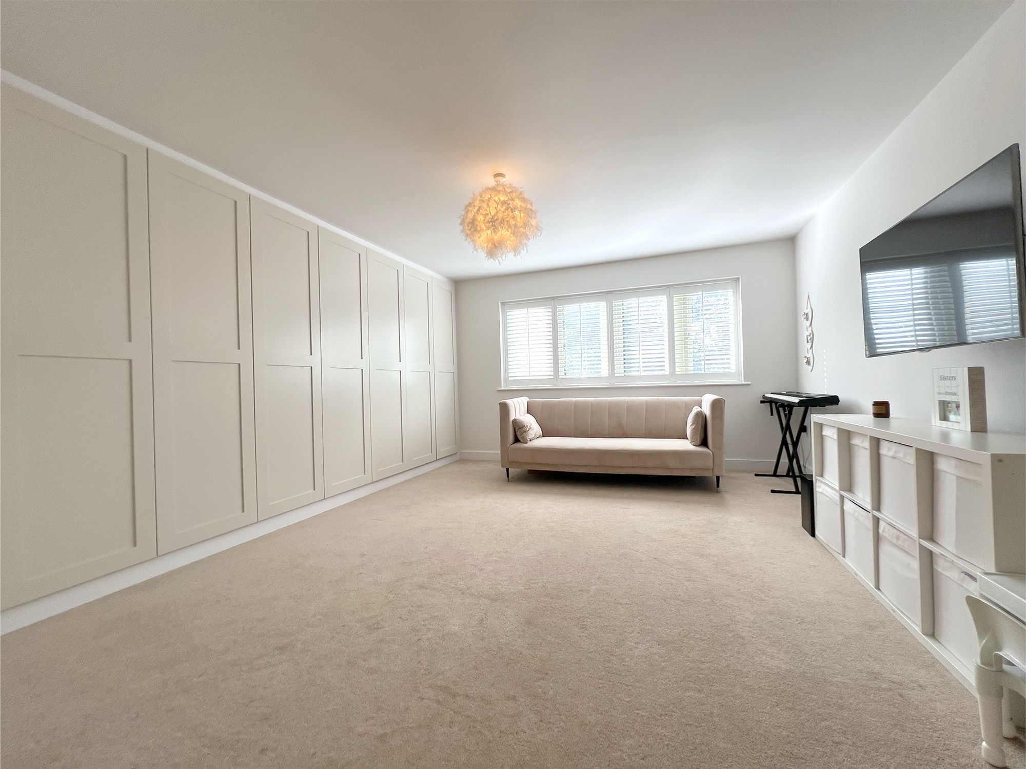 Located on the ground floor, this wonderfully versatile room is currently styled as a playroom but offers endless possibilities, equally suited as an additional bedroom or reception space to suit your lifestyle. Presented in calming neutral tones and enhanced by a full bank of chic, panelled storage units, it combines practicality with understated style.