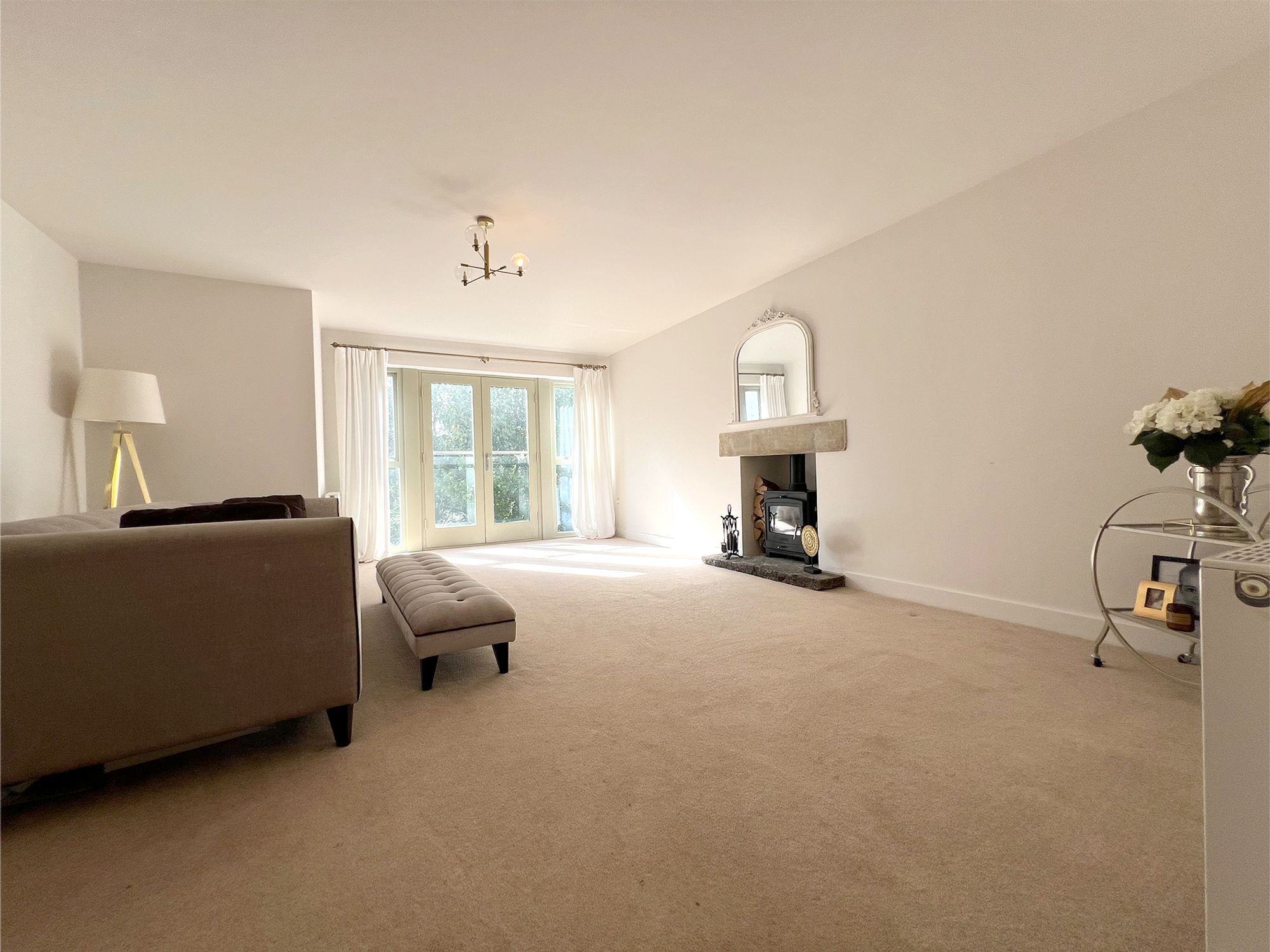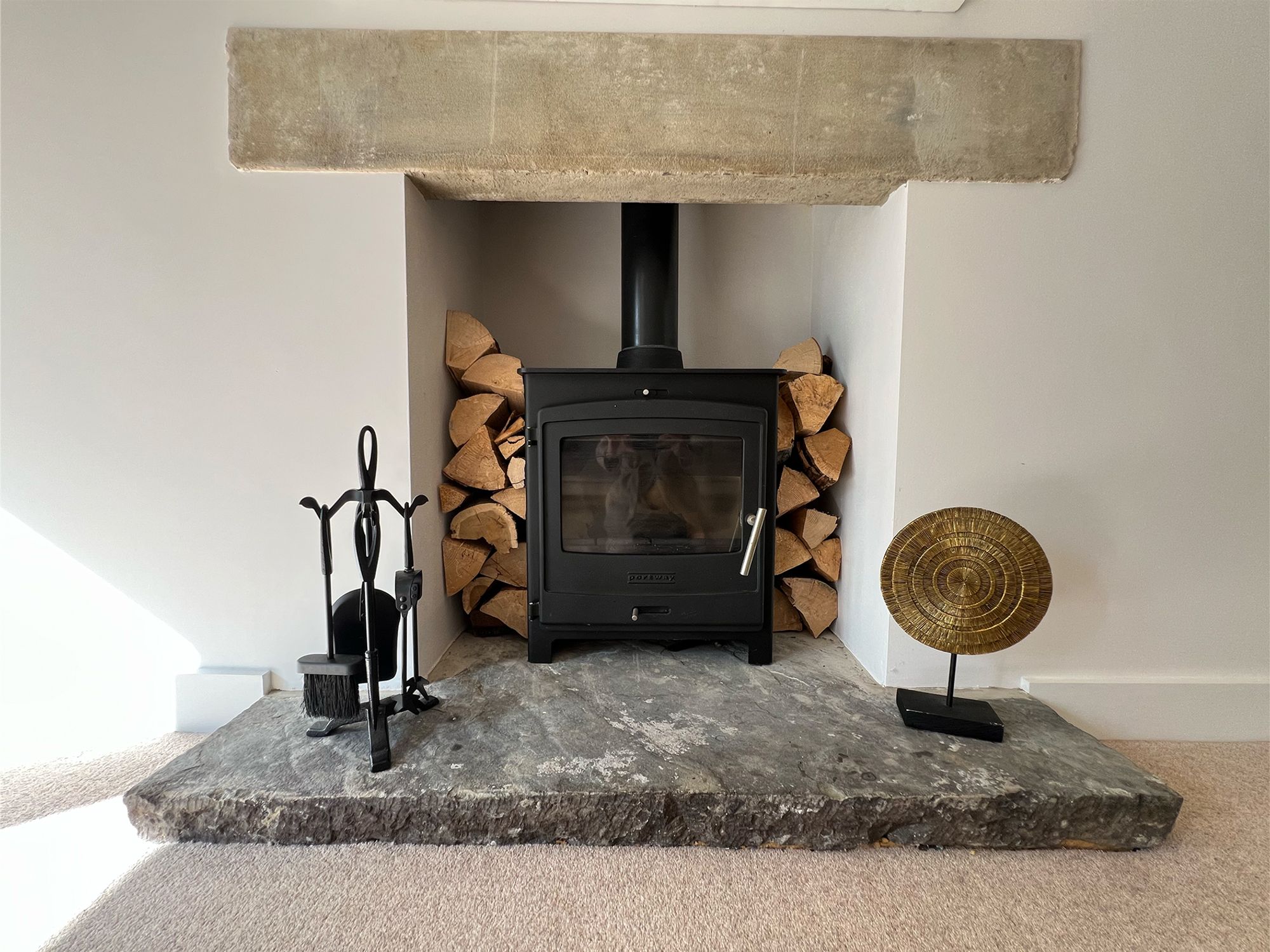 A beautifully styled living room, tastefully presented in neutral tones and bathed in natural light, courtesy of the expansive patio doors that open onto a charming glass Juliette balcony, perfectly framing views of the gardens and treetops beyond. The room’s focal point is the striking multi-fuel stove, set within an exposed stone surround, creating an inviting atmosphere and a wonderfully warm ambience on cooler evenings.