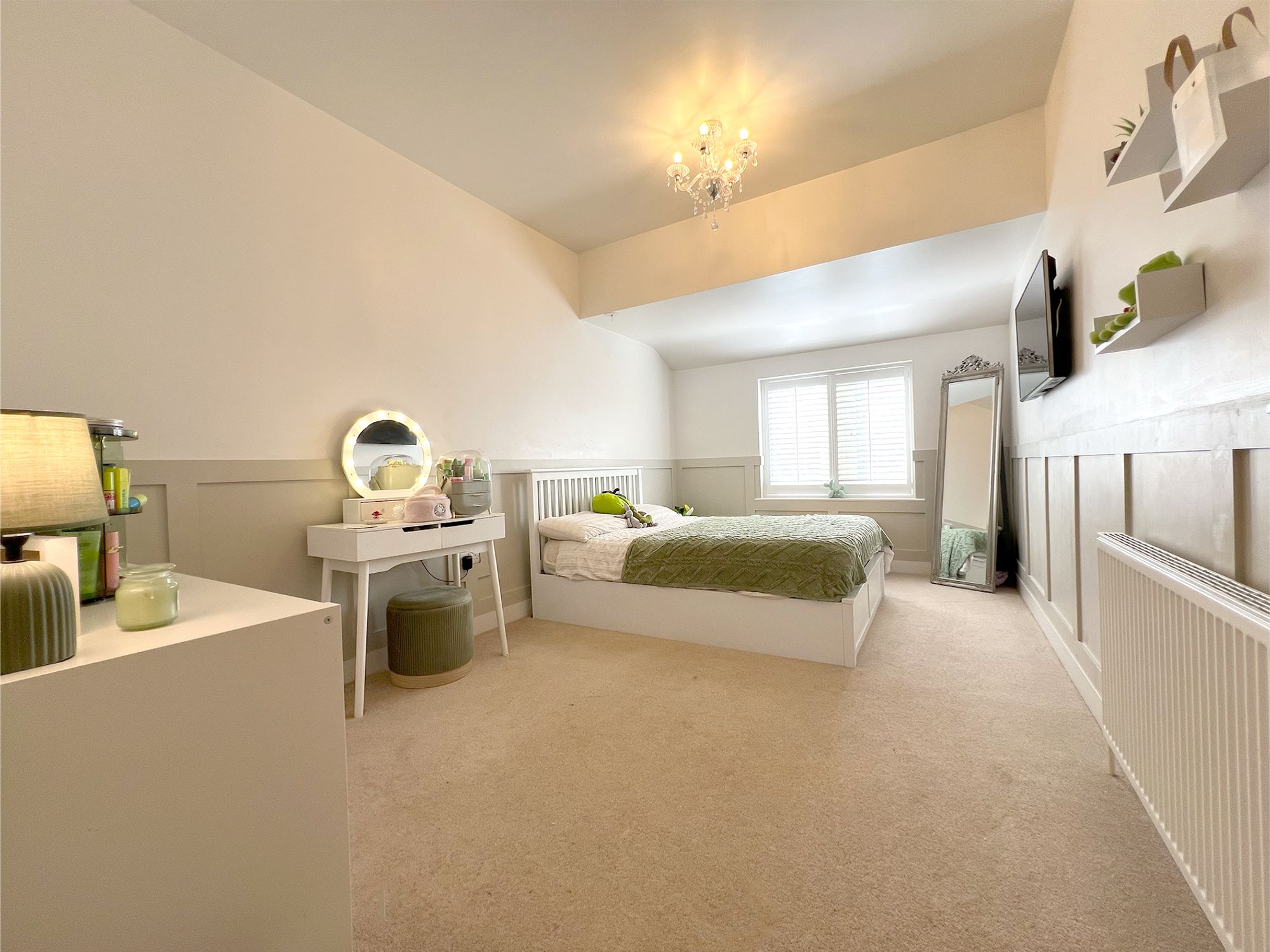 Another generously proportioned bedroom, offering ample space for freestanding furniture and enhanced by stylish half-panelled walls. A large window, dressed with contemporary Venetian shutters, allows natural light to fill the room.