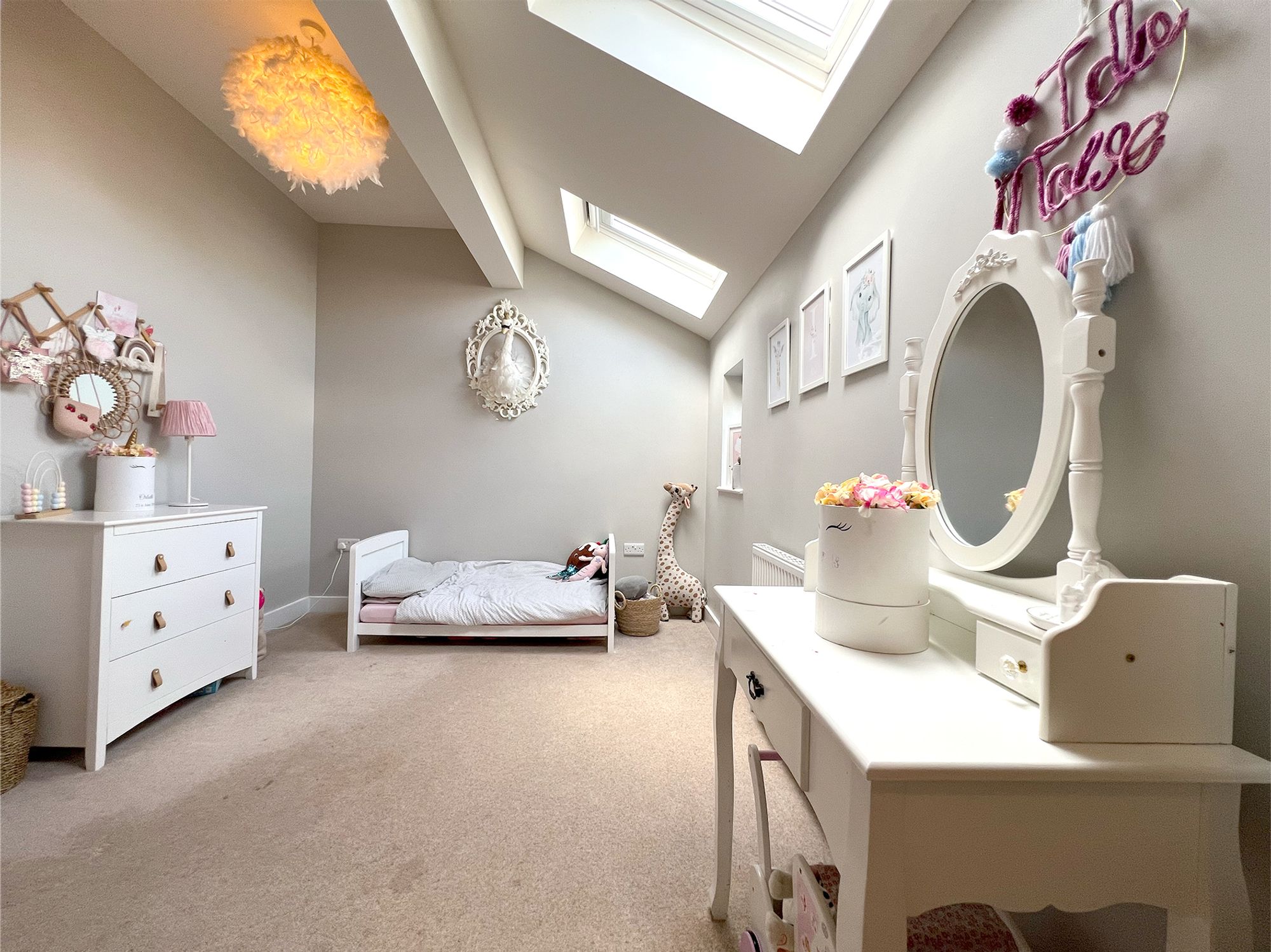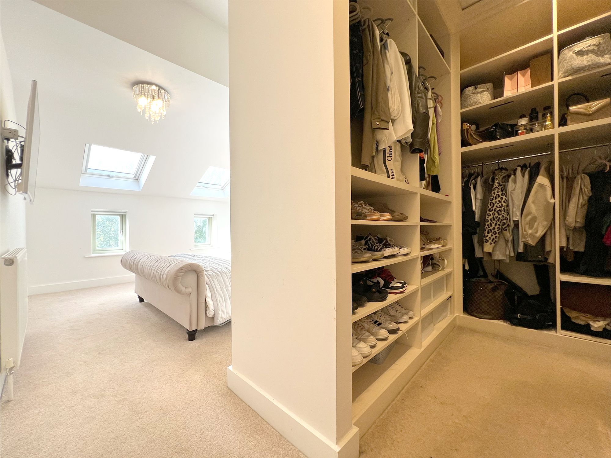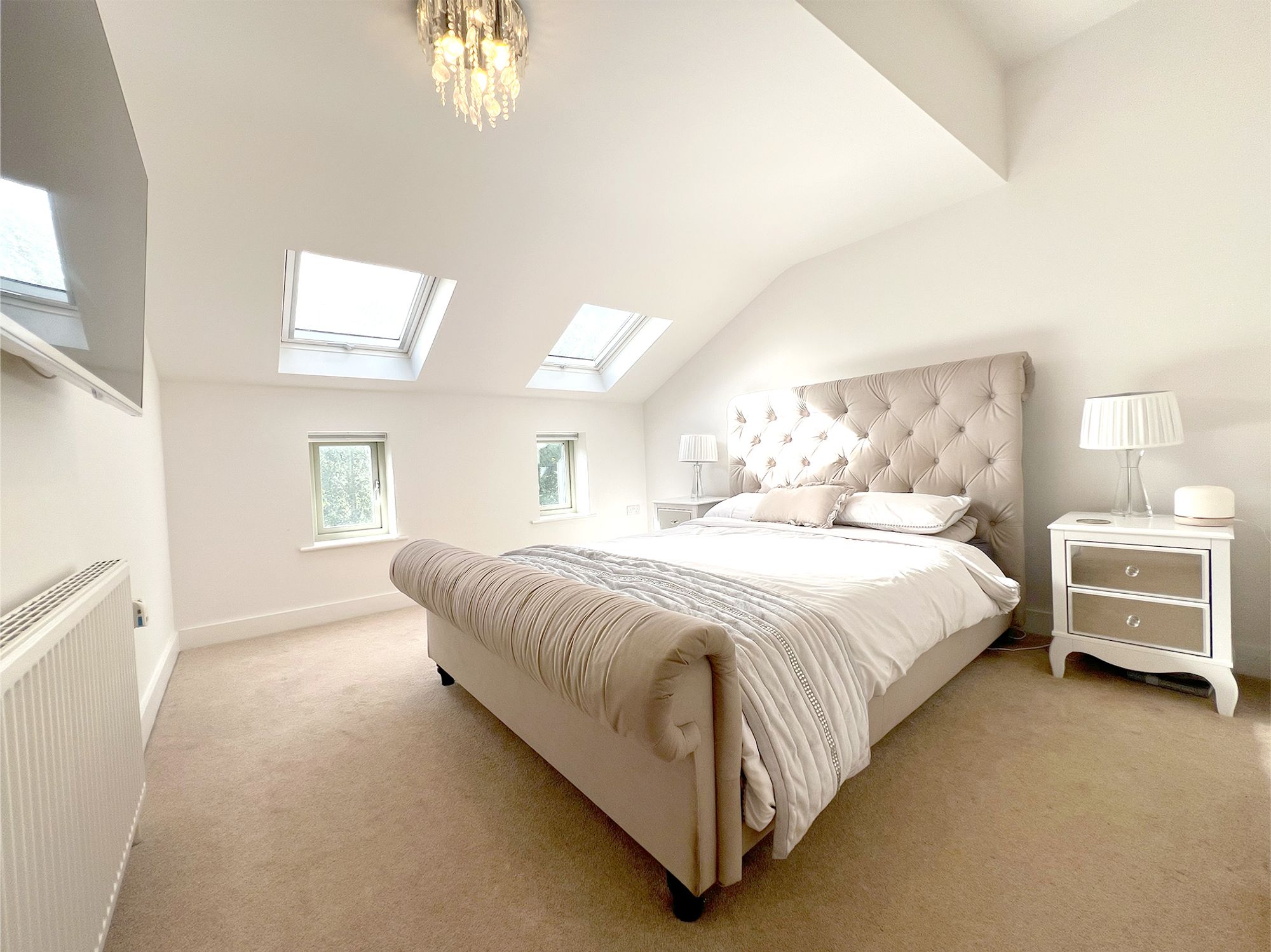 A truly luxurious master suite, bathed in natural light from Velux and low-level windows that perfectly frame enchanting treetop views. An elegant archway leads into a superb walk-in dressing room, offering exceptional storage and style, while a further door provides access to the private en-suite, completing this indulgent retreat.