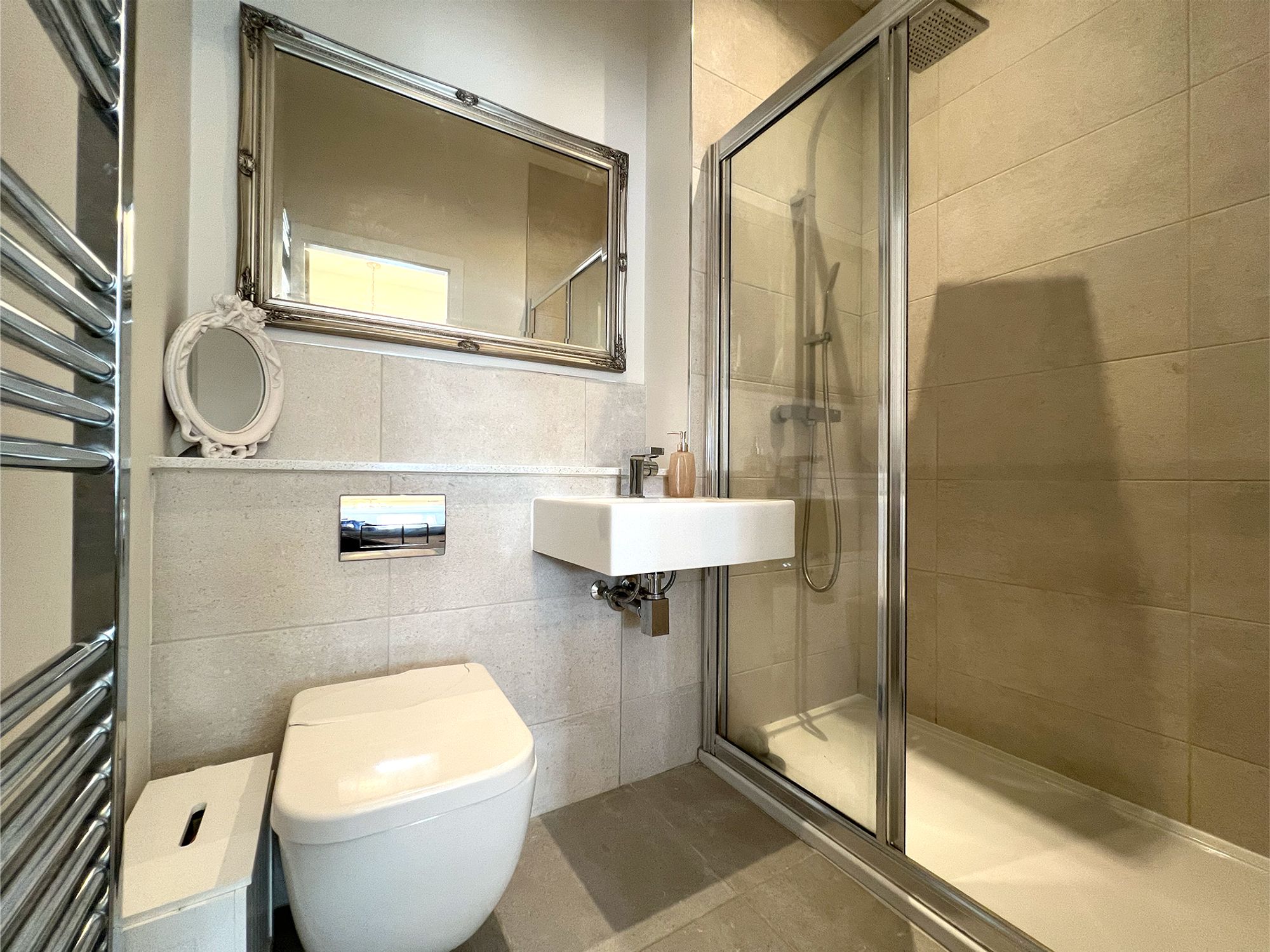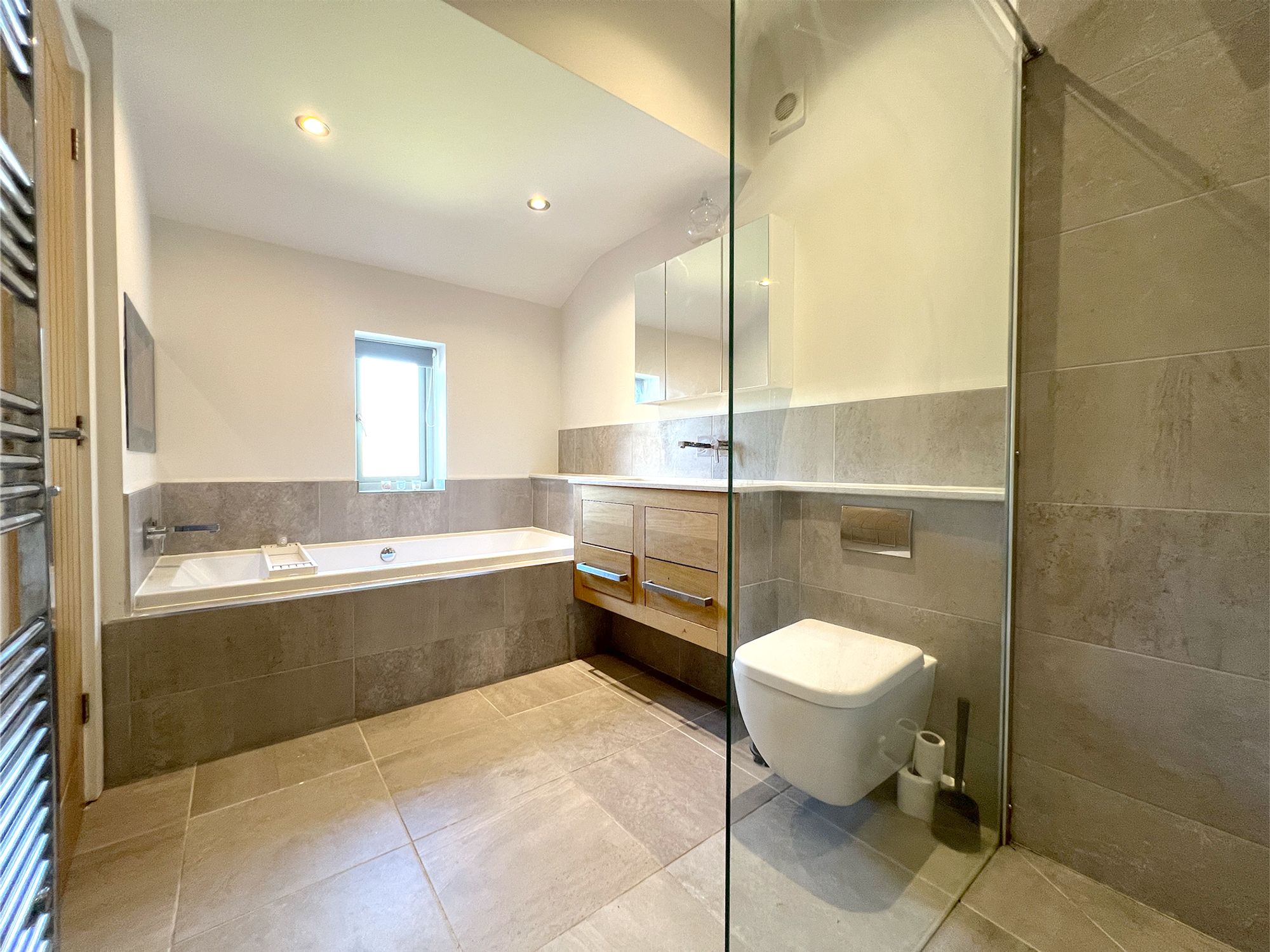 The en-suite is beautifully appointed, featuring a walk-in shower cubicle with both a rainhead fitting and a separate handheld attachment. A sleek floating wash basin, WC, and chrome heated towel rail complete the space, which is finished with soft grey tiling for a contemporary look and effortless maintenance. Underfloor heating adds the perfect finishing touch, ensuring warmth and comfort all year round.