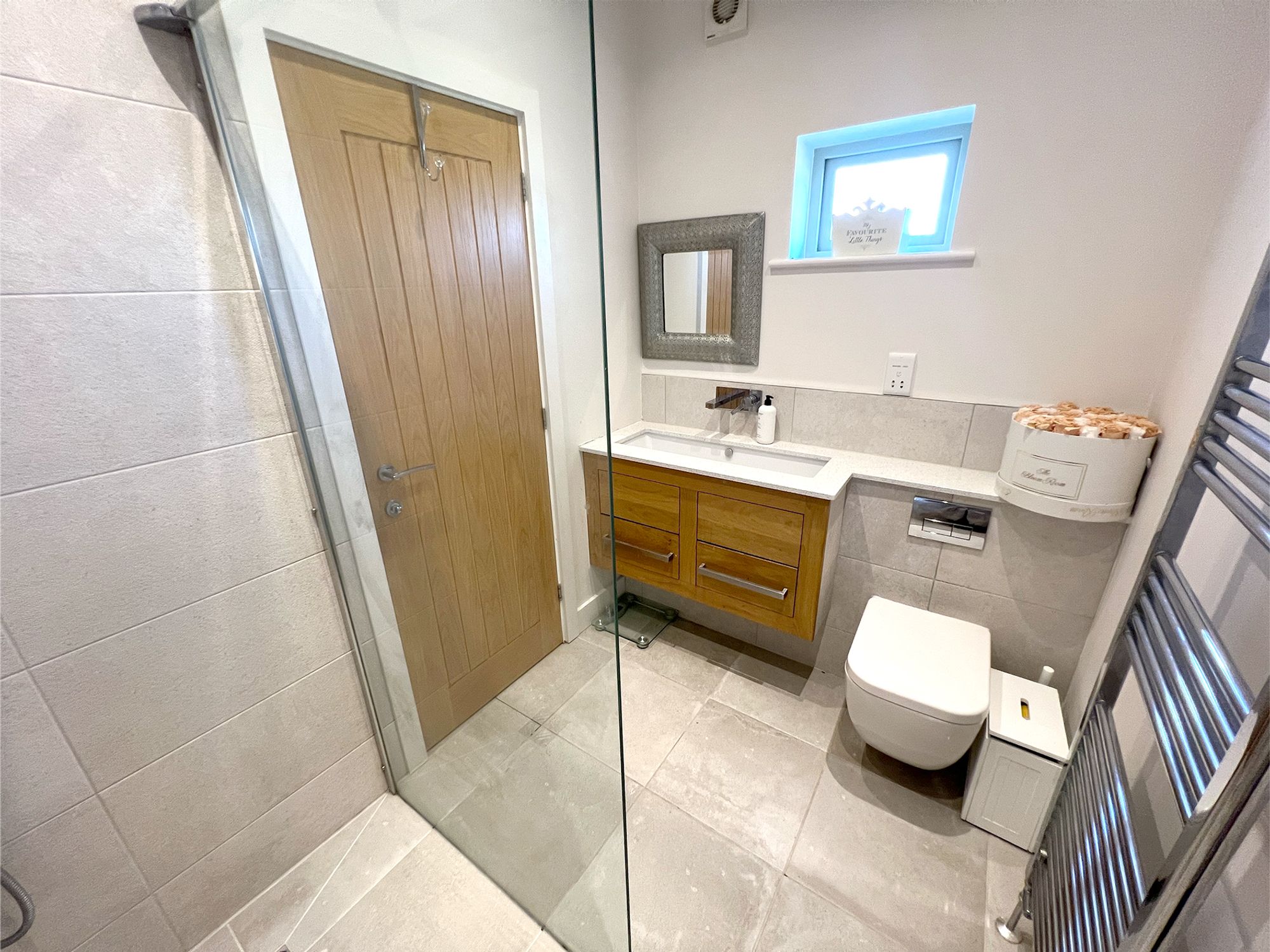 The luxurious wet room–style en-suite is beautifully appointed, featuring a sleek walk-in shower with a rainhead fitting and glass screen. A stylish wash basin sits within a contemporary wooden vanity unit, topped with a quartz work surface, accompanied by a WC and chrome heated towel rail. Finished with underfloor heating for the ultimate comfort, this space combines modern elegance with a spa-like sense of indulgence.