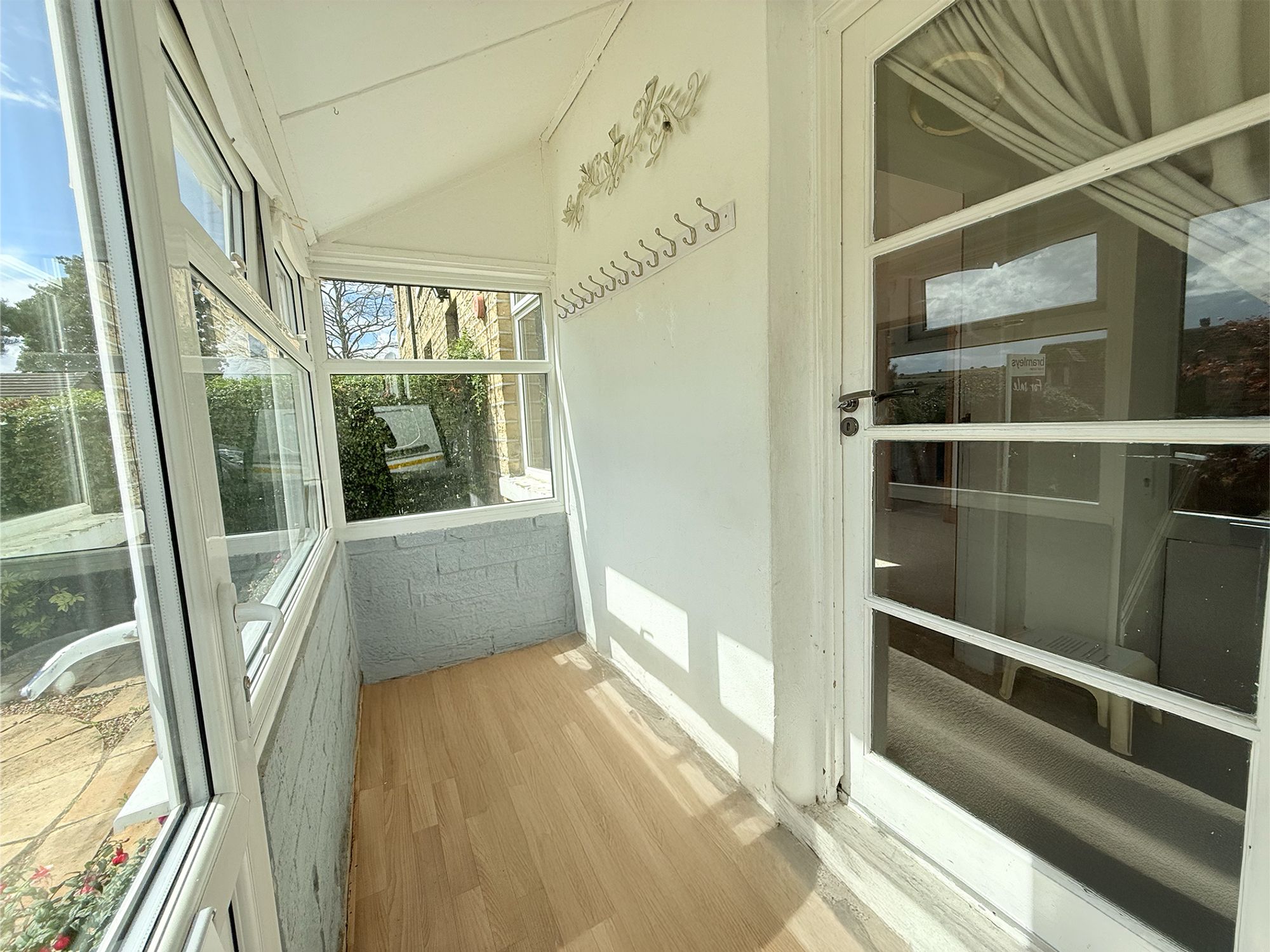 A good-sized entrance porch with front and side windows to allow plenty of natural light flow in. There is ample space for shoes and coat storage, making it a practical and welcoming entry point. The porch is presented in neutral tones and finished with wood-effect laminate flooring for a clean, modern look.
