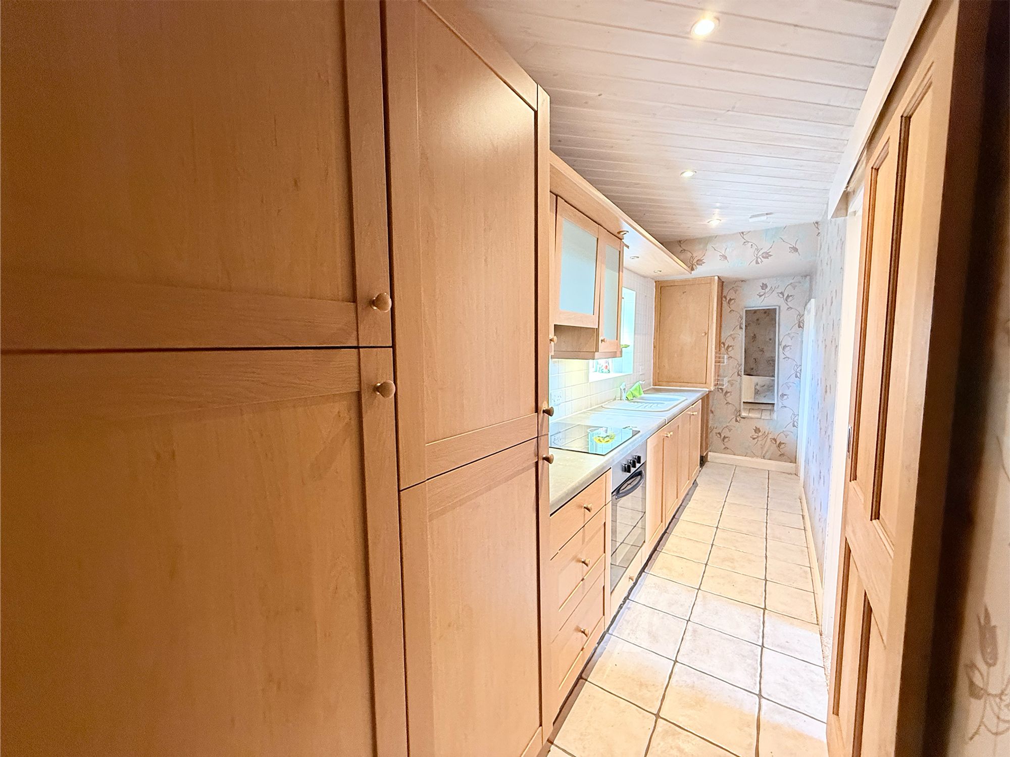 Spanning the full width of the house, this generously sized kitchen is both practical and full of character. Fitted with wood-effect units and marble-effect countertops, it is complemented by white tiled flooring and patterned wallpapered walls. The kitchen includes a built-in electric oven with four-ring hob, a chrome mixer tap sink, built-in wine rack, and a built-in fridge freezer. A large pantry cupboard provides excellent additional storage, while the boiler is neatly housed within a kitchen unit. There is also space beneath the countertops for a washing machine or dishwasher, offering flexibility to suit modern family needs.