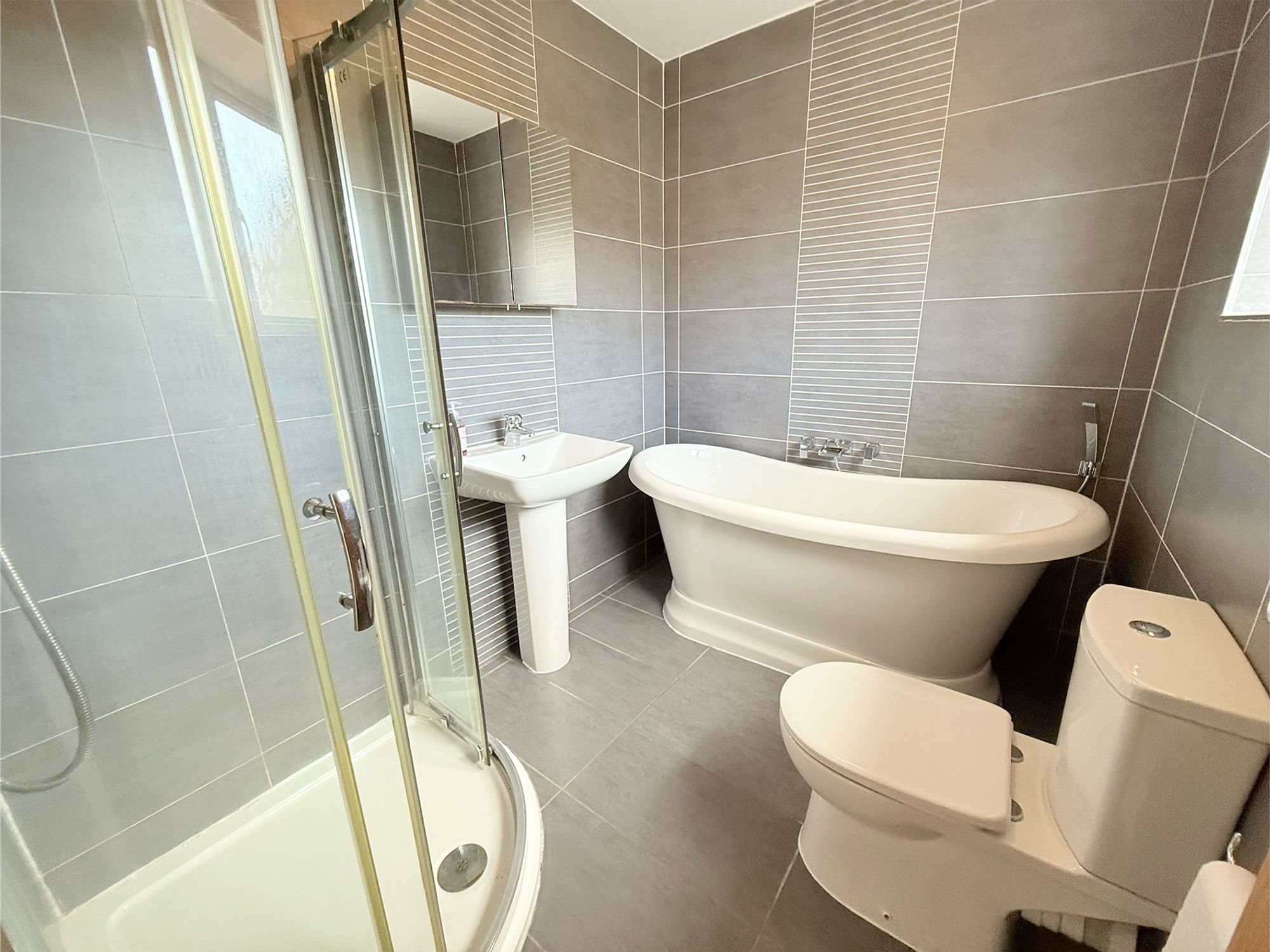 A modern bathroom suite featuring a shower with both a rainfall shower-head and a separate handheld attachment. The room also boasts a full-sized freestanding bath with chrome mixer tap and shower attachment, offering both luxury and practicality. A contemporary sink with chrome mixer tap and a matching WC complete the suite. Finished with stylish grey tiles, the space is not only sleek and modern but also designed for easy cleaning and low maintenance.