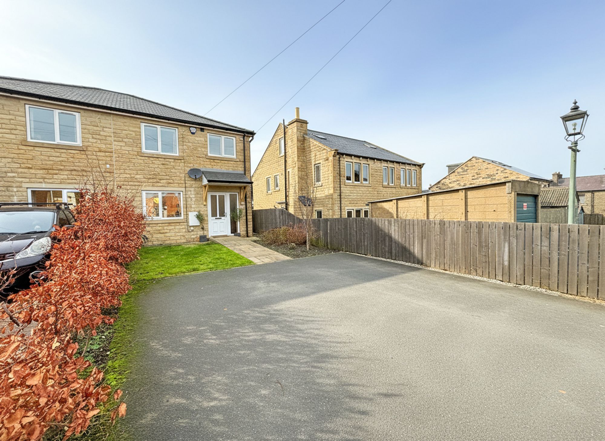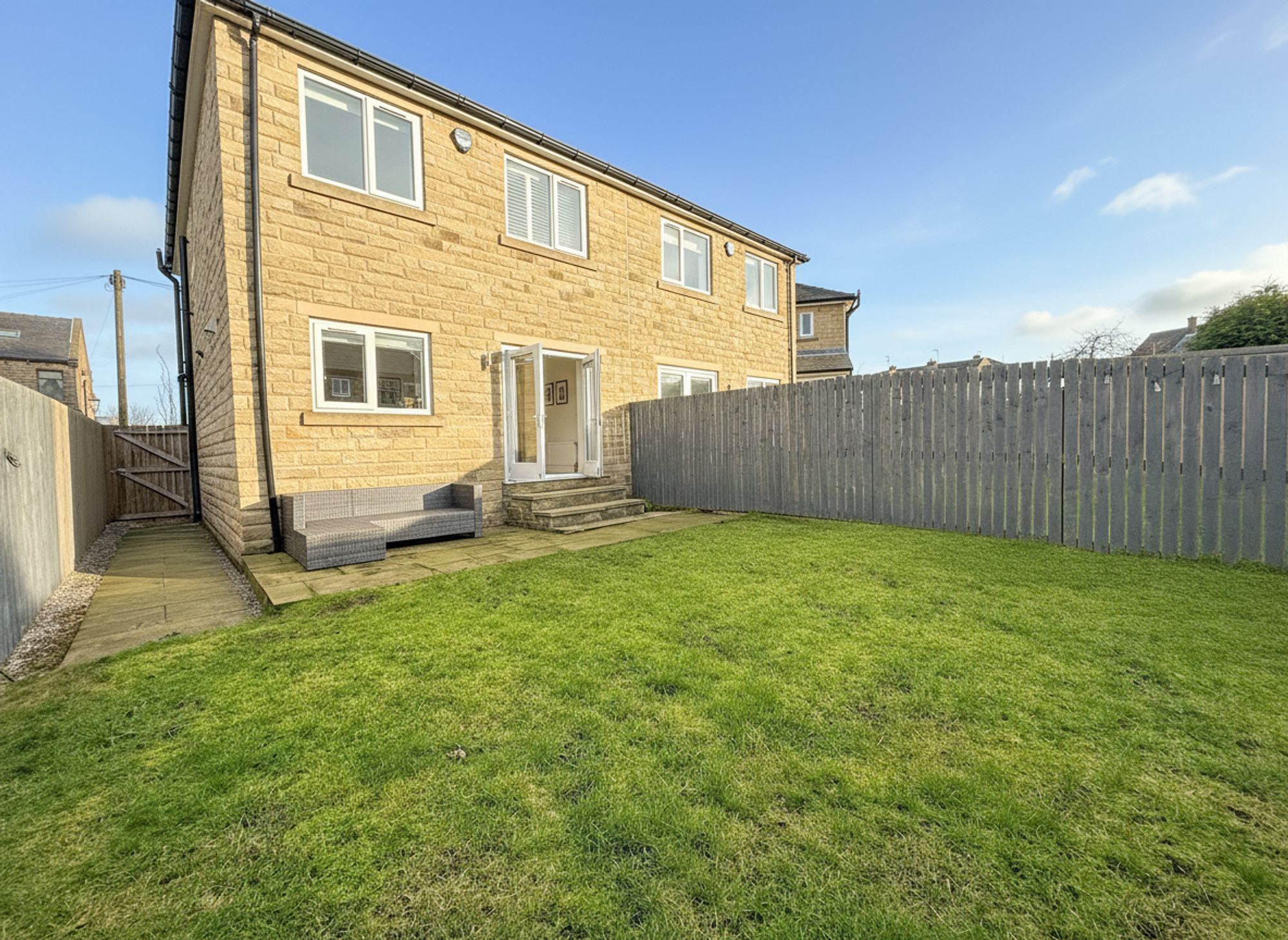 To the rear of the property is a spacious and fully enclosed garden, ideal for children and pets. Directly accessed from the kitchen diner is a stone-flagged patio area, perfect for outdoor dining and socialising during the warmer months, which flows seamlessly into a well-maintained lawn. A pathway runs down the side of the house with a wooden gate providing useful side access to the driveway.