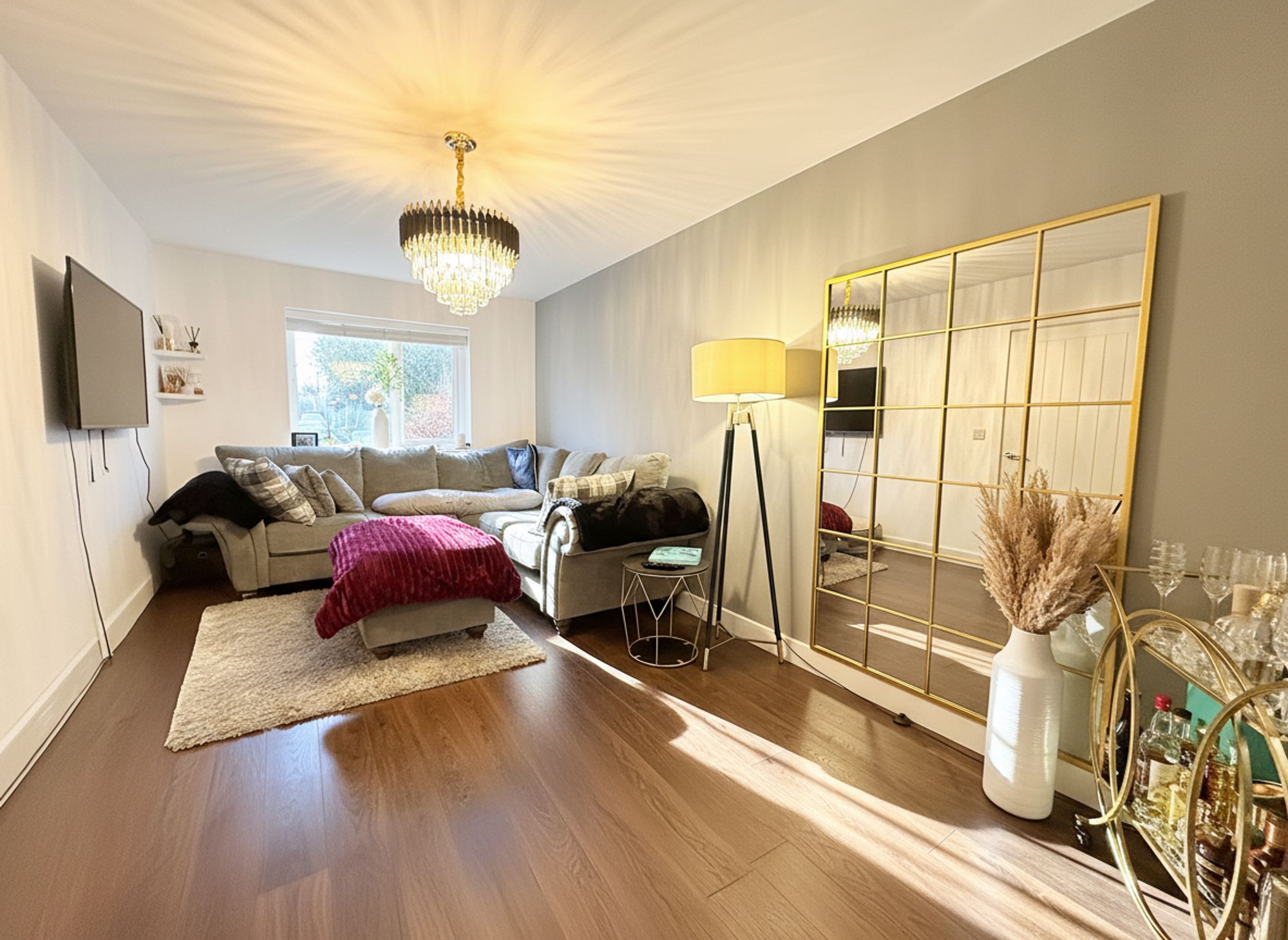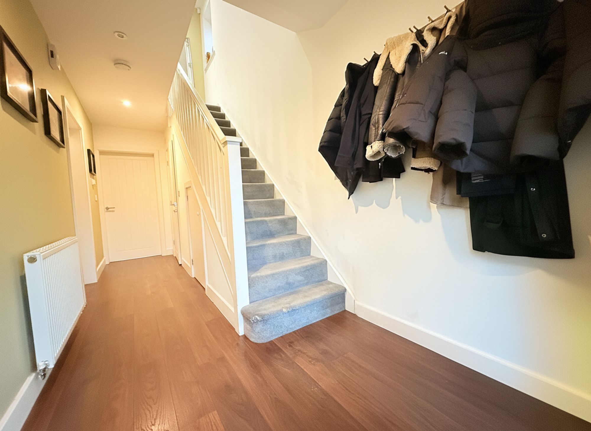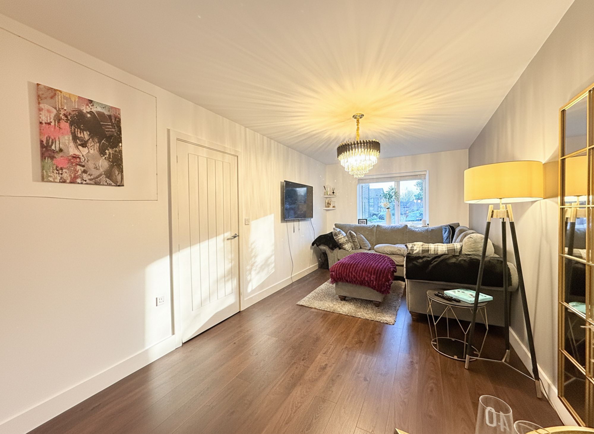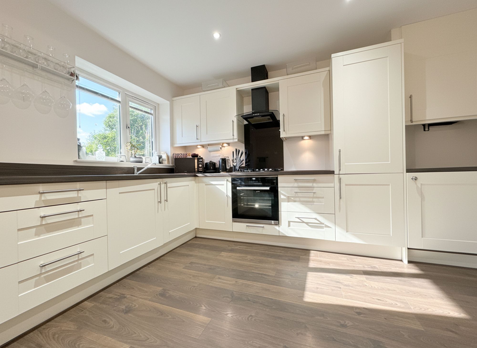 A welcoming and spacious entrance hall, tastefully finished in neutral tones and complemented by practical wood-effect laminate flooring, ideal for easy day-to-day cleaning. The hallway offers generous space for coats and shoes and provides access to the kitchen diner, living room and downstairs WC. Further enhanced by a useful under-stairs storage cupboard, perfect for keeping the space neat and clutter-free.