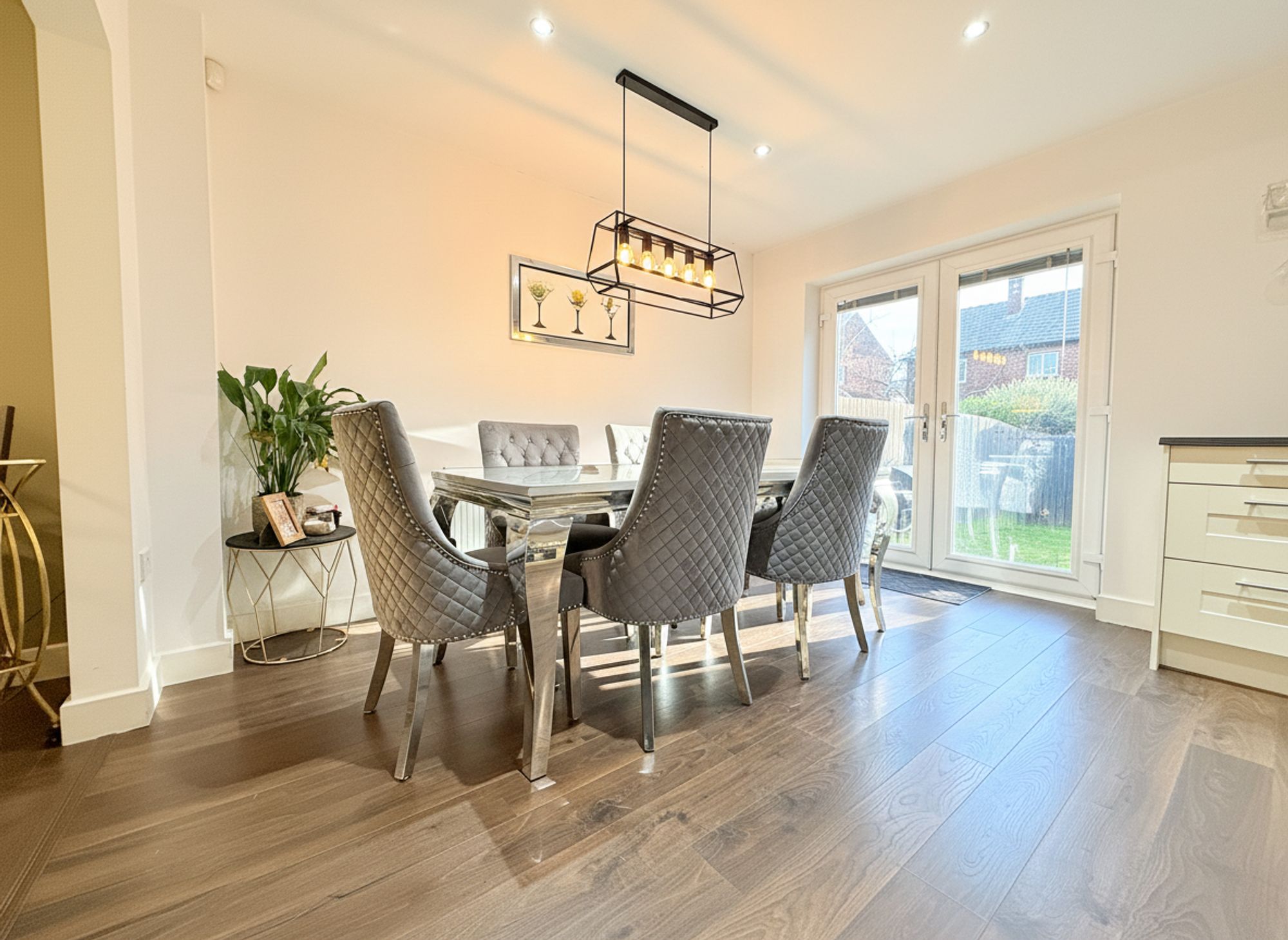 Located to the rear of the property and spanning the full width of the home, this modern kitchen diner is both stylish and practical. The kitchen features attractive white shaker-style units complemented by warm wood-effect worktops and matching wood-effect laminate flooring. Integrated appliances include an electric oven, four-ring gas hob and fridge freezer, while a chrome sink with mixer tap is perfectly positioned beneath the window, enjoying peaceful views over the rear garden. French doors open directly onto the garden patio, creating an ideal space for indoor-outdoor dining and entertaining. The boiler is neatly concealed within the cabinetry, and the room also offers excellent potential for a rear extension, subject to the necessary consents.