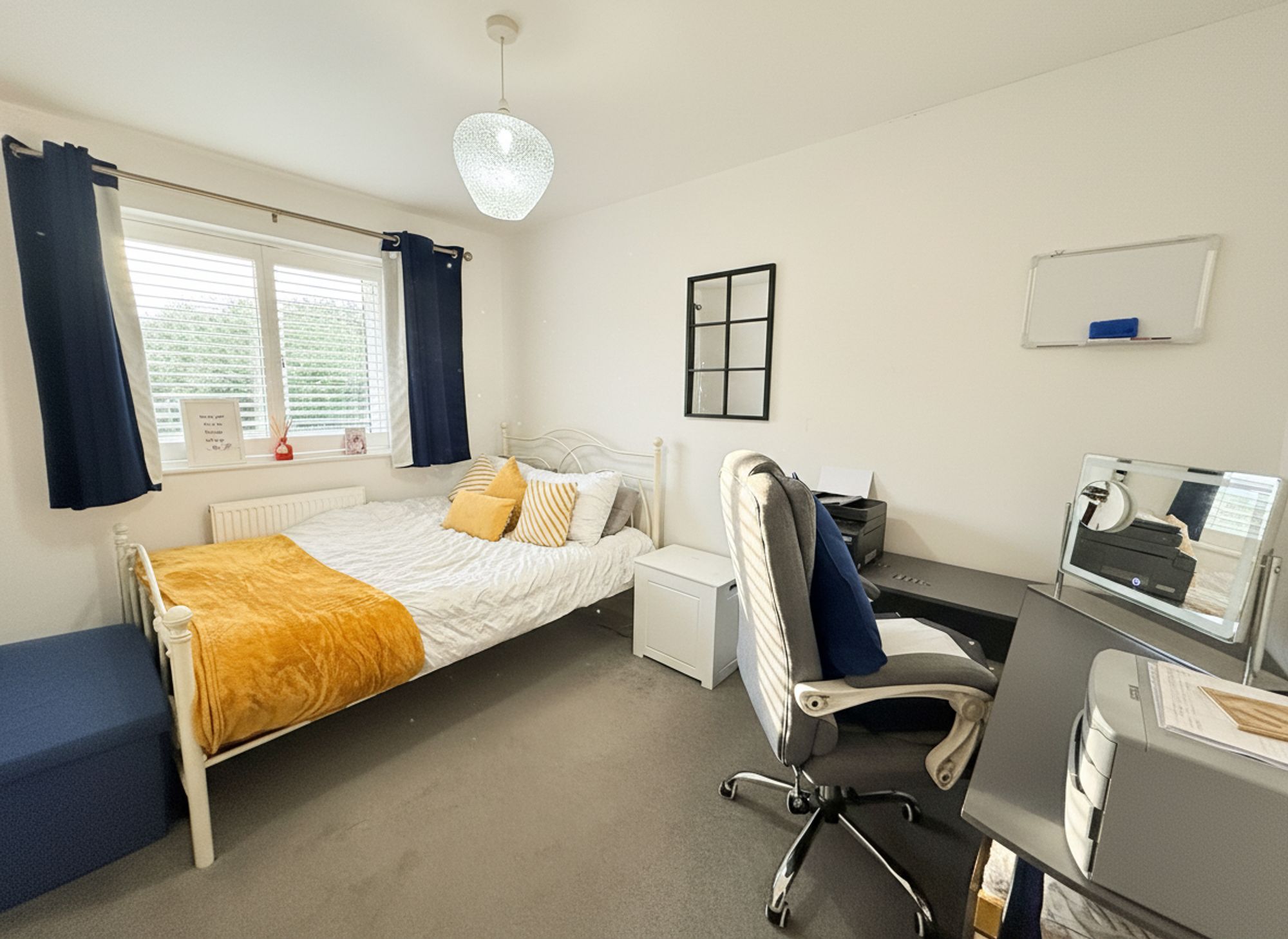 Originally designed as two bedrooms in the original build plans, this impressive space has been thoughtfully reconfigured to create a generous and stylish principal bedroom suite. Located to the rear of the property, the room enjoys dual-aspect windows that flood the space with natural light while offering pleasant views over the rear garden. Impressive in size, the bedroom comfortably accommodates a super king bed along with a range of additional freestanding furniture. Neutrally decorated and enhanced by a striking accent panelled feature wall, the room further benefits from built-in shutter blinds and private access to the en-suite bathroom. There is also clear potential to reinstate the original two-bedroom layout, if desired.