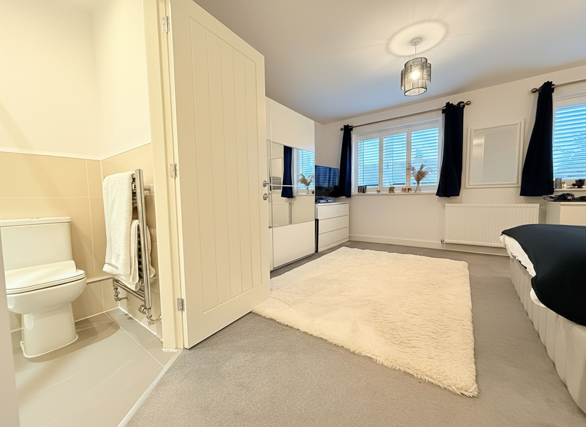 A contemporary en-suite finished with sleek neutral tiling and fitted with a floating wash basin with chrome mixer tap, WC and a chrome heated towel rail. The suite is completed with a modern shower featuring a handheld shower attachment, creating a stylish and practical private space.