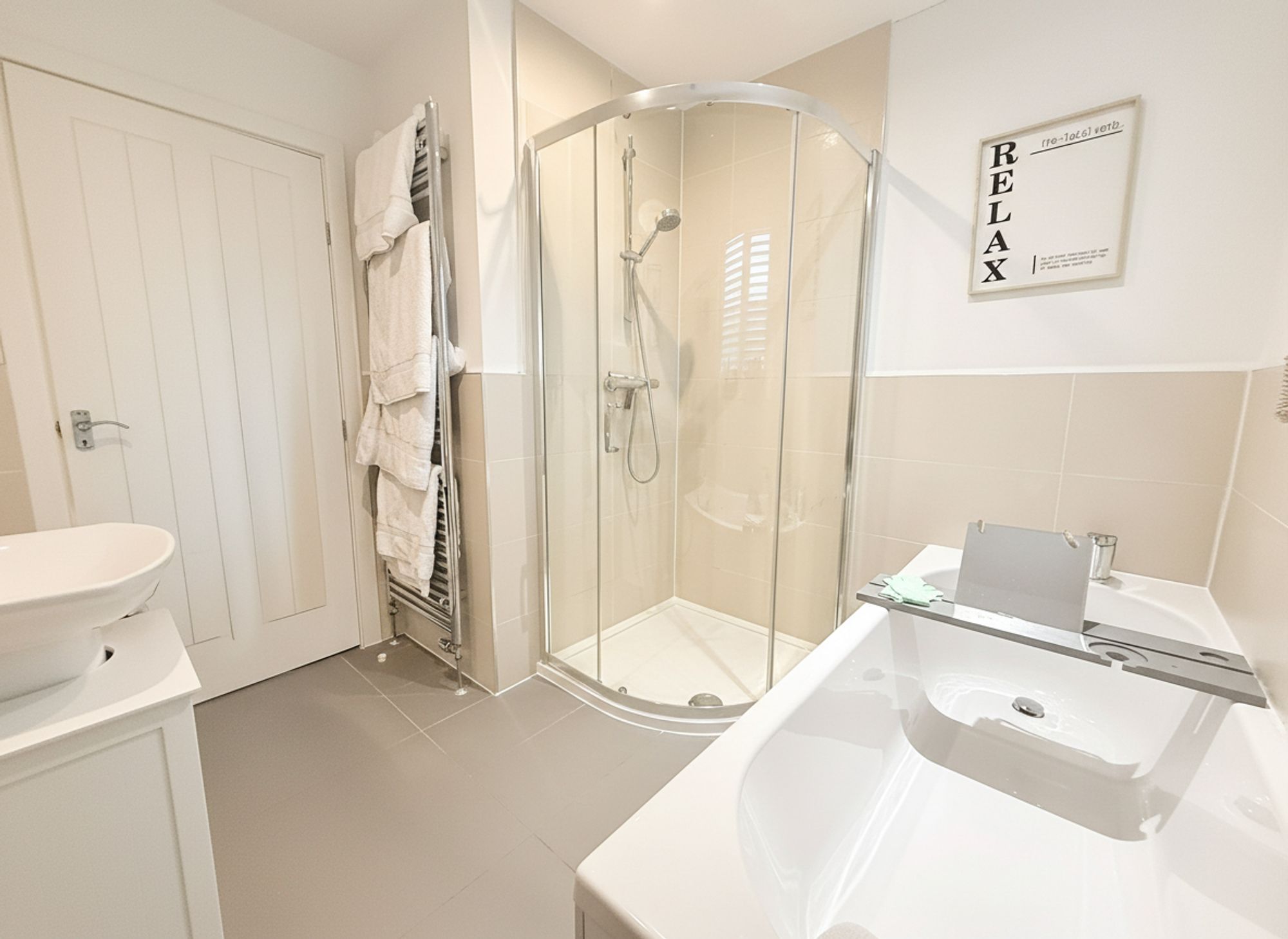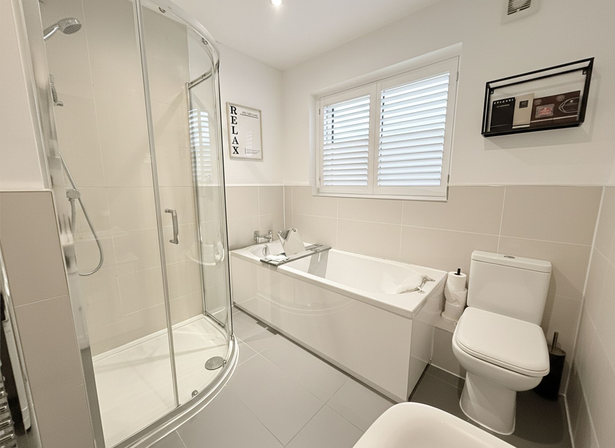 A stunning, sleek and modern bathroom finished with neutral tiling to both walls and floors, beautifully complemented by a chrome heated towel rail. The suite comprises a full-sized bath with chrome mixer tap, pedestal wash basin, WC and a shower with handheld attachment. Further benefits include built-in shutter blinds, adding both style and privacy.