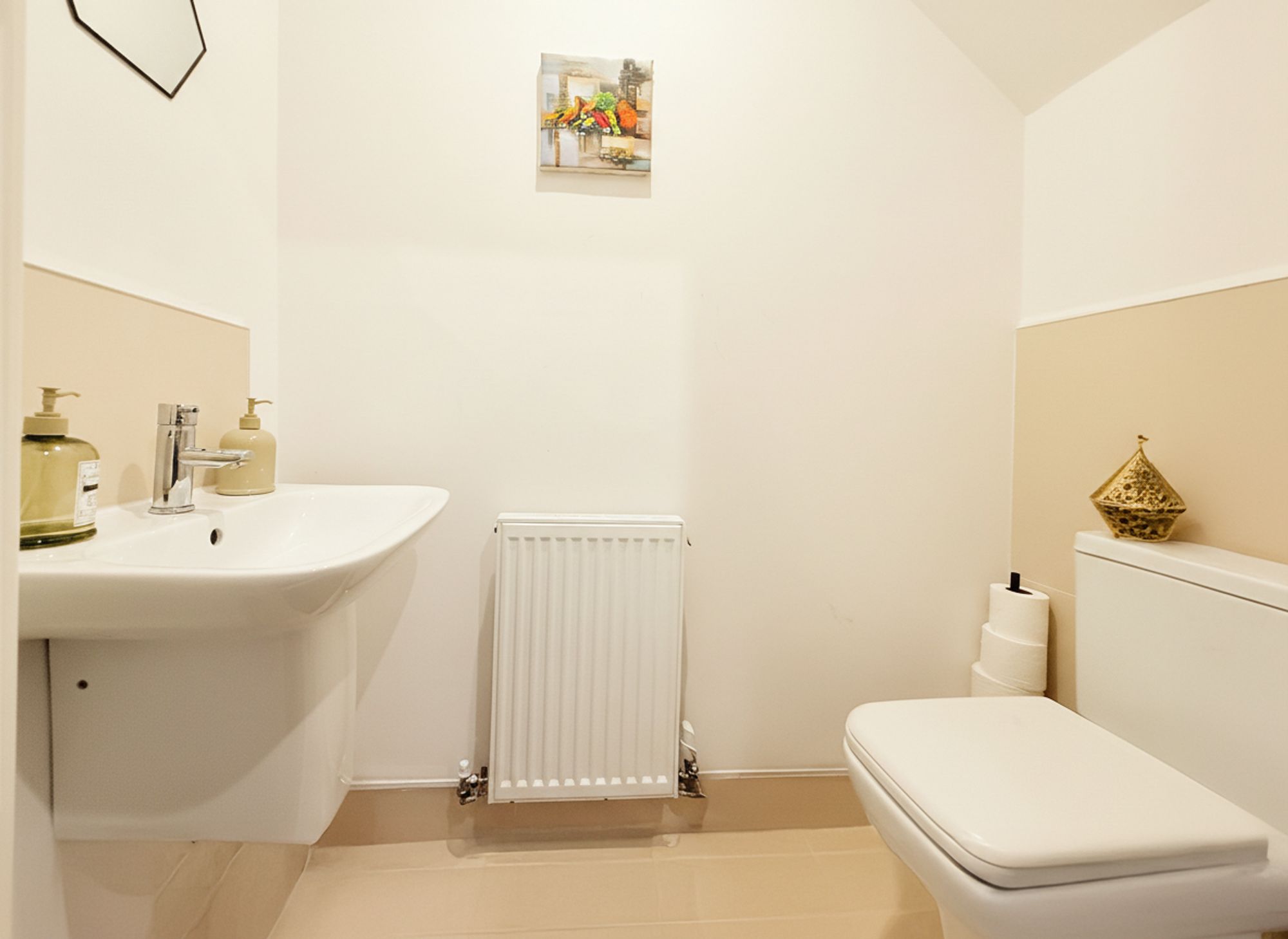A modern and well-presented WC, finished with sleek neutral tiling and fitted with a contemporary WC and floating pedestal wash basin with chrome mixer tap.