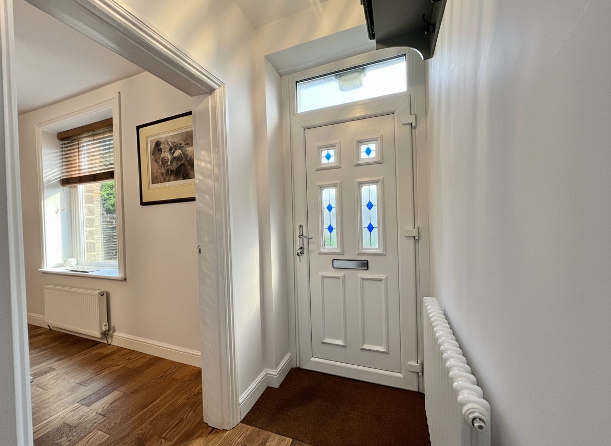 The entrance hallway provides the perfect space to hang outdoor garments before entering the main home. Stairs rise to the first floor and door opens into the lounge.