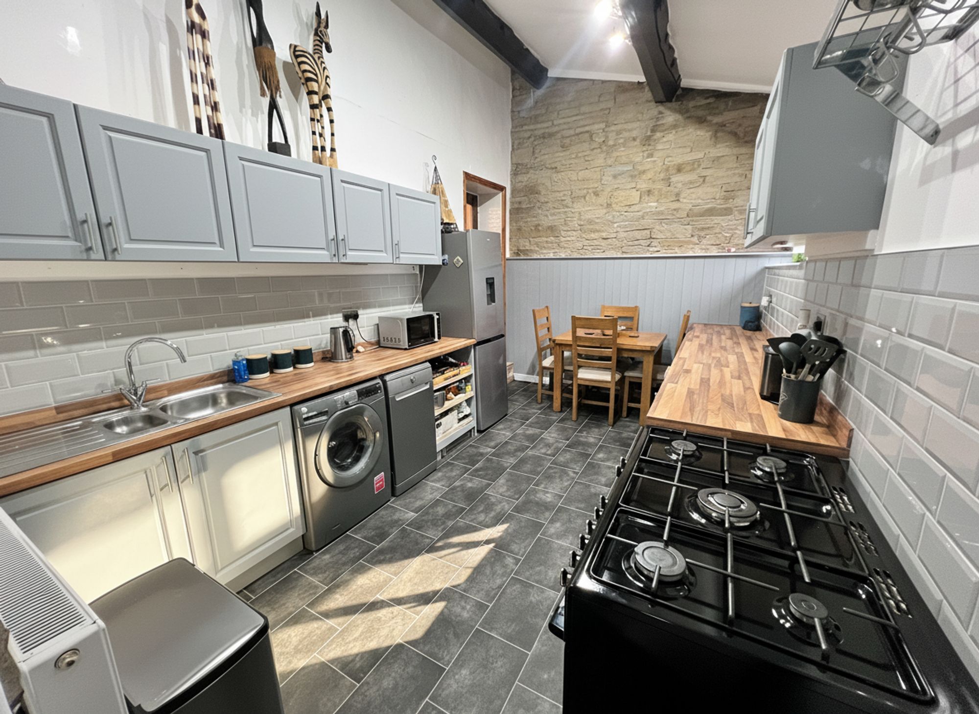 This fantastic kitchen is fitted with a range of modern grey wall and base units, complemented by wood-effect roll-top work surfaces and a contemporary block-style tiled splashback. There is space for a cooker, plumbing for a washing machine and dishwasher, and room for a freestanding fridge and freezer. The room offers ample space for a dining table and chairs, making it ideal for everyday family living and entertaining. Windows to two elevations flood the space with natural light, both framing delightful views and enhancing the overall sense of openness. Exposed stone walls and ceiling beams add wonderful character, while a stable-style door provides direct access to the outside, allowing alfresco dining to flow effortlessly and creating a superb entertaining environment.