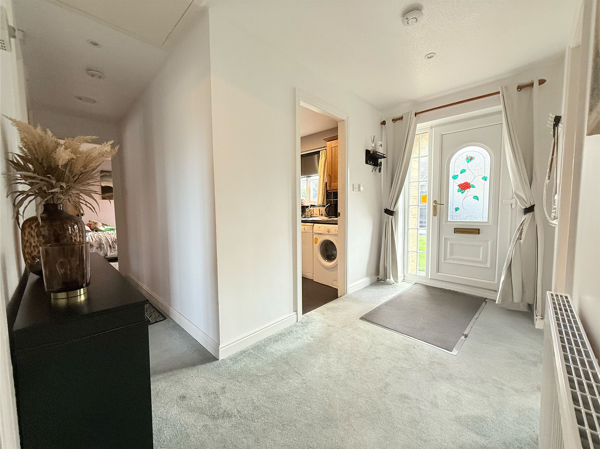 A spacious entrance hallway providing access to Bedroom 3, the kitchen and the living room. Decorated in soft, neutral tones with plush carpeting underfoot, the space feels welcoming from the moment you arrive. There is ample room for coats and shoes, with practical storage options to keep everyday essentials neatly organised, and a storage cupboard houses the fitted control panel for the burglar alarm system.