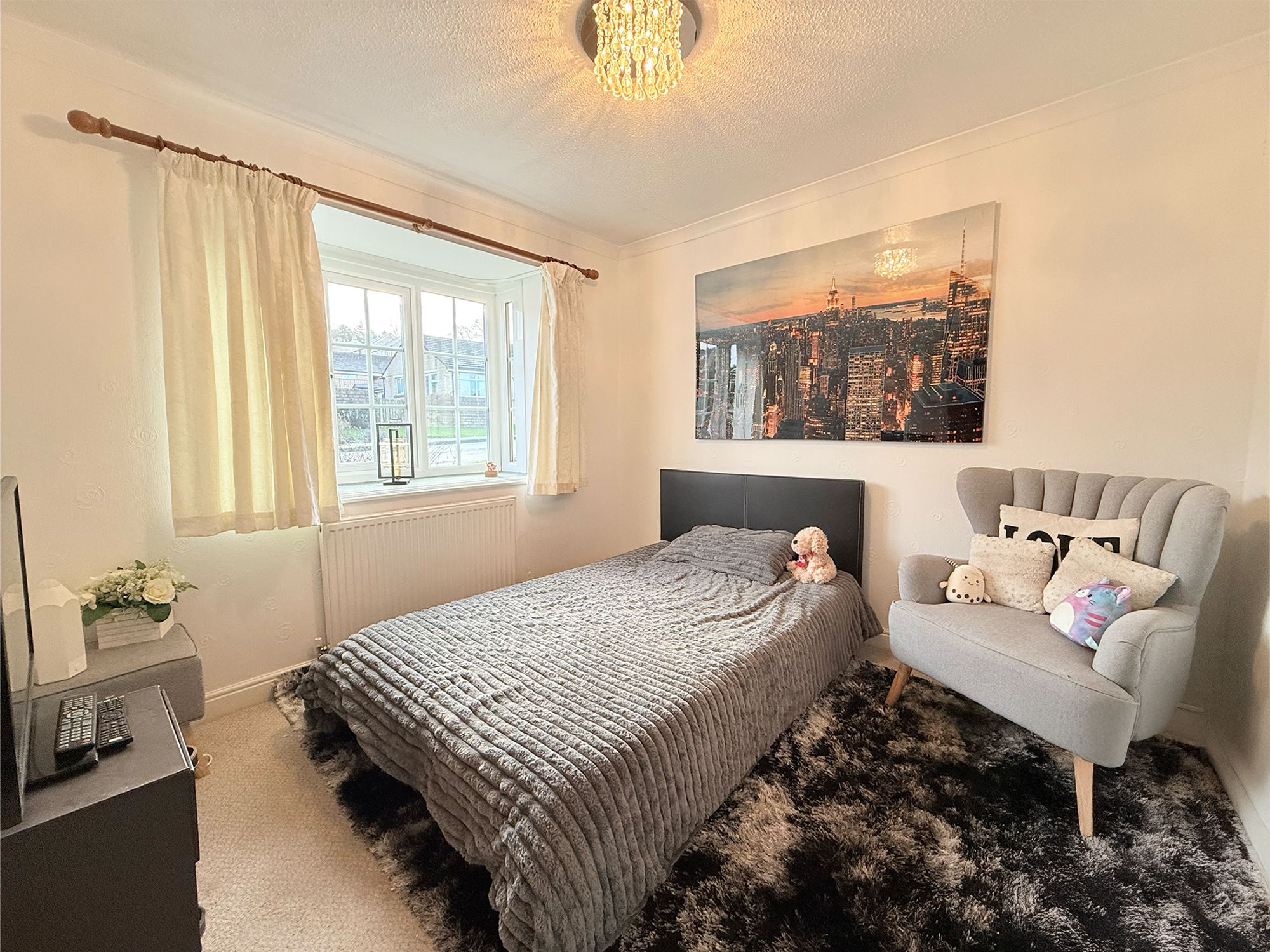 A generously sized principal bedroom sits to the rear of the property, offering attractive views across the garden. Finished in neutral tones with contrasting carpet, the space feels calm, balanced, and easy to style. Newly fitted in 2025, mirrored sliding-door wardrobes provide excellent built-in storage without sacrificing floor area, leaving plenty of room for a super-king bed and additional freestanding furniture.