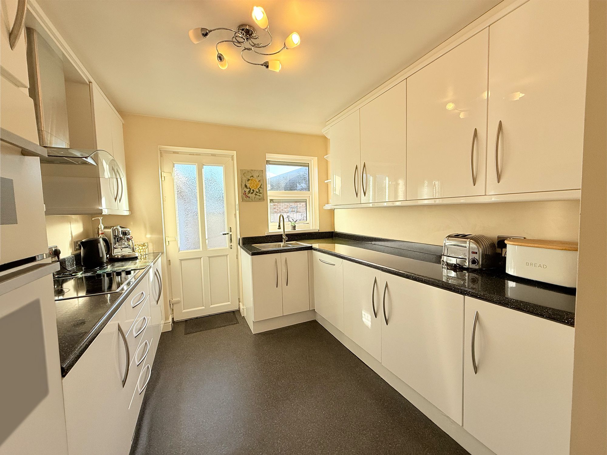 A modern, well-appointed kitchen fitted with sleek high-gloss white cabinetry, contrasting worktops and coordinating laminate flooring. The kitchen comes equipped with an electric oven, four-ring electric hob, integrated dishwasher, under-counter fridge and a chrome sink with mixer tap. An external door to the side of the property adds everyday convenience and easy access outdoors.