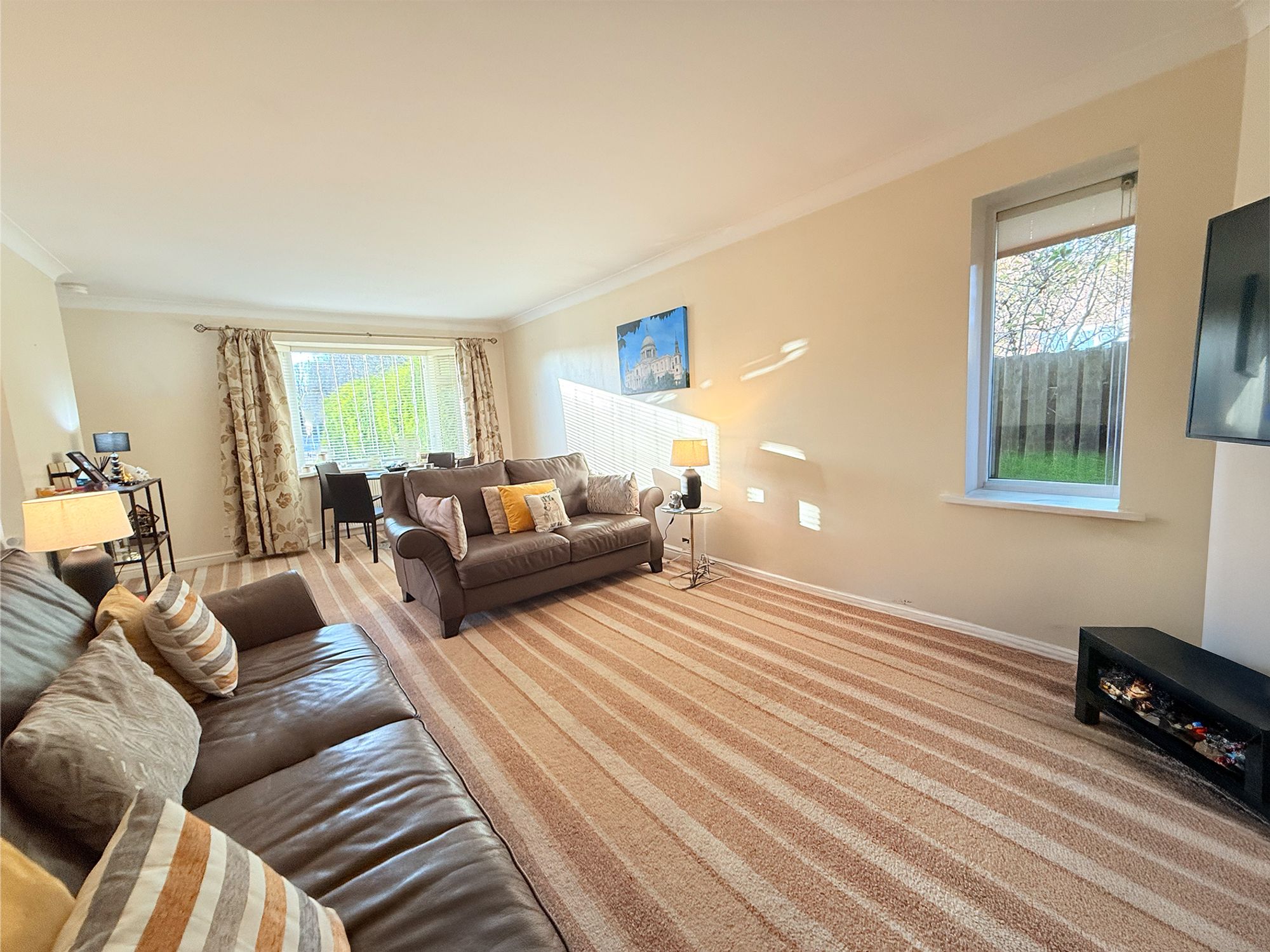 A spacious open-plan living and dining area, attractively decorated in neutral tones and complemented by patterned carpeting. The room is flooded with natural light from dual-aspect windows and a striking large bay window, creating a bright and airy feel throughout the day. There is generous space for a variety of seating layouts as well as a full-sized dining suite, making this the true hub of the home, perfect for relaxing and socialising. The space flows elegantly into the kitchen through an open archway and provides access back to the central hallway.