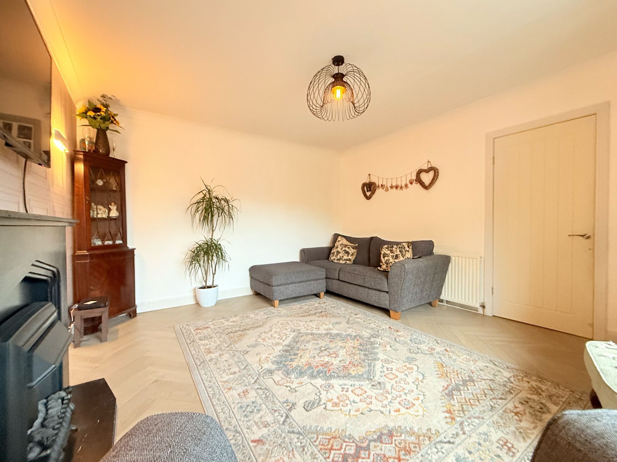 Positioned to the front of the property, this generously sized living room features soft, tasteful décor complemented by a striking feature wallpaper. Herringbone flooring and a coal-effect electric fire create a cosy focal point, while the large bay window fills the room with natural light. There is plenty of space for multiple family seating options.