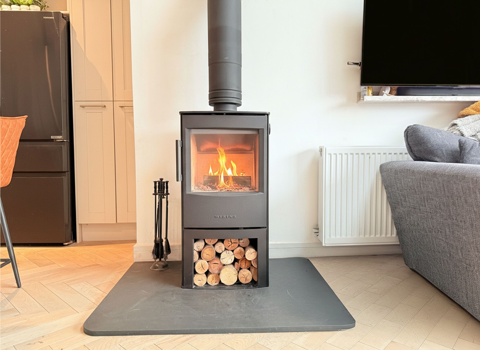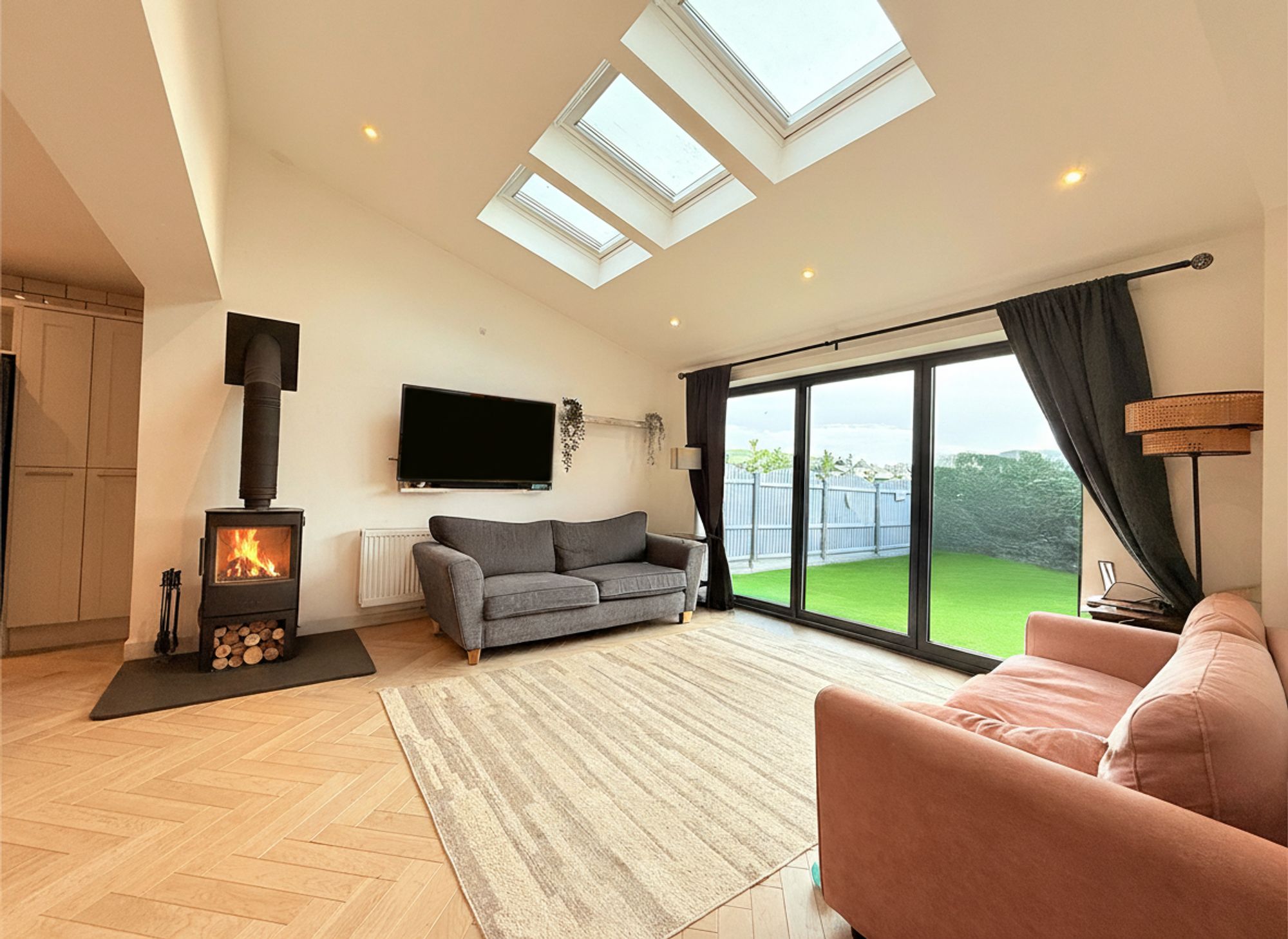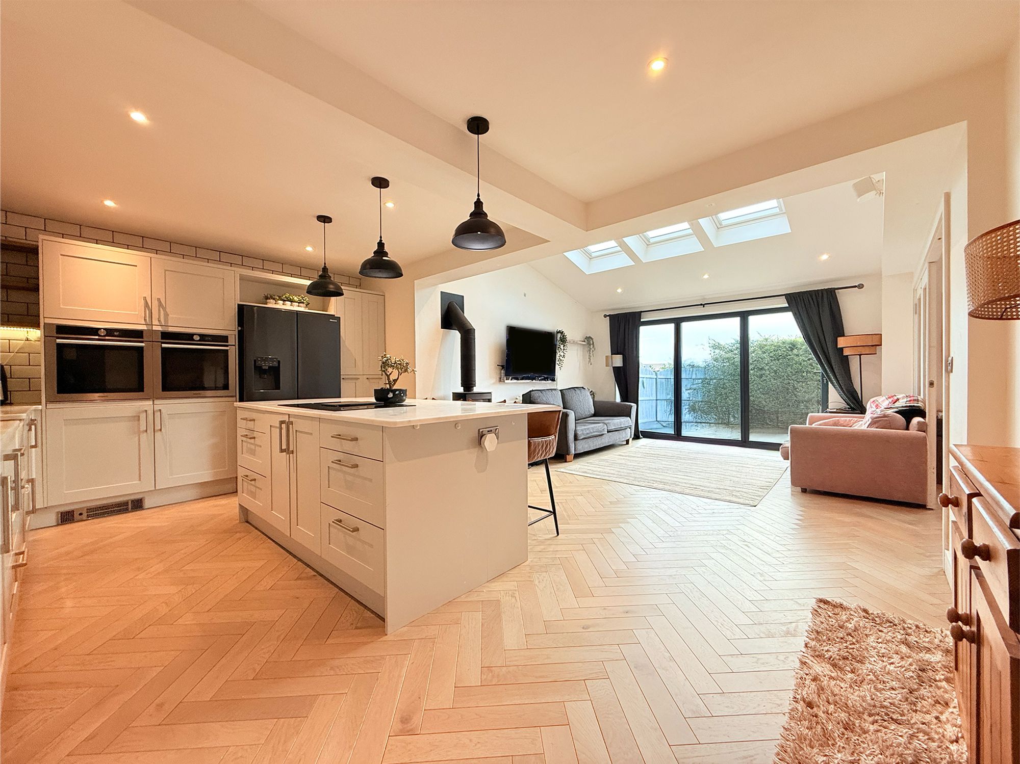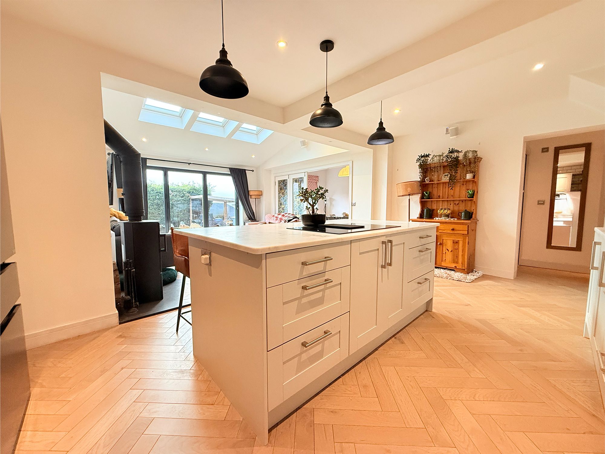 The kitchen seamlessly flows into a versatile living space, creating a light and welcoming area ideal for modern family life. This space is fitted with a multi-fuel wood burner, adding warmth and character, and is flooded with natural light courtesy of Velux windows with built in blinds and bi-folding doors that open directly onto the rear garden. Highly flexible in its use, the room is currently arranged as a living area but would equally suit a dining room, with ample space for a full dining suite or a variety of family seating arrangements. From here, there is access to the dining room, ground floor bathroom, and office, making it a practical and well-connected part of the home.