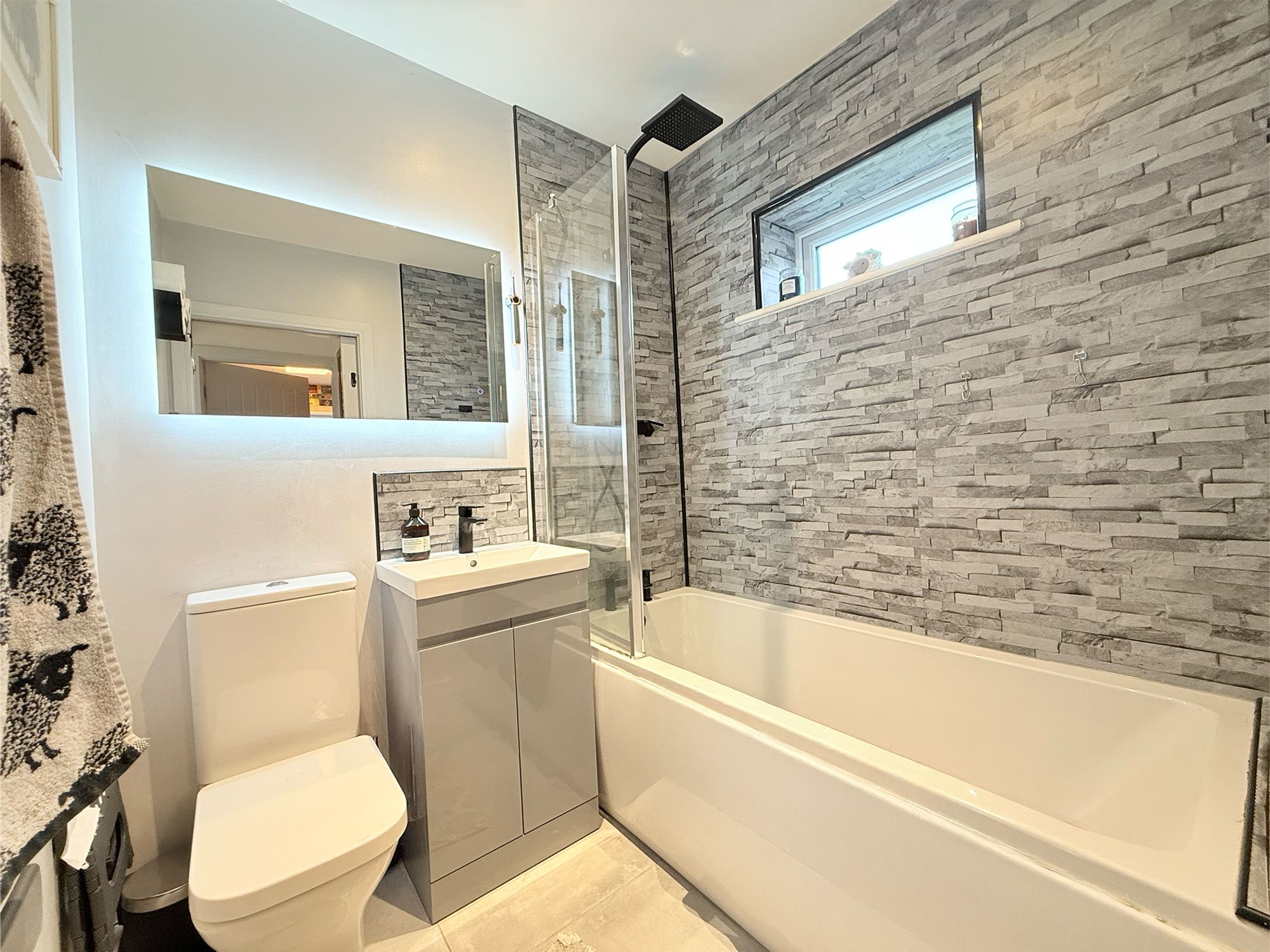Located on the ground floor, this sleek and modern bathroom is fitted with a full-sized bath featuring a matt black mixer tap and shower, complete with both a rainfall shower head and a handheld attachment. The room also includes a contemporary vanity sink with storage below, a WC, and a stylish LED back-lit mirror. Finished with neutral tiling and complemented by a matt grey heated towel rail, this is a practical and well-presented bathroom.