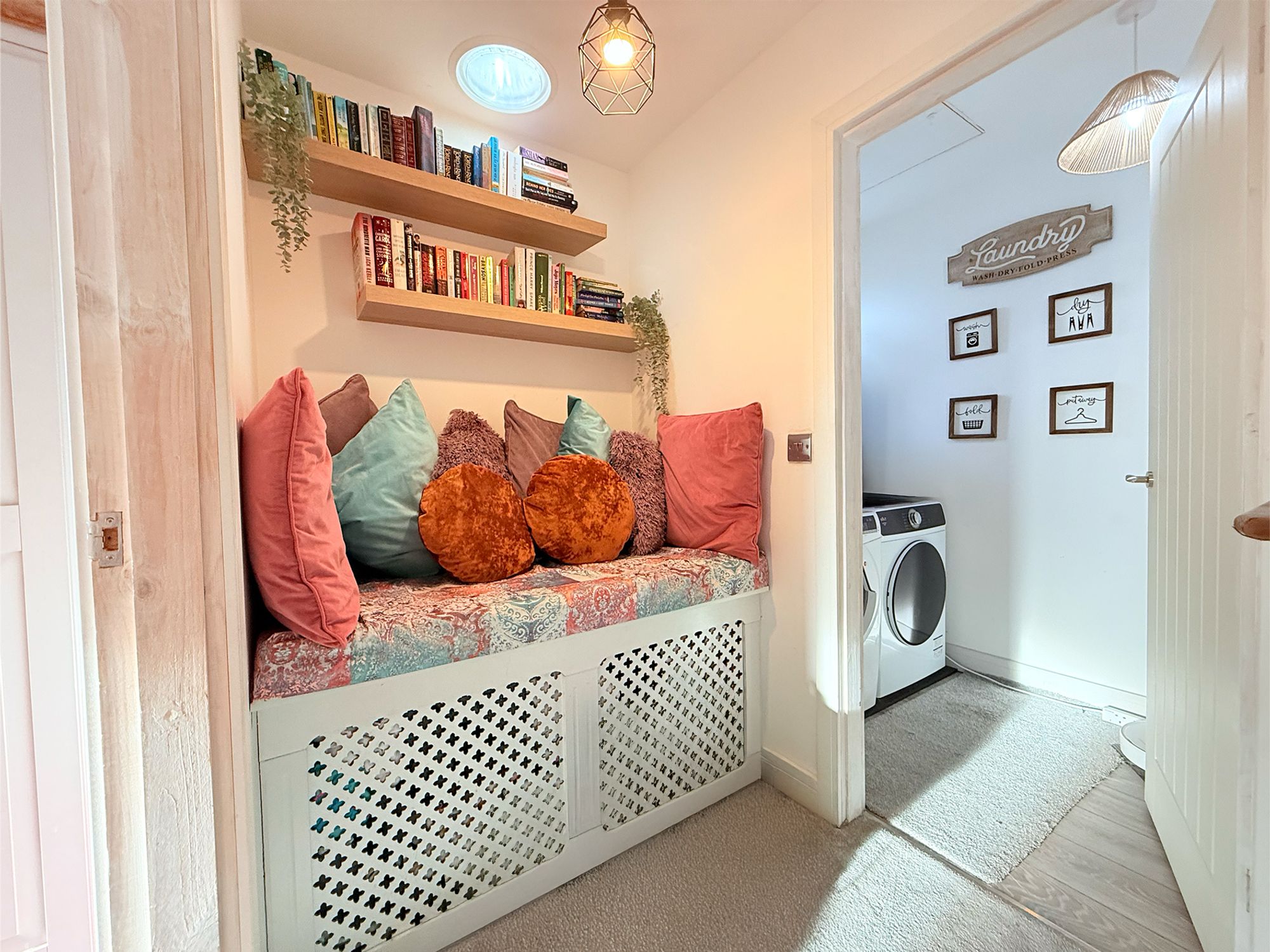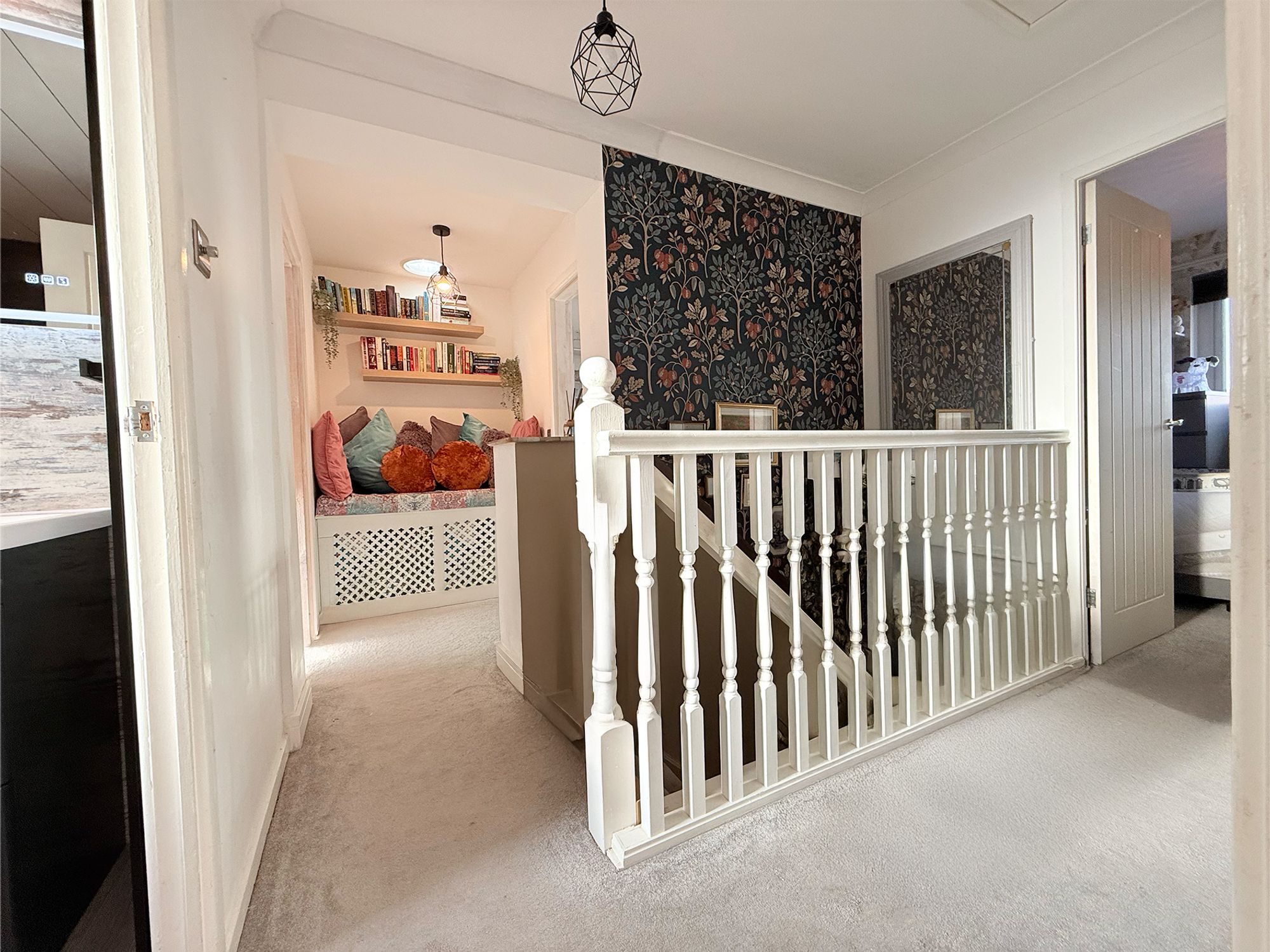 A bright and airy landing providing access to all bedrooms, the family bathroom, and the laundry room. This welcoming space also benefits from a built-in book library, adding character and practicality. Further access is provided to a fully boarded loft, offering excellent additional storage.