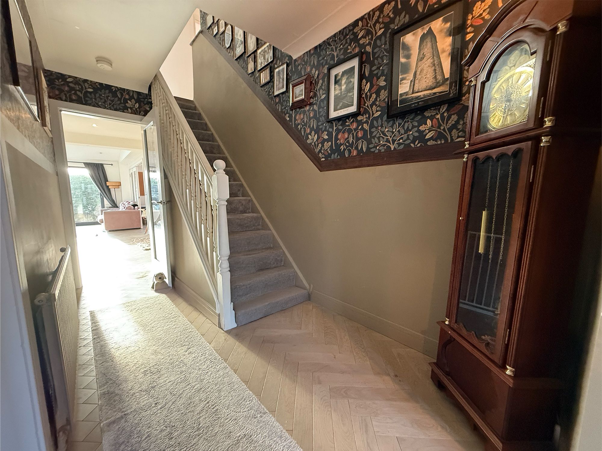 An exceptionally spacious entrance hall, finished in striking tones with stylish wallpapered accents. This welcoming space offers ample room for shoe and coat storage and provides access to the first floor, living room, and open-plan kitchen diner.