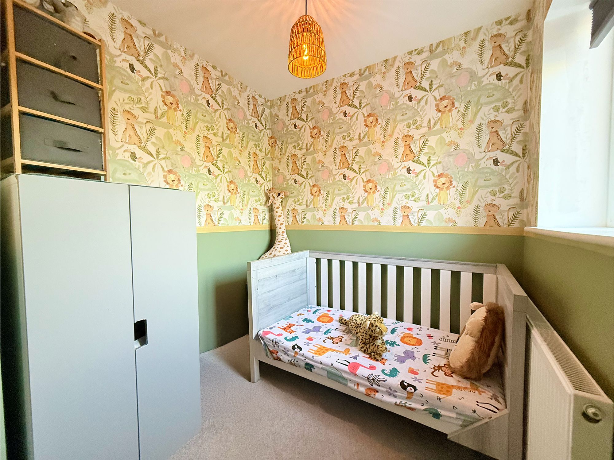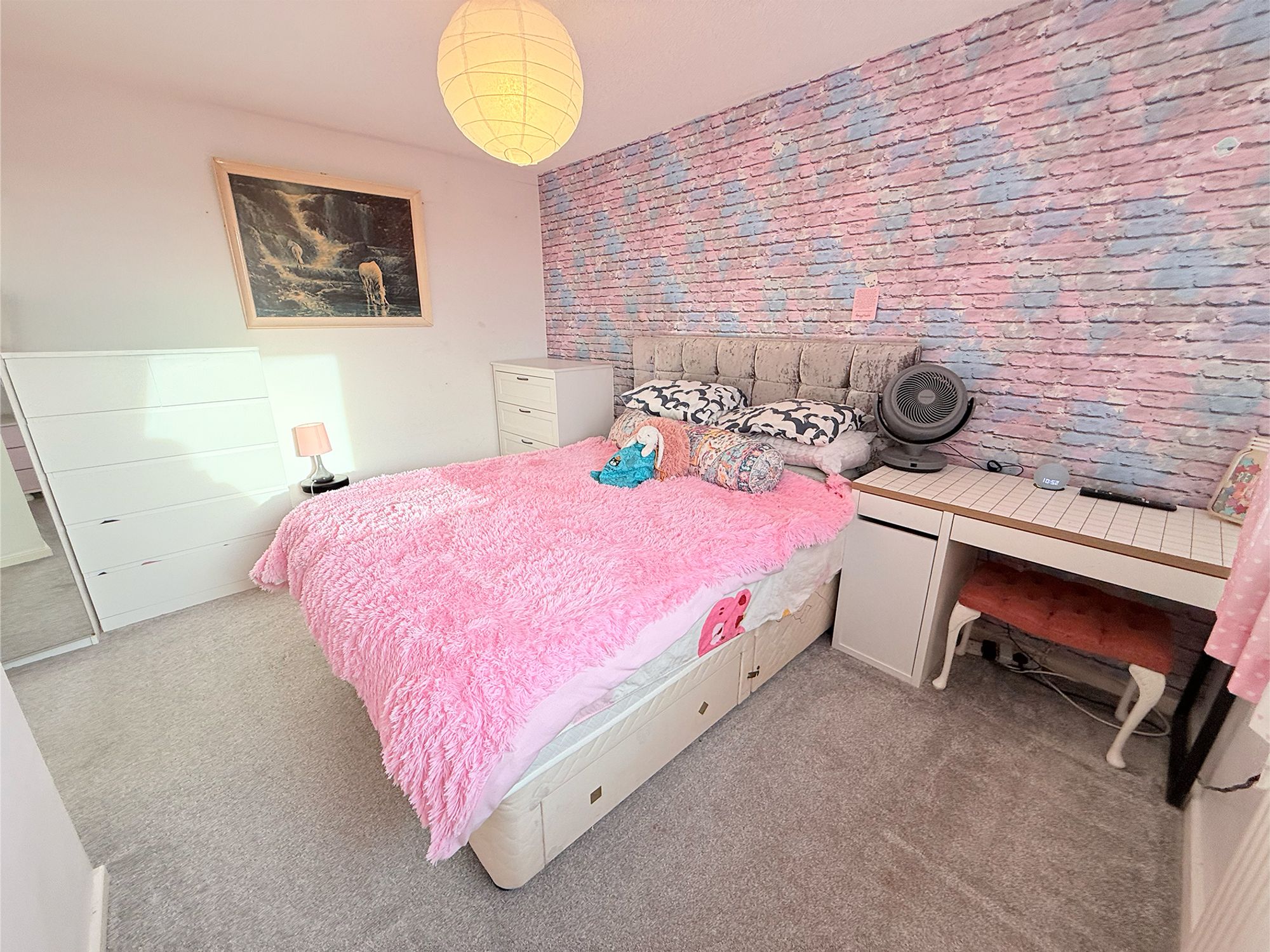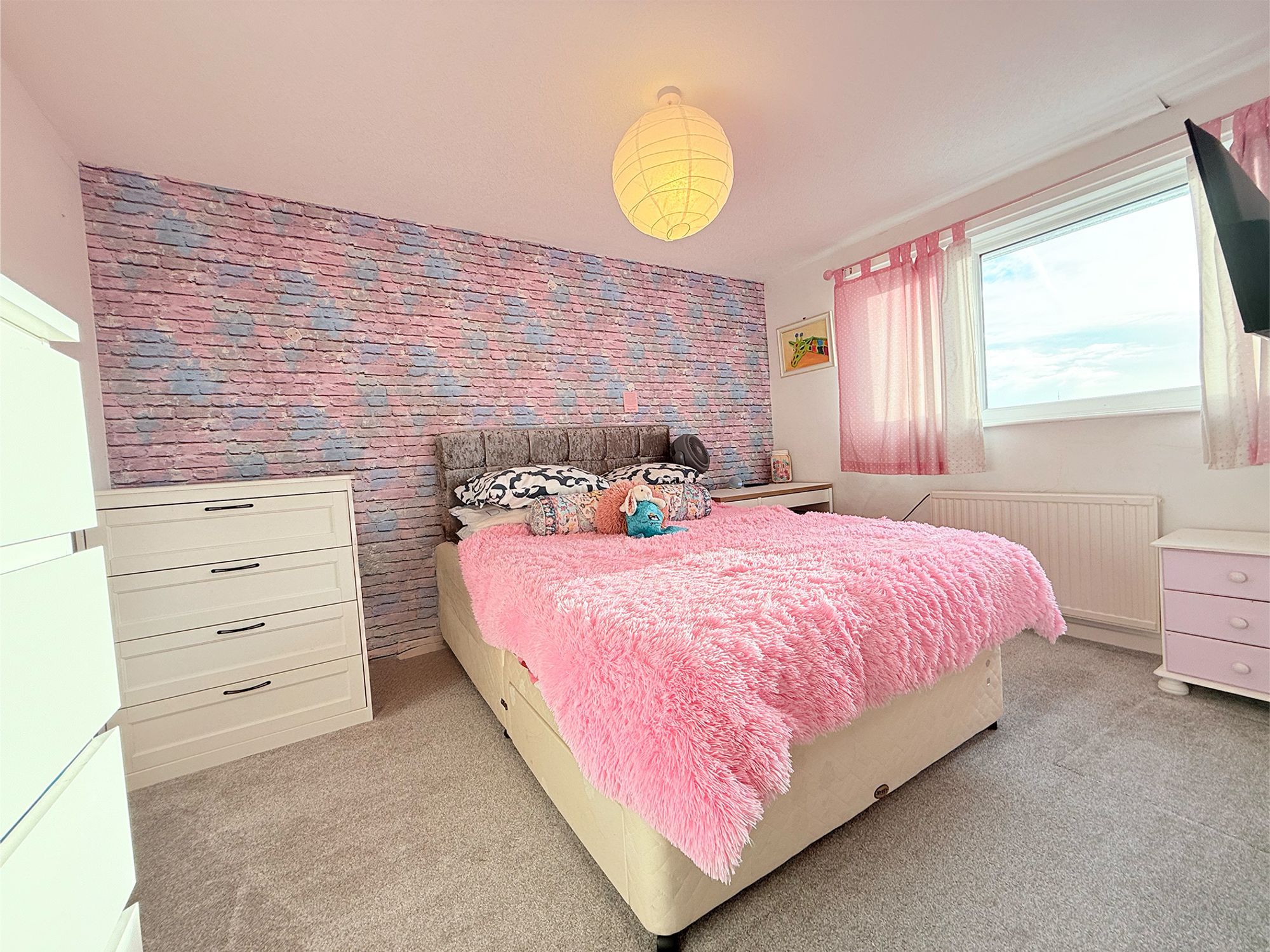 Located at the front of the property, a further double bedroom benefits from dual-aspect windows, allowing plenty of natural light to flow through. Decorated in soft tones with wallpapered accent walls, the room offers ample space for a double bed and freestanding furniture, making it a bright and welcoming bedroom.