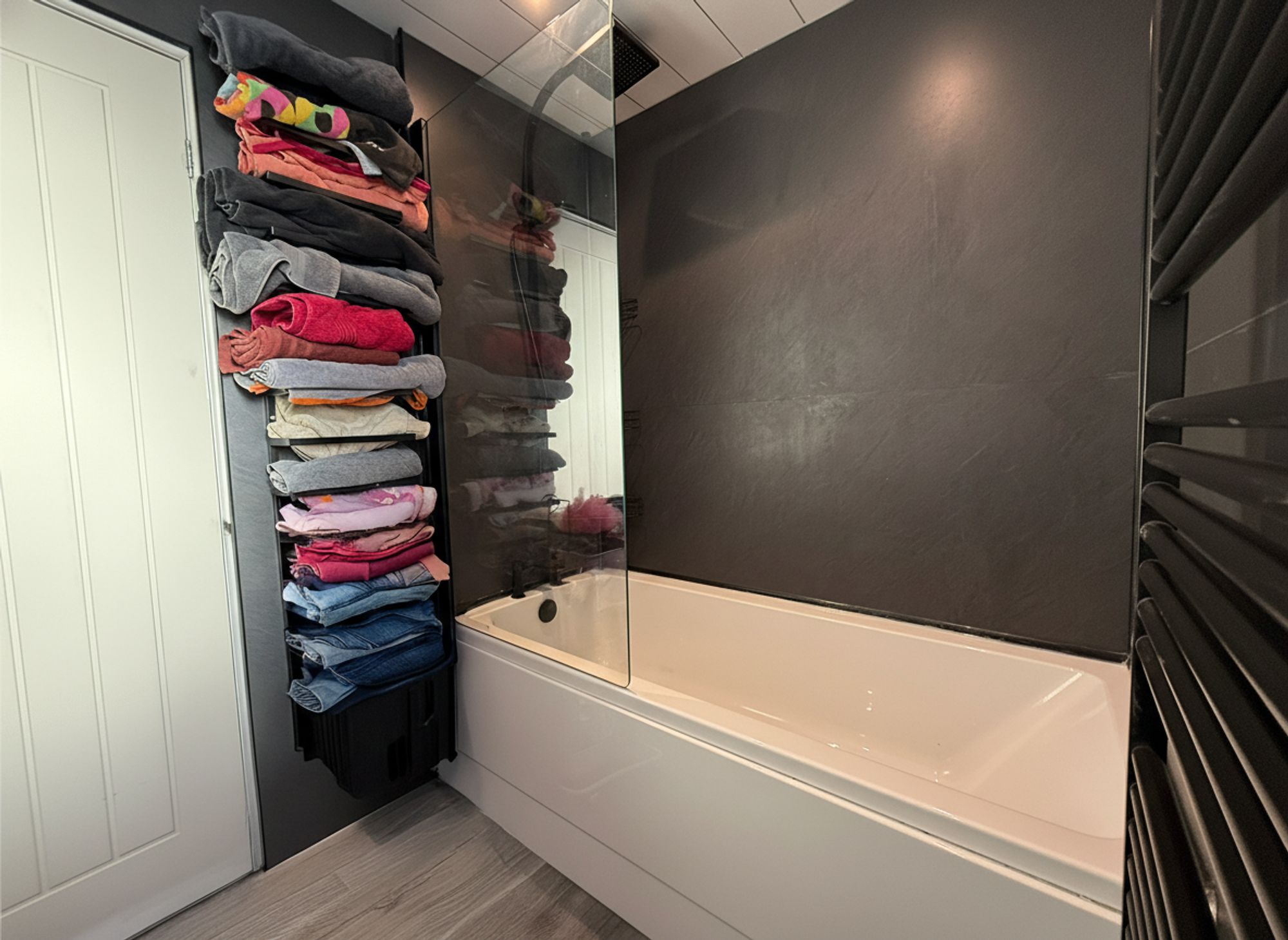 A stylish and modern family bathroom fitted in 2022, finished with wood-effect laminate flooring and slate-effect shower-panelled walls, complemented by an accent wood-effect feature wall. The room is fitted with a full-sized bath incorporating both a rainfall shower head and a handheld shower attachment, along with a WC and a contemporary vanity sink unit with storage below. Further features include a matt black heated towel rail and an LED, heated, Bluetooth mirror, completing this sleek and practical family bathroom.
