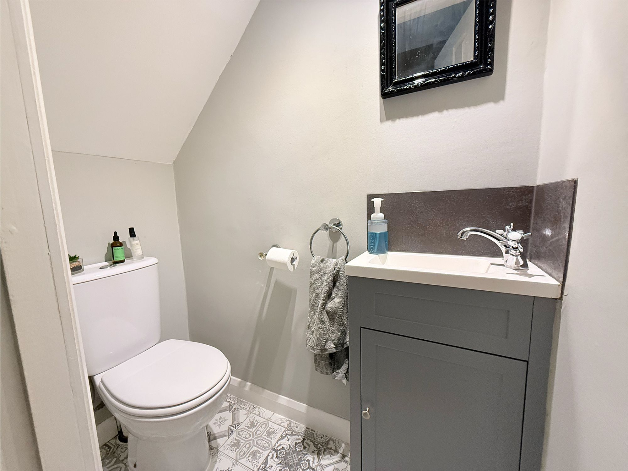 Located beneath the stairs, this modern cloakroom is fitted with a WC and vanity sink unit with chrome mixer tap and storage beneath. Finished with patterned tiled flooring.