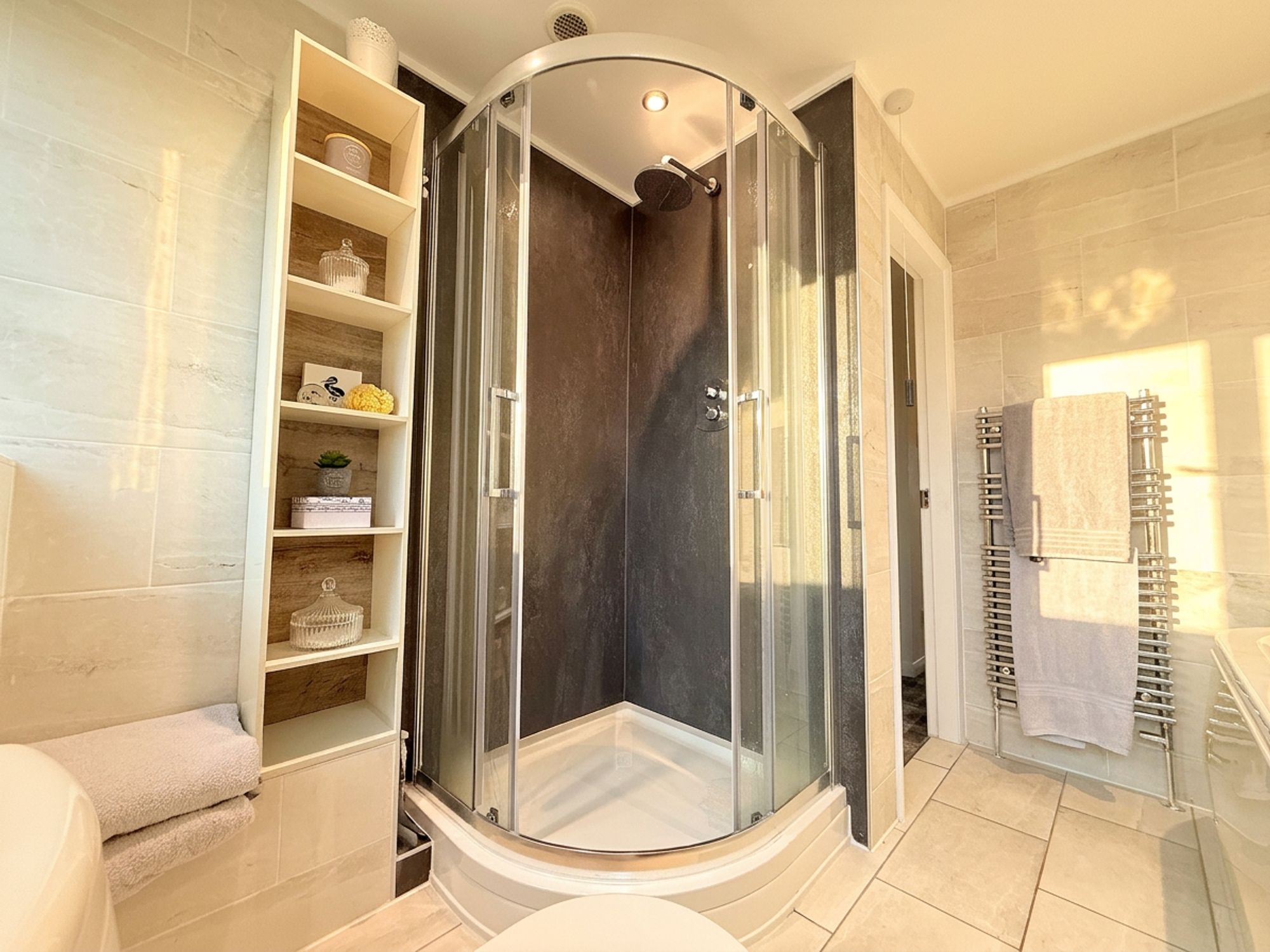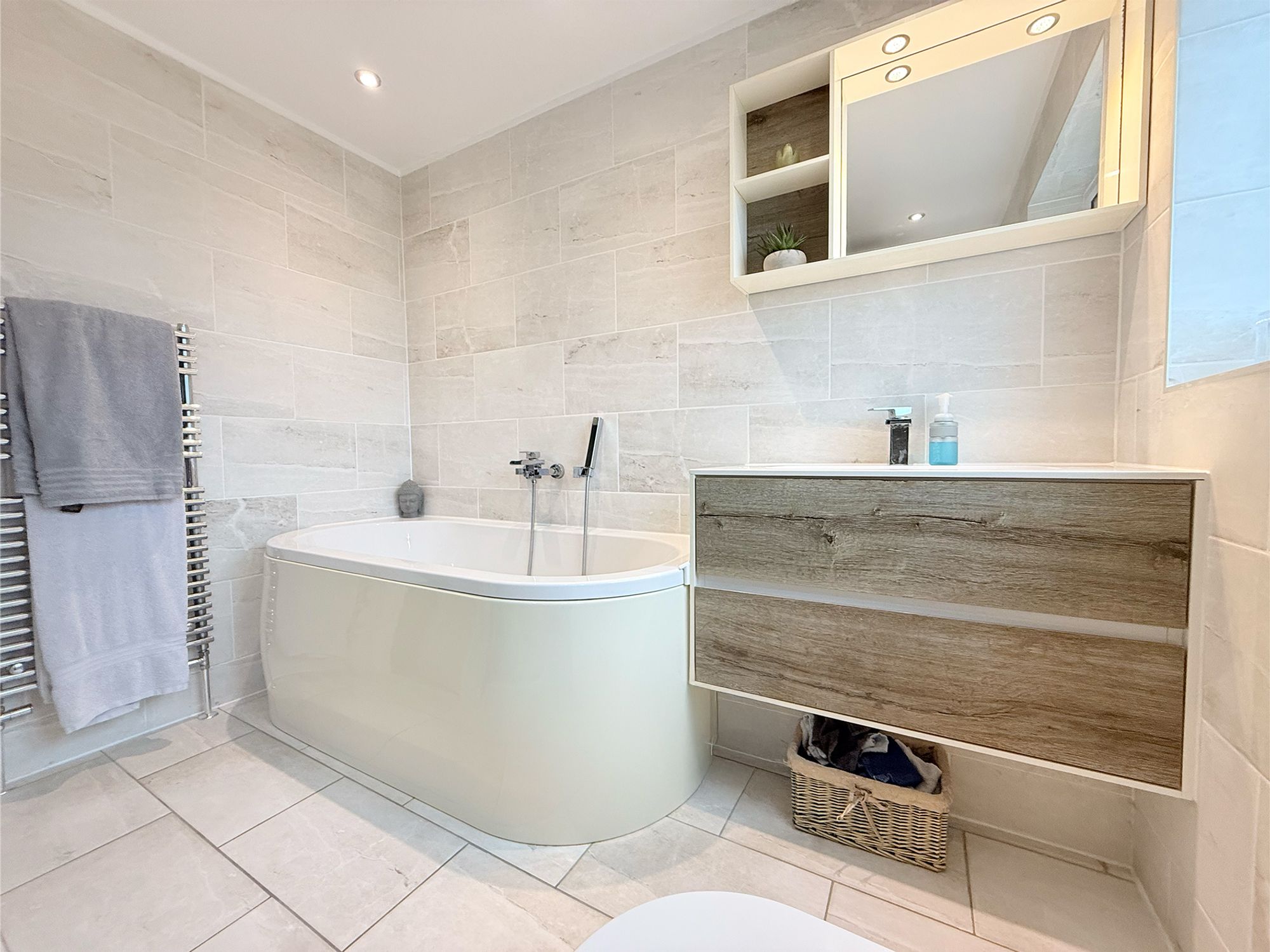 A spacious family bathroom fitted with a full-size bath with chrome mixer tap and handheld shower attachment. Additional features include a walk-in shower with rainfall shower head, WC, and floating vanity sink unit with wood-effect finish and chrome mixer tap. Above the sink is a built-in mirrored cabinet with integrated lighting. The room also benefits from a chrome heated towel rail and is finished with neutral wall and floor tiling, complemented by a striking accent panel within the shower.